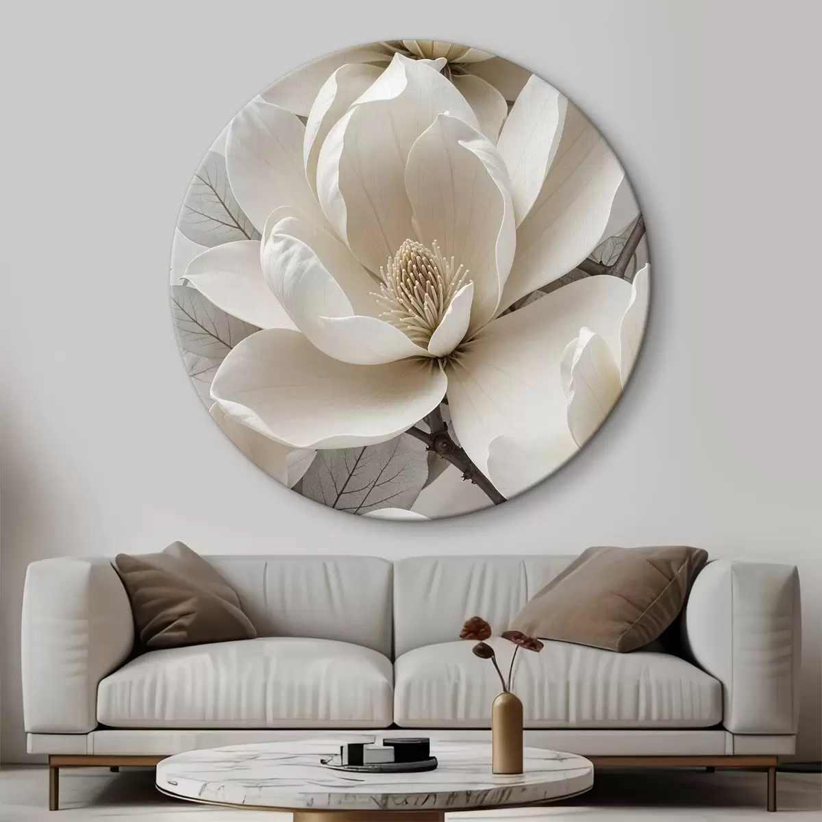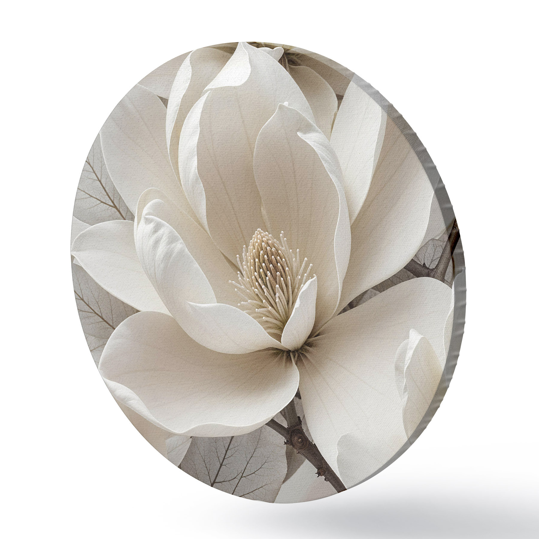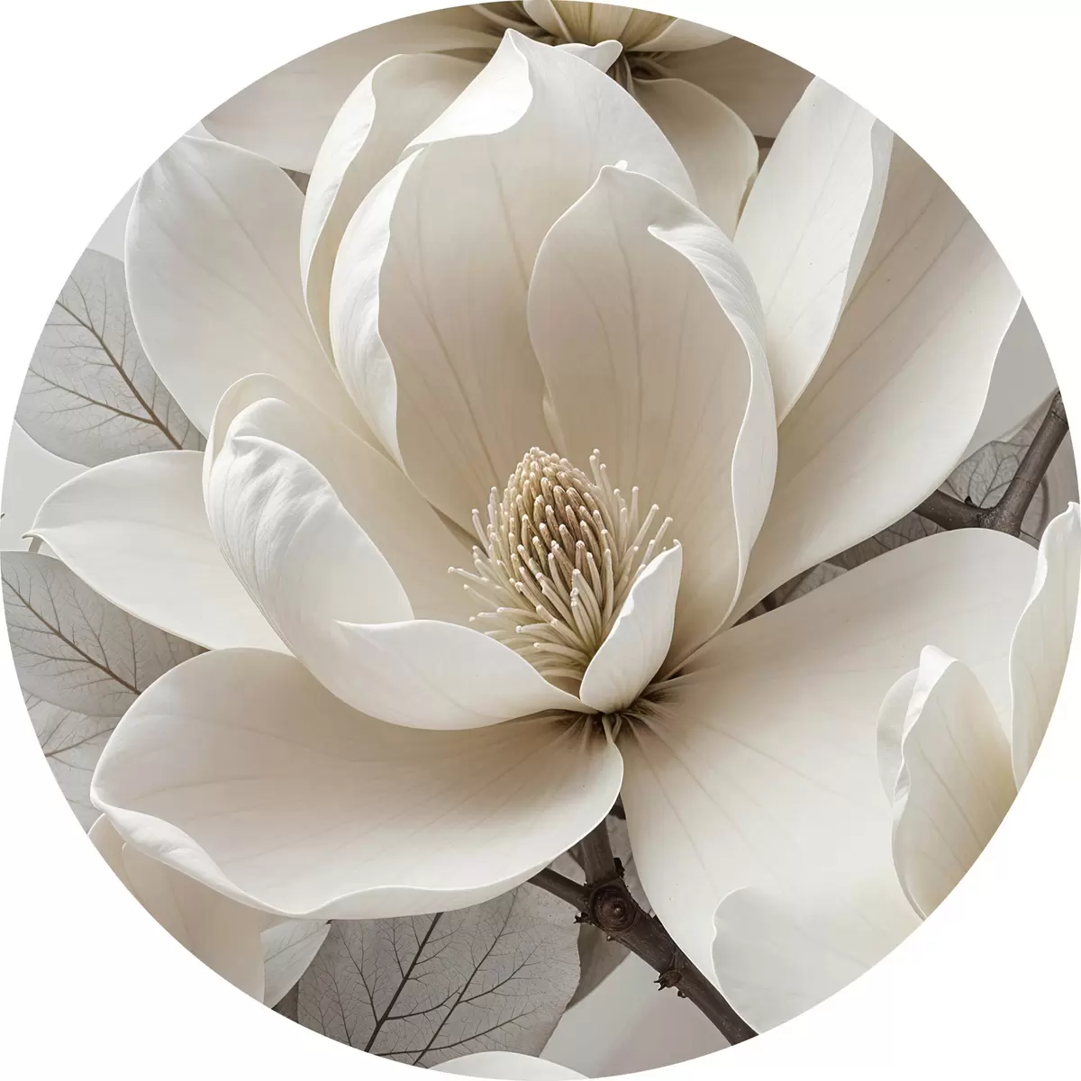 Tableaux ronds Fleur de magnolia blanche aux pétales délicats entourée de feuilles vertes sur fond clair r39527