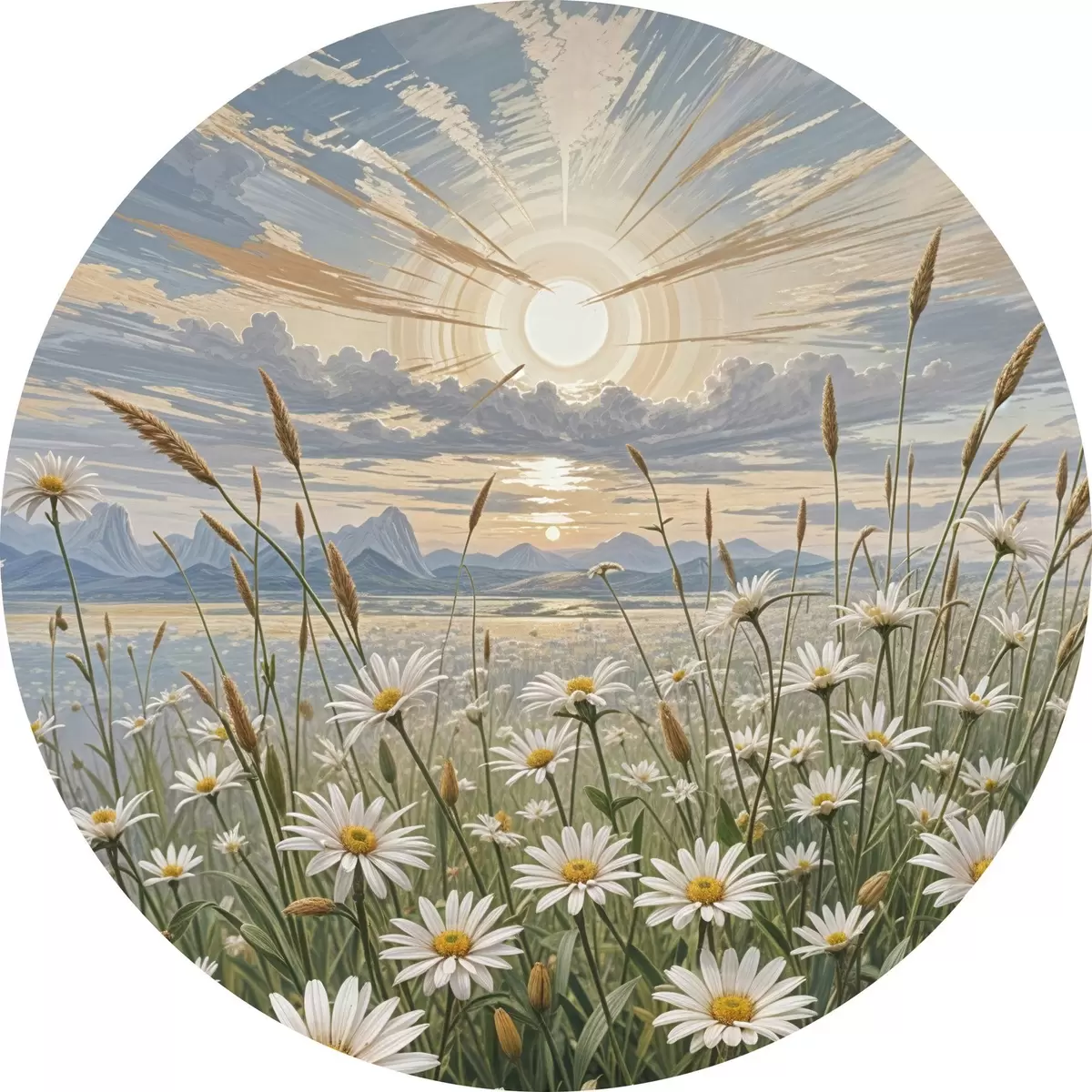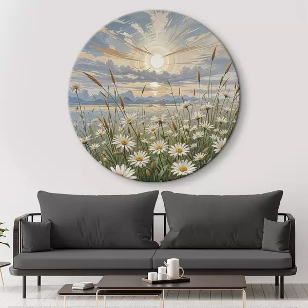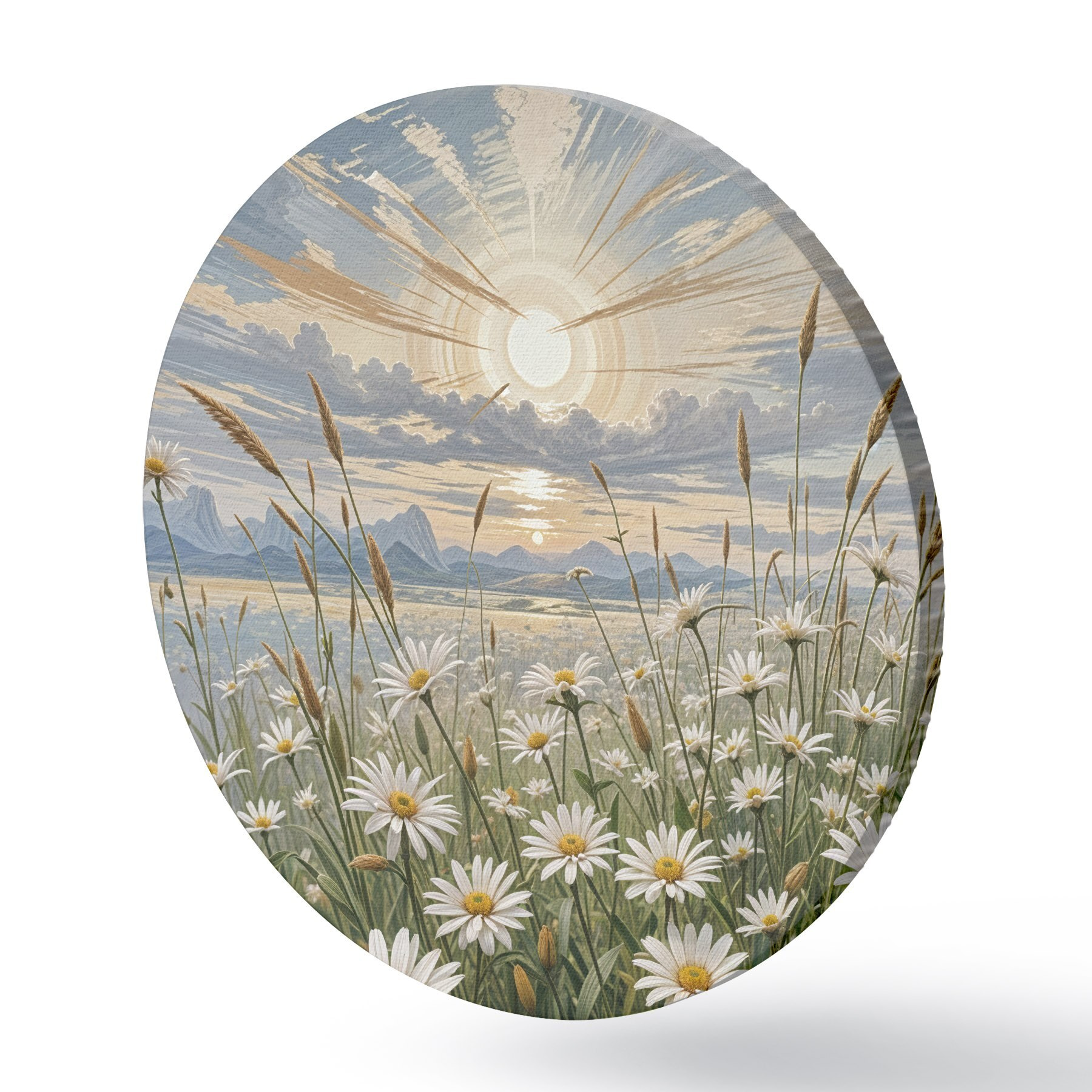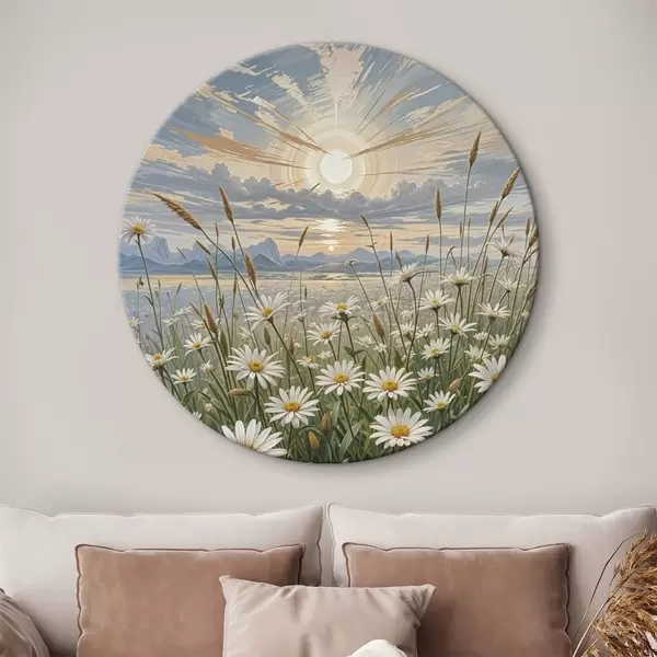 Tableaux ronds Un champ de fleurs de marguerites blanches au premier plan avec un paysage de montagnes et un ciel nuageux r39528