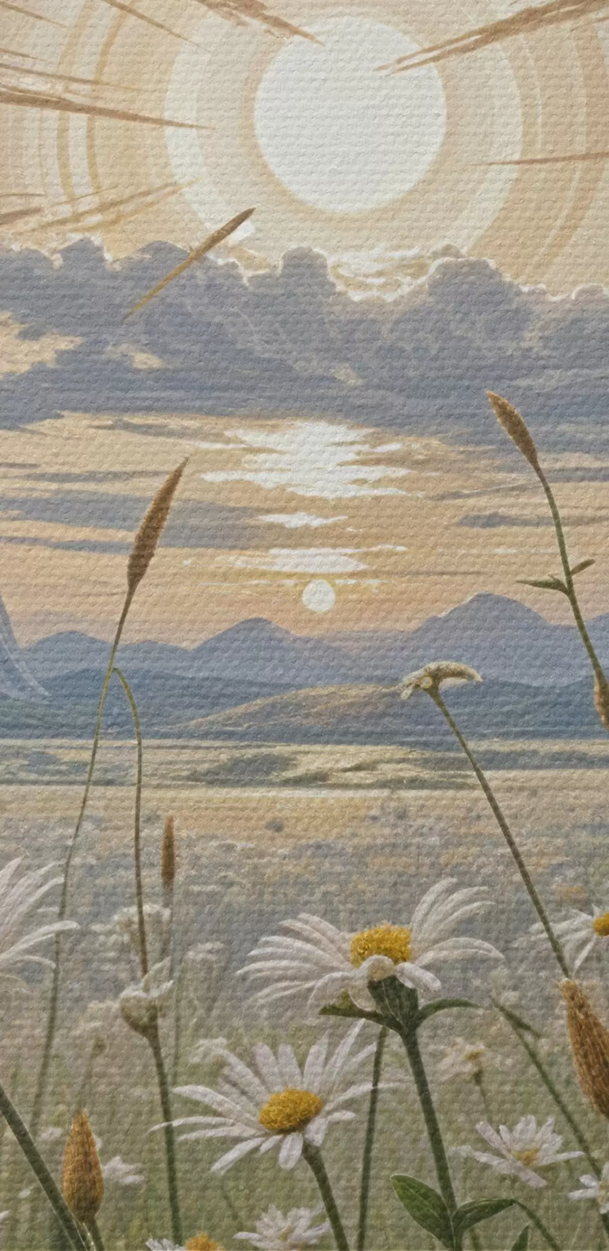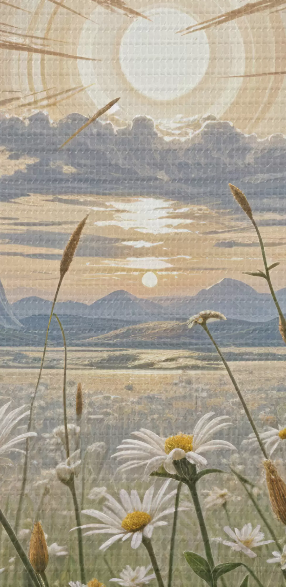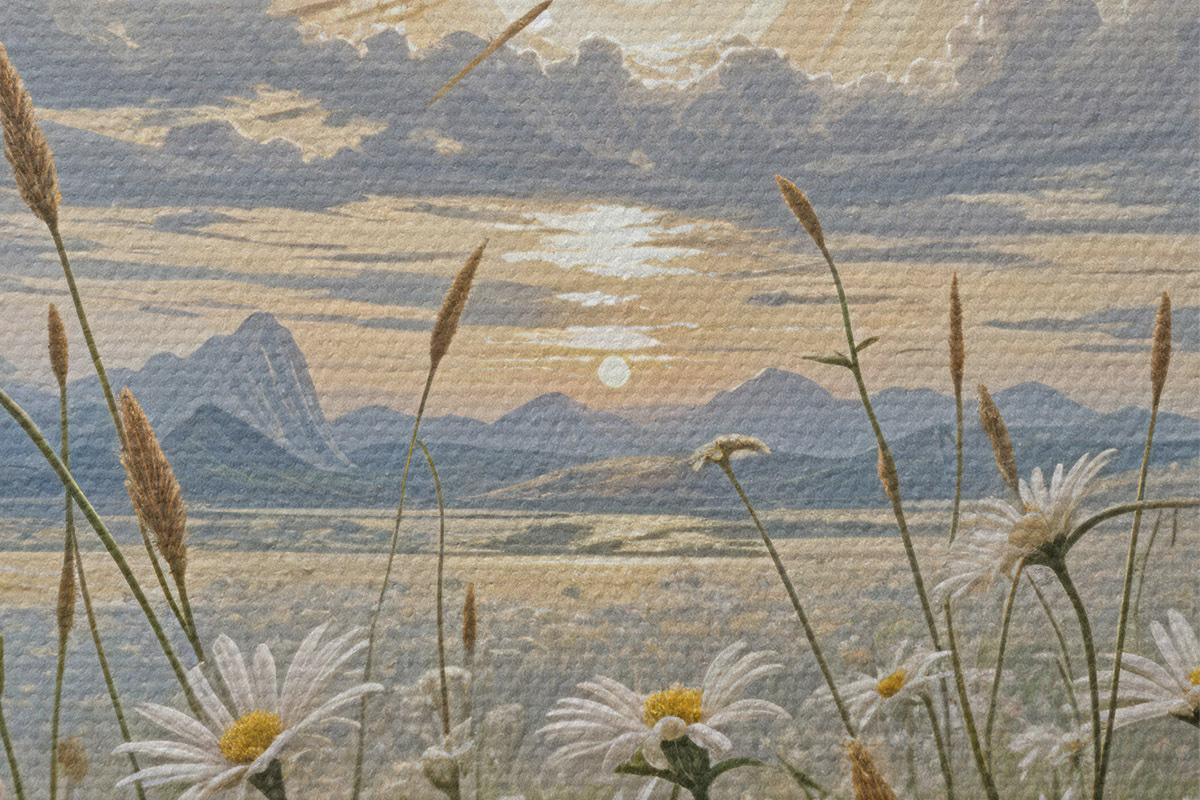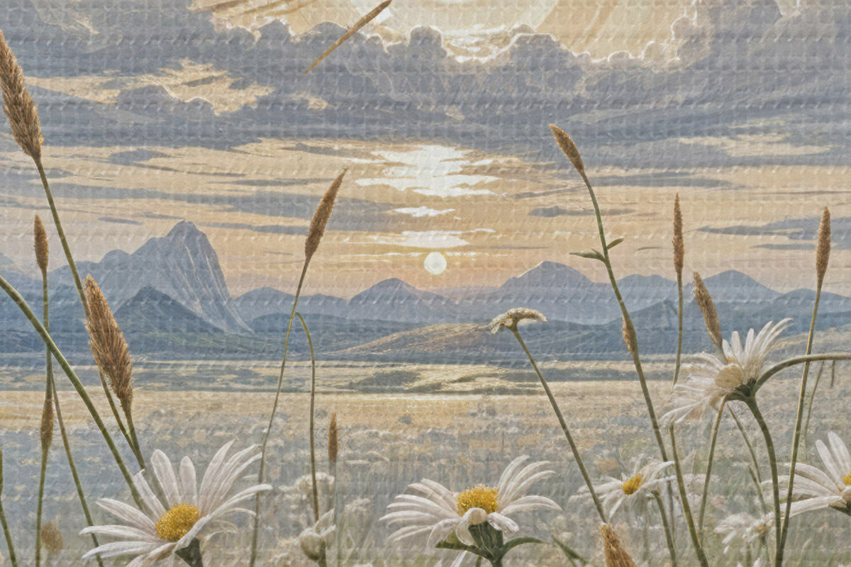 Image Un champ de fleurs de marguerites blanches au premier plan avec un paysage de montagnes et un ciel nuageux Nr r39528