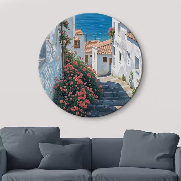 Tableaux ronds Une rue étroite dans une ville côtière, avec des bâtiments blancs, des toits de tuiles rouges et des fleurs roses éclatantes r39532