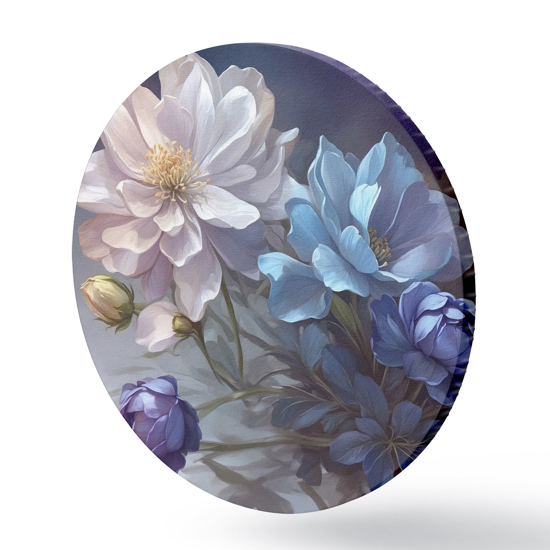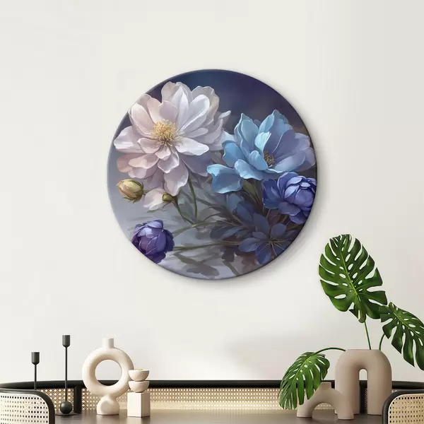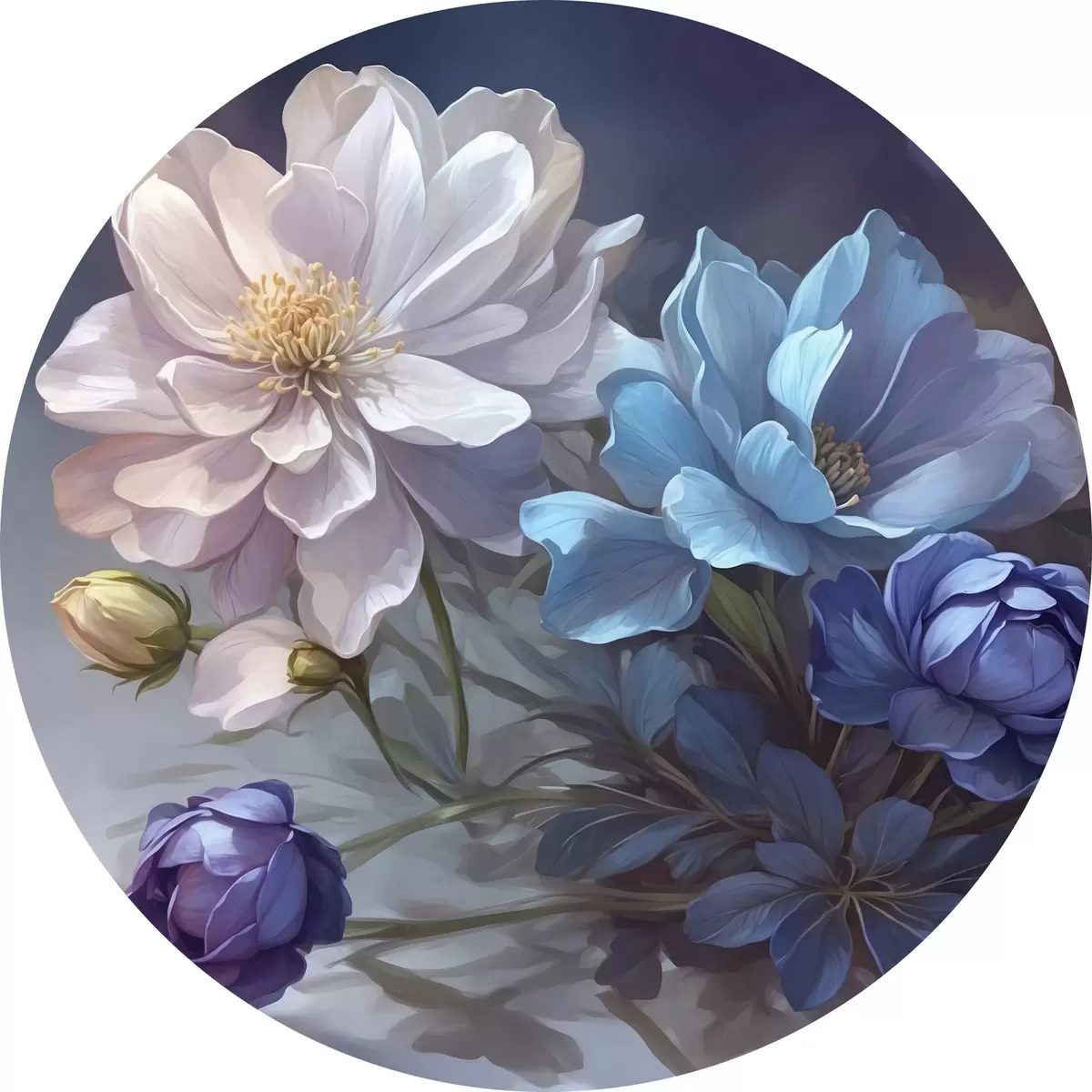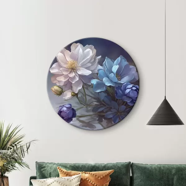 Tableaux ronds Fleurs blanches et bleues sur fond flou r39603