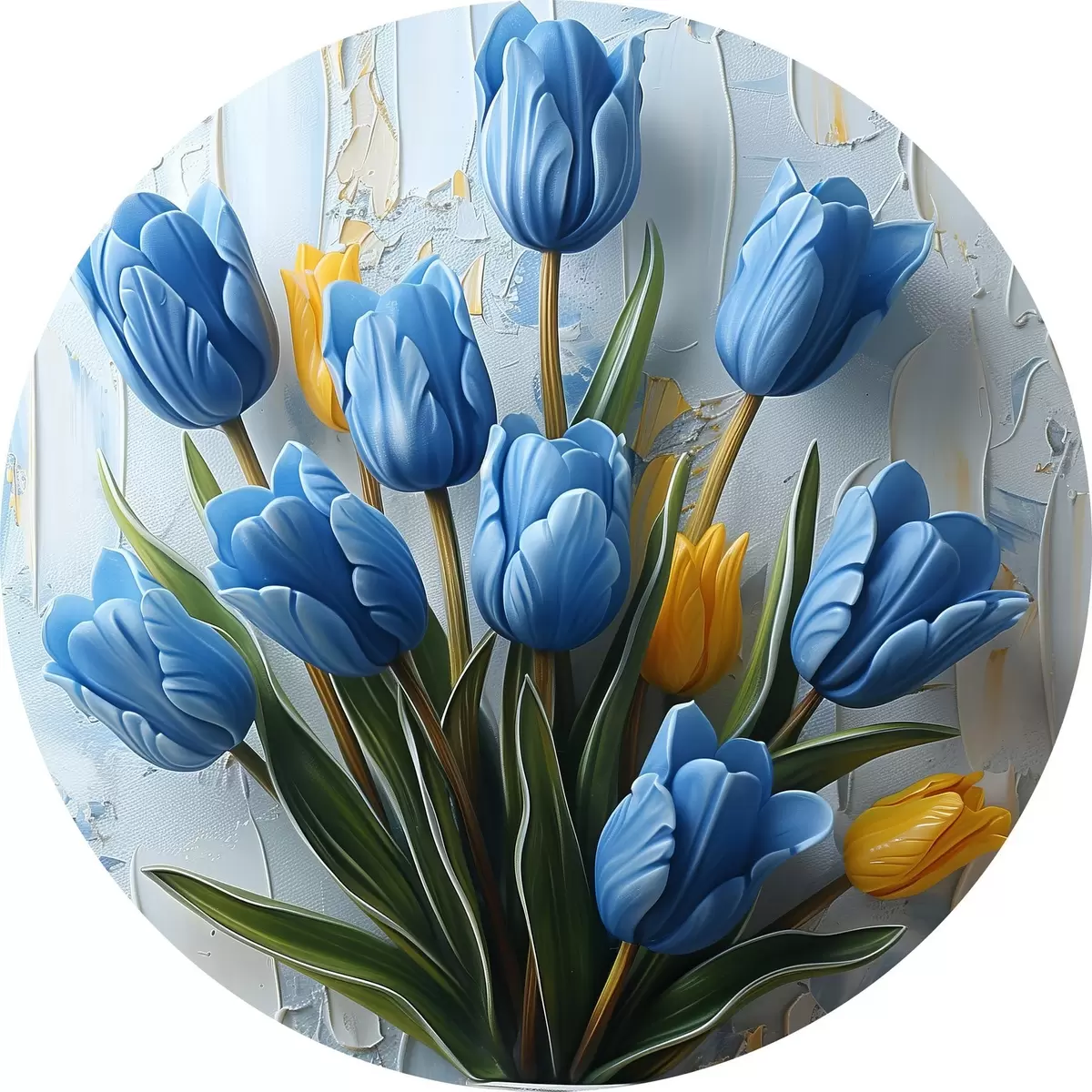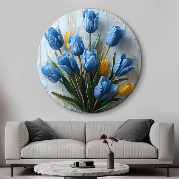 Tableaux ronds Tulipes bleues et jaunes en 3D : élégante peinture murale à l'huile avec fond blanc et bleu clair et vase gravé r39637