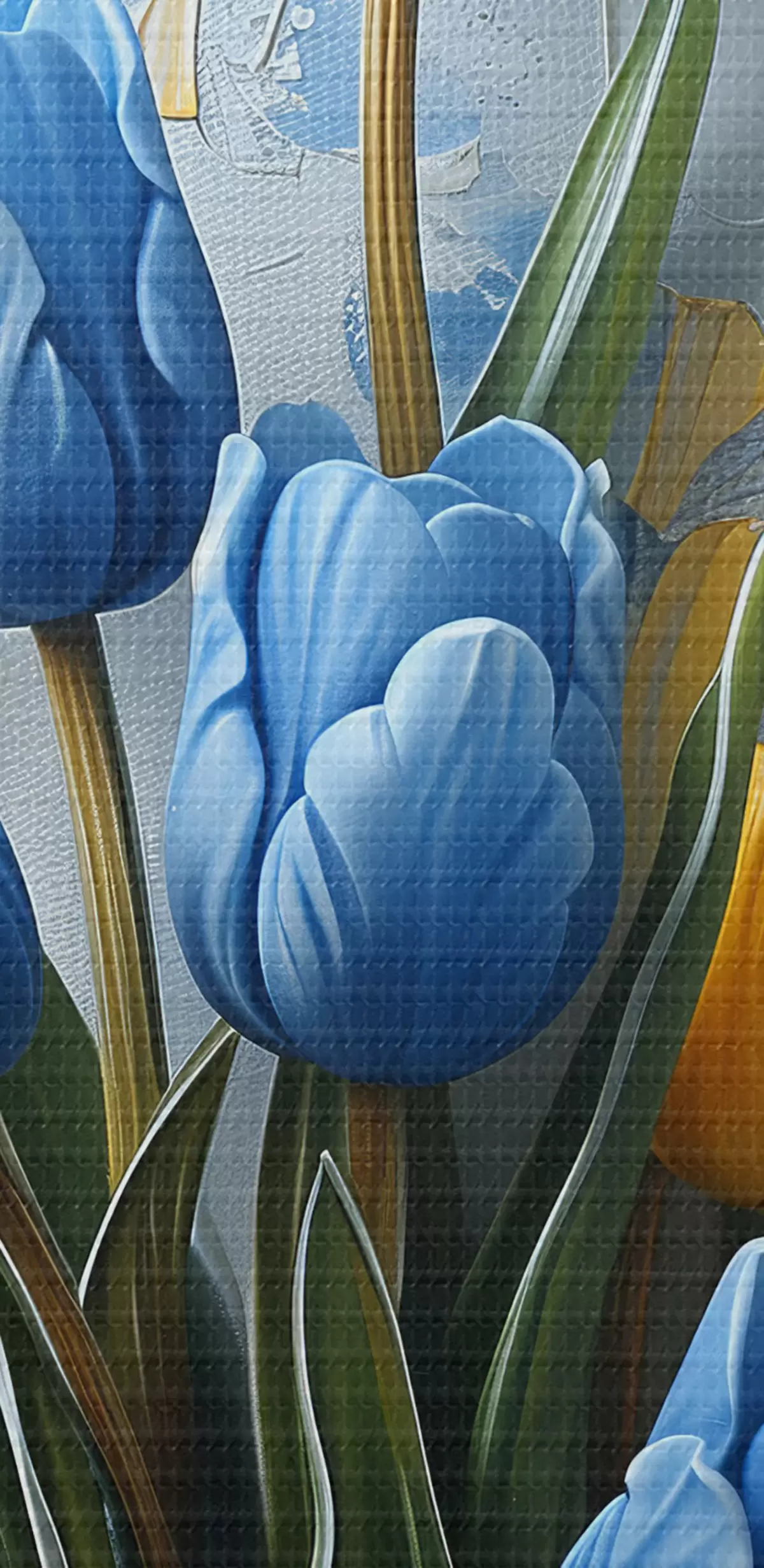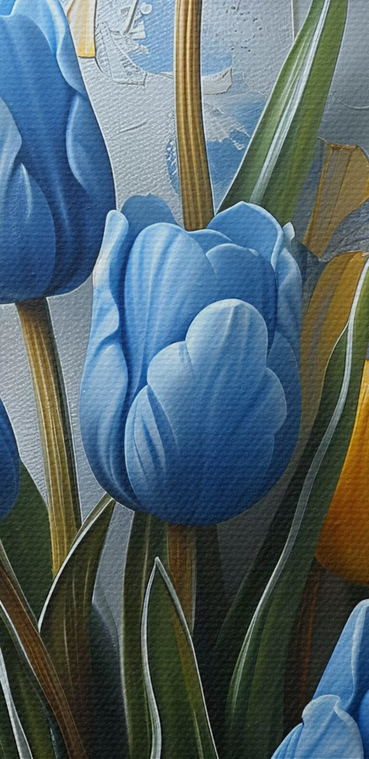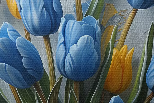Image Tulipes bleues et jaunes en 3D : élégante peinture murale à l'huile avec fond blanc et bleu clair et vase gravé Nr r39637