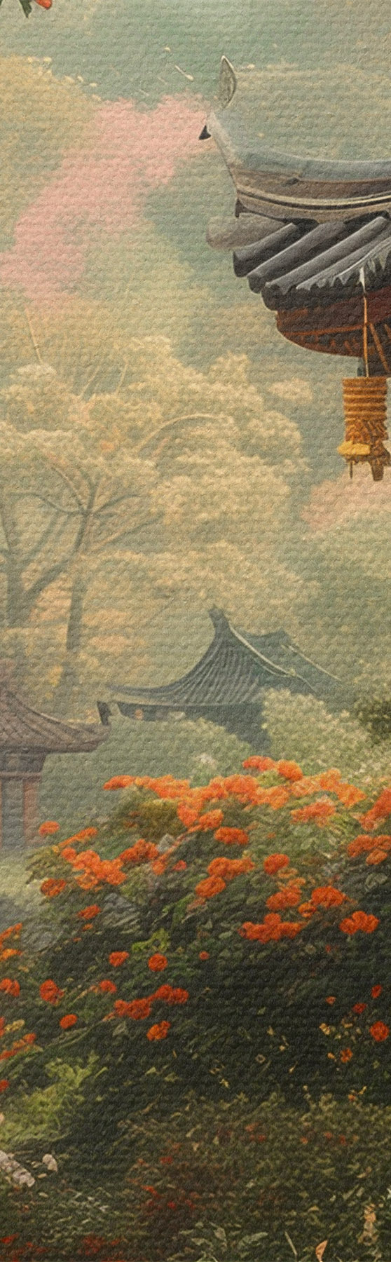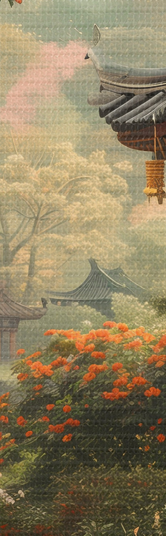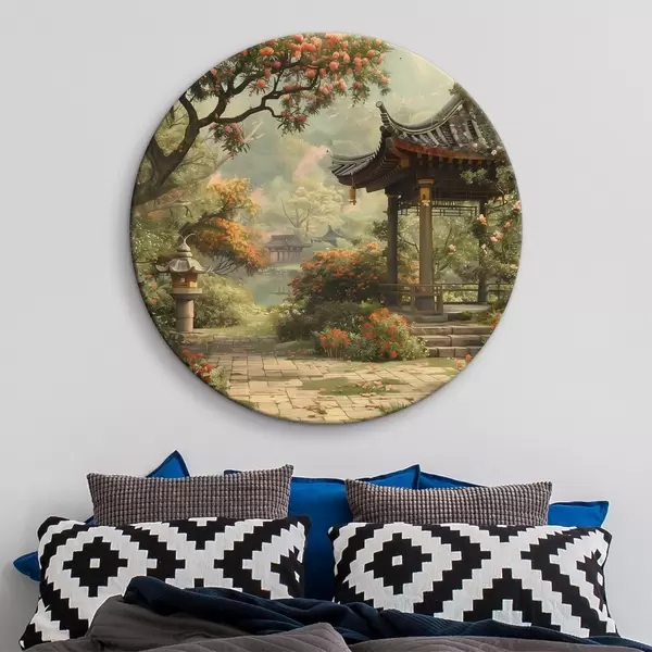 Tableaux ronds Parc japonais avec arbres et fleurs en fleurs, forêt, maison de jardin, lac r39772