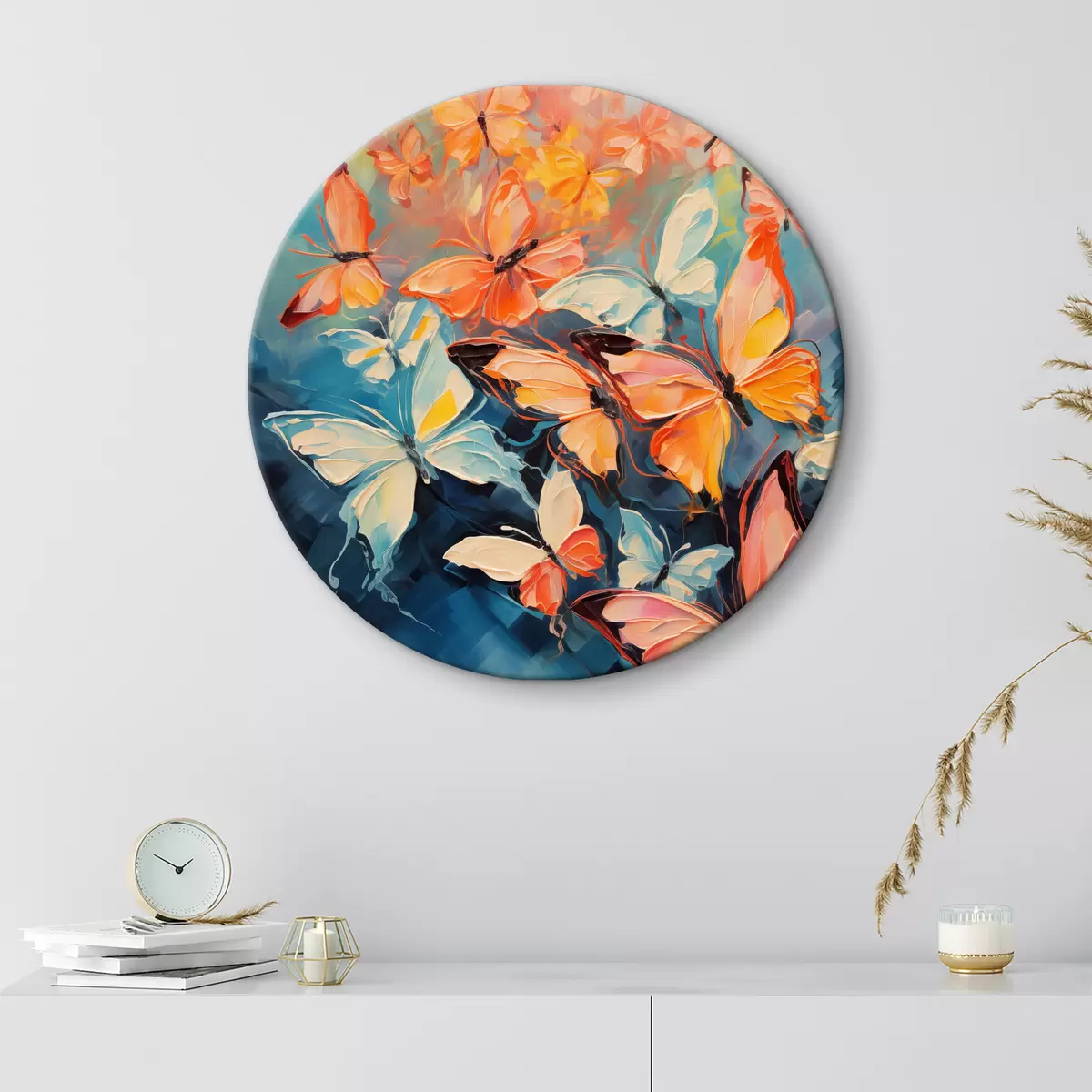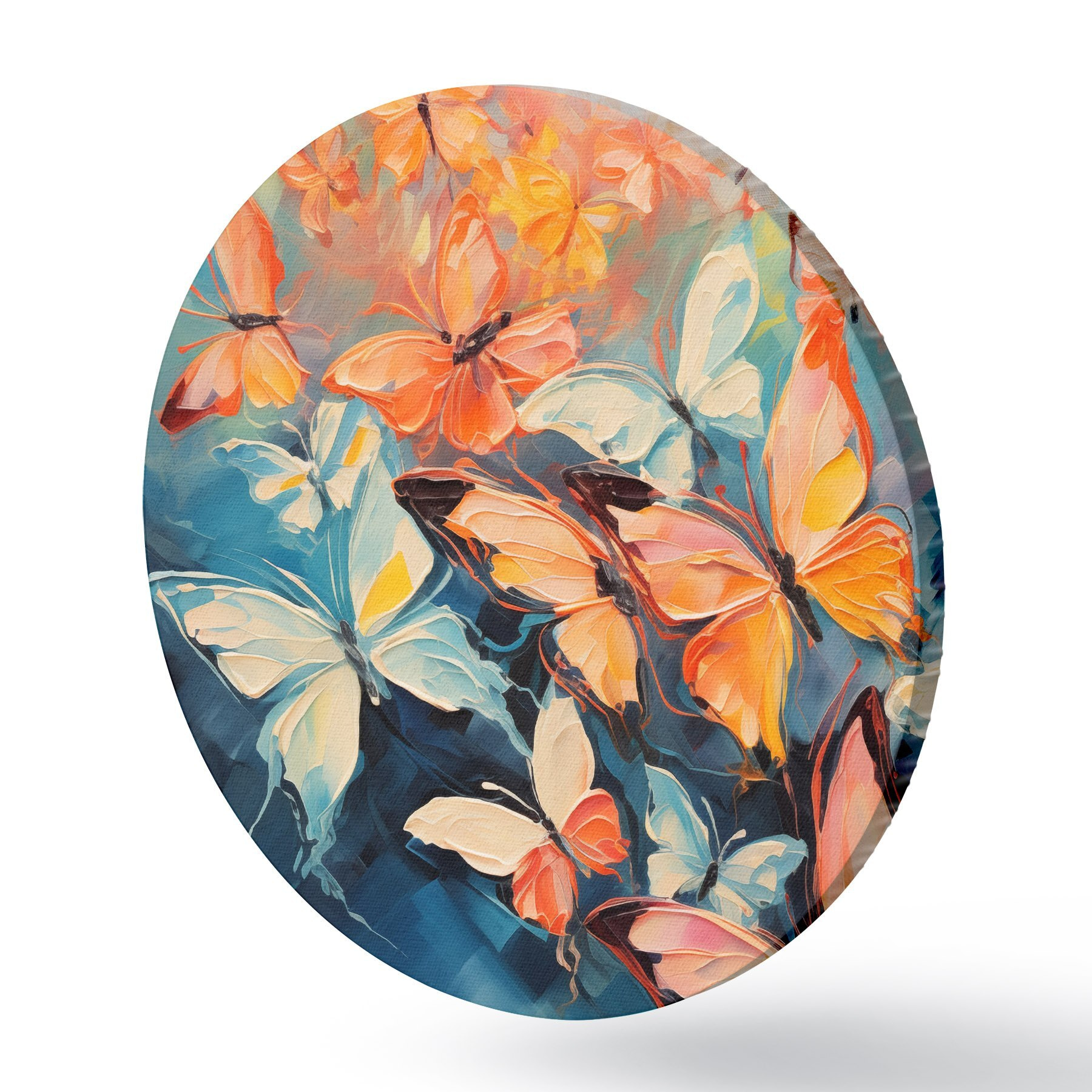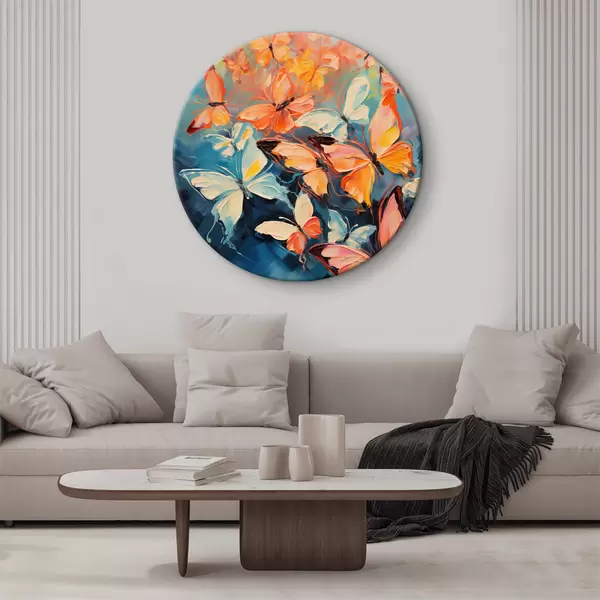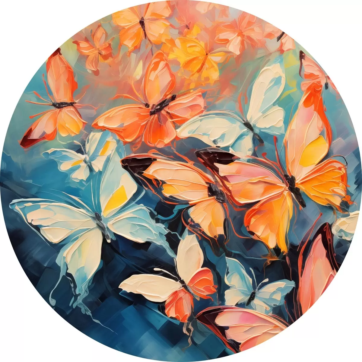 Tableaux ronds Un vol de papillons volant sur une peinture à l'huile bleue r39922