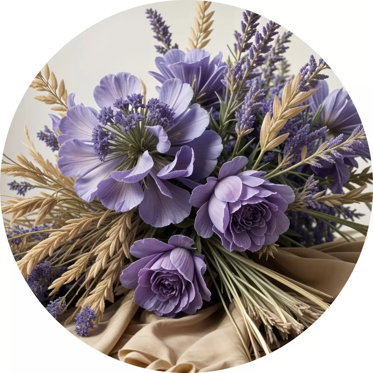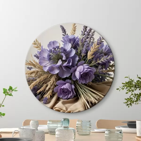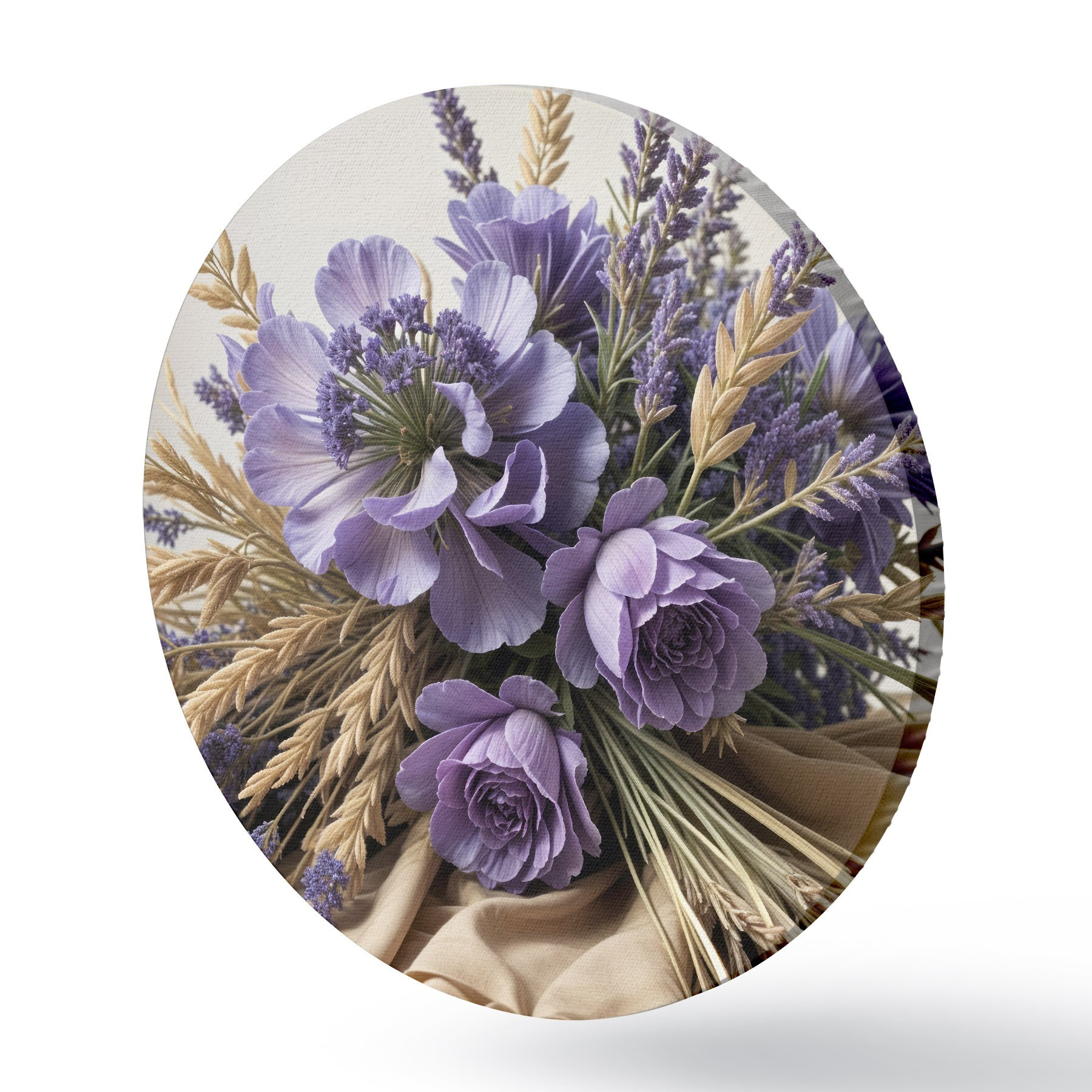 Tableaux ronds Un bouquet de fleurs violettes, dont des pivoines et de la lavande, avec des tiges de blé sur un fond clair r40030