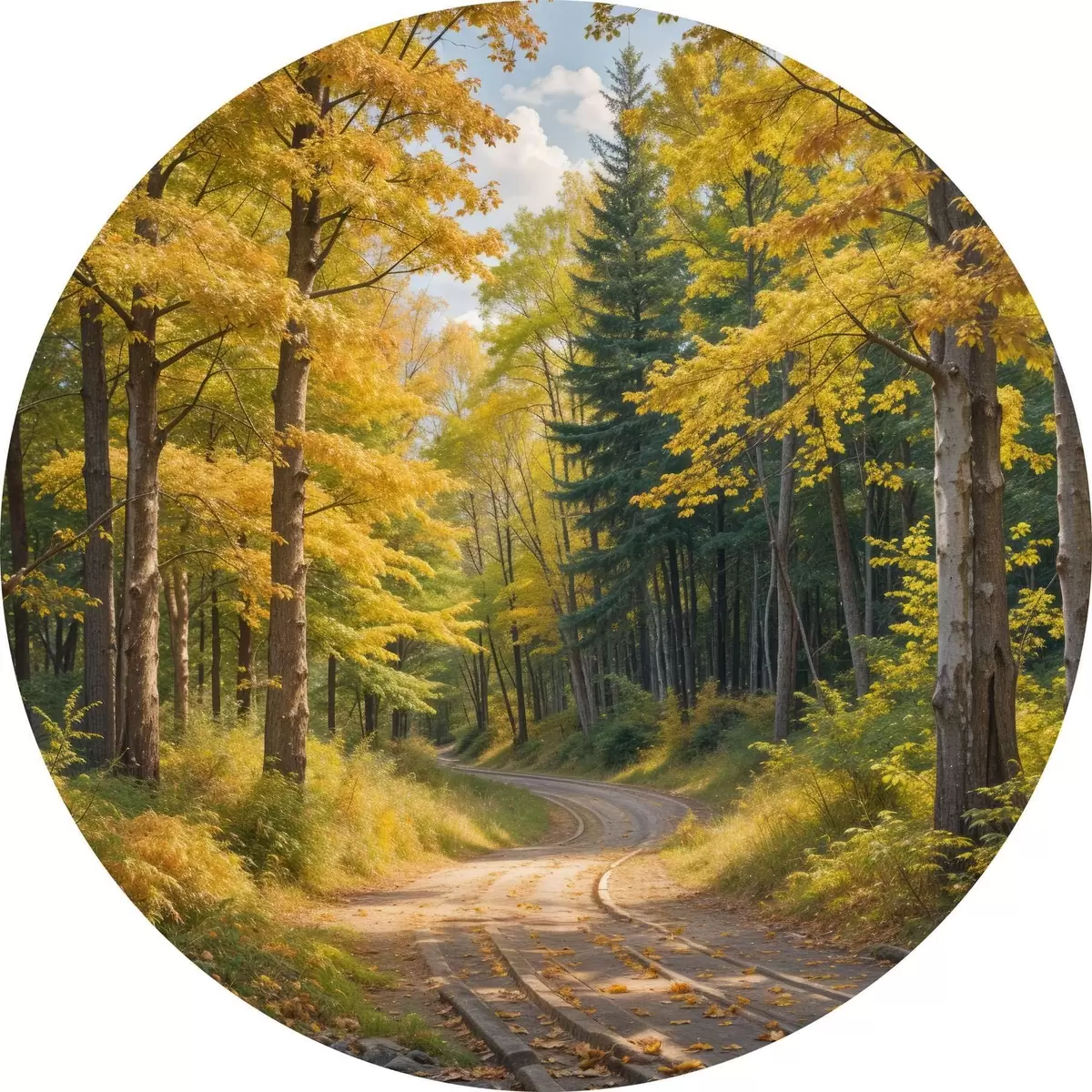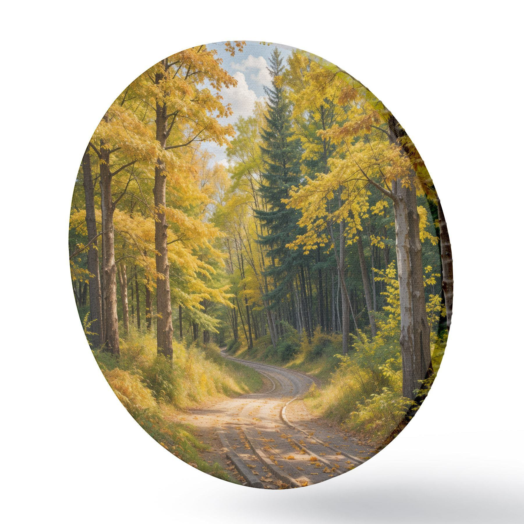 Tableaux ronds Un chemin de terre serpentant à travers une forêt en automne, avec de grands arbres des deux côtés r40031