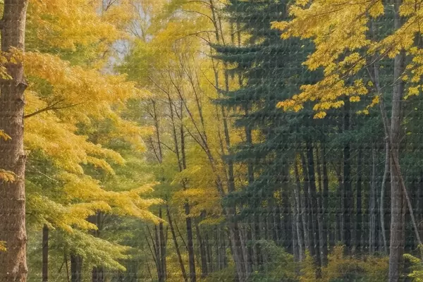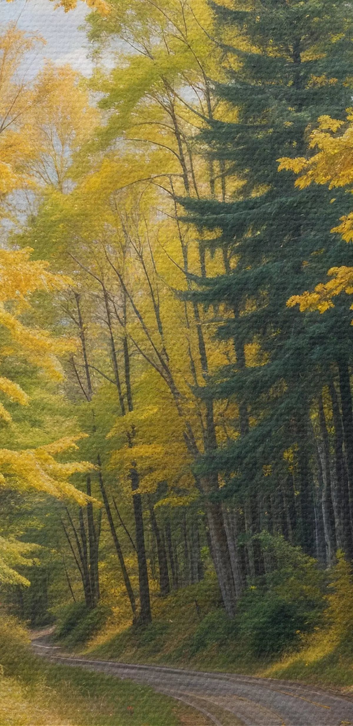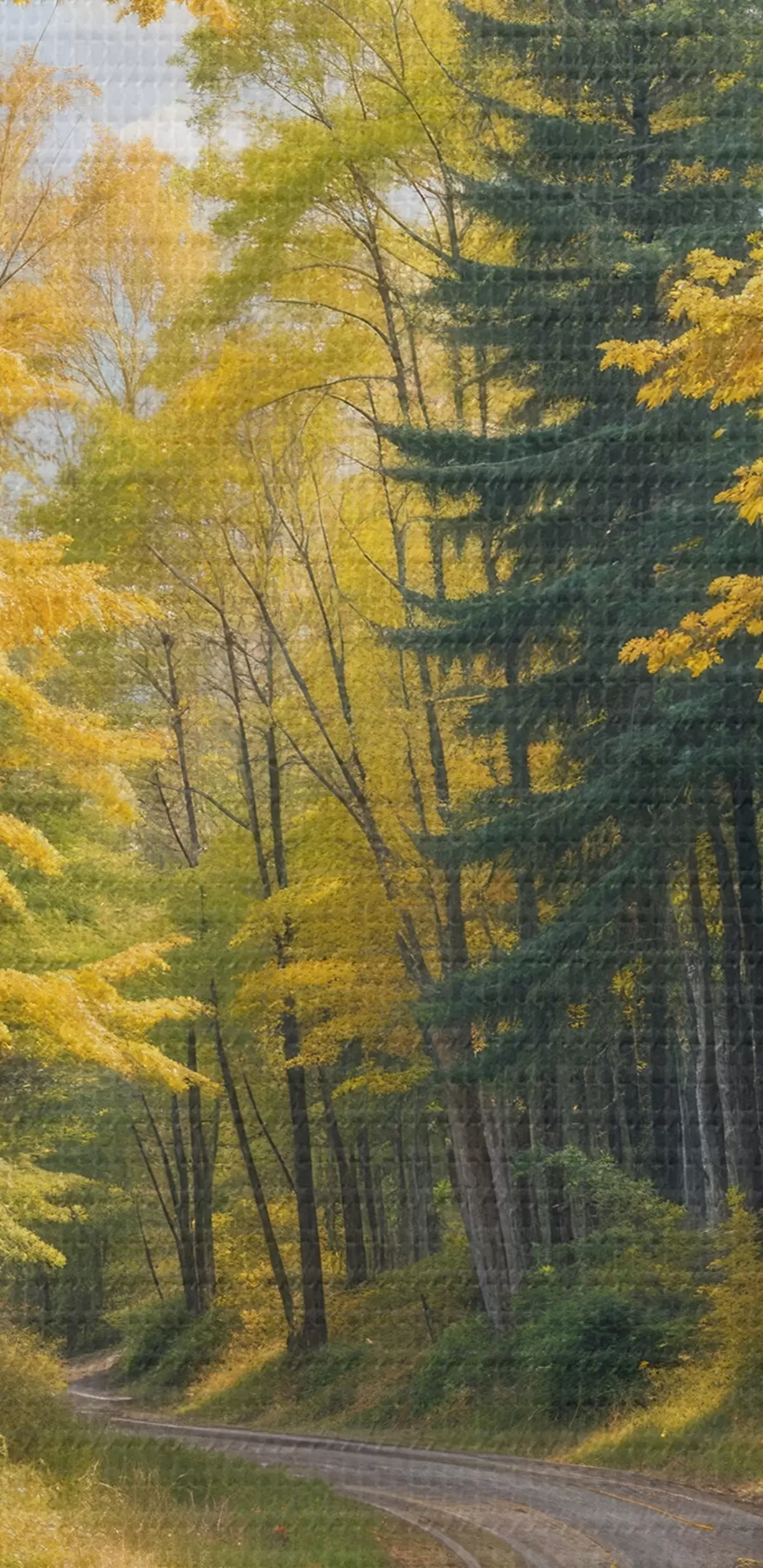 Image Un chemin de terre serpentant à travers une forêt en automne, avec de grands arbres des deux côtés Nr r40031