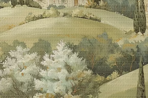 Image Paysage avec maisons anciennes, couleurs vert pastel, dessin acrylique, été Nr r40078