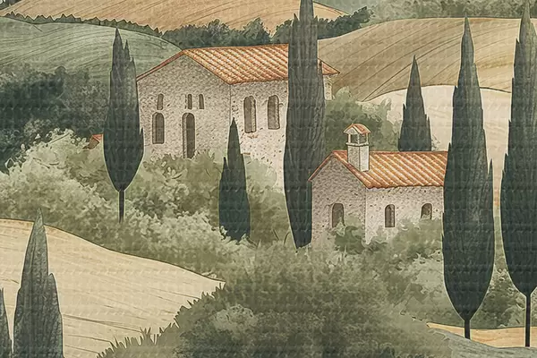 Image Paysage toscan avec maisons anciennes, couleurs pastel, collines et arbres, rustique Nr r40082