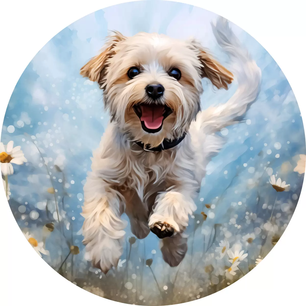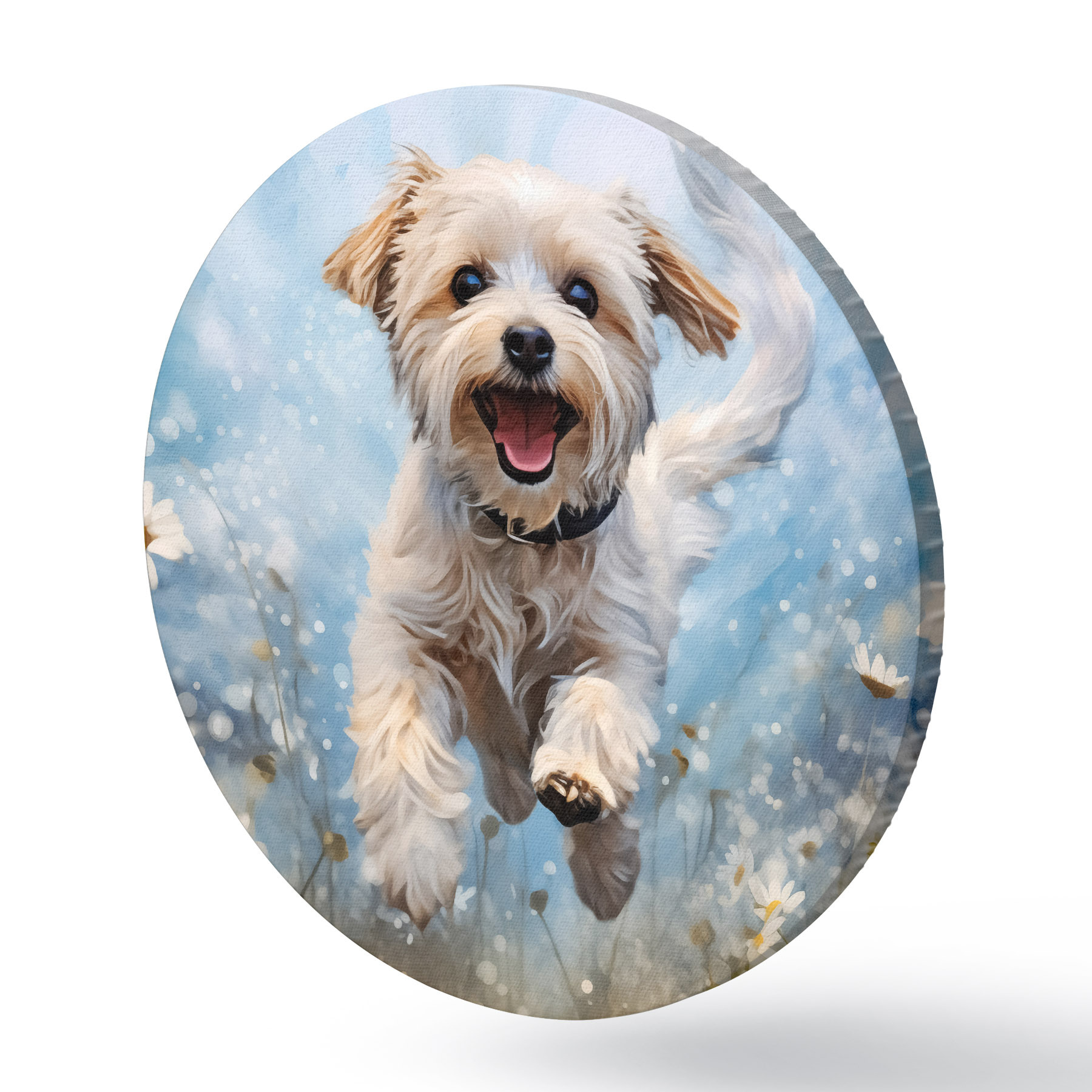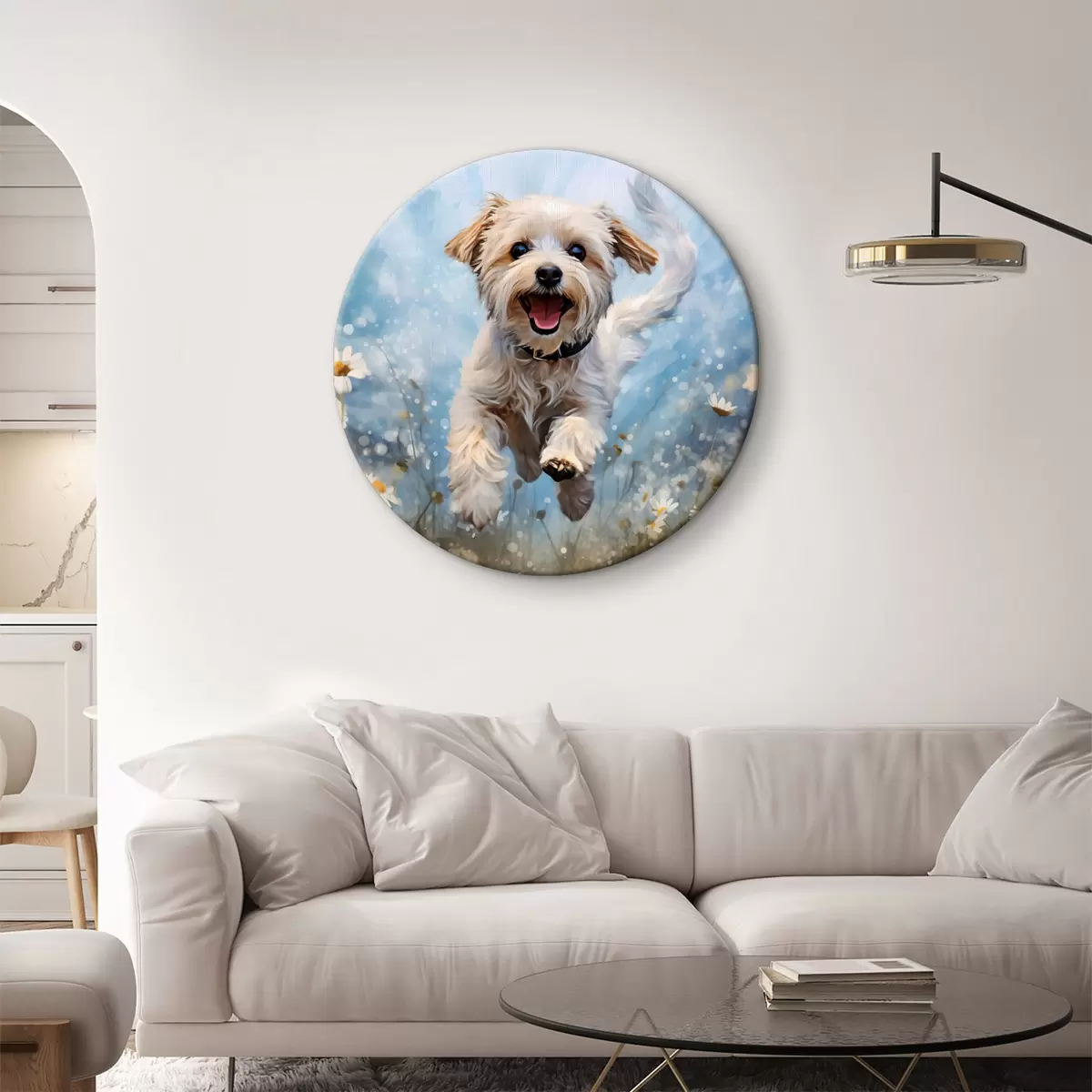 Tableaux ronds Petit chien blanc sautant parmi les marguerites sur fond bleu aquarelle r40092