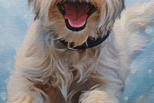 Image Petit chien blanc sautant parmi les marguerites sur fond bleu aquarelle Nr r40092
