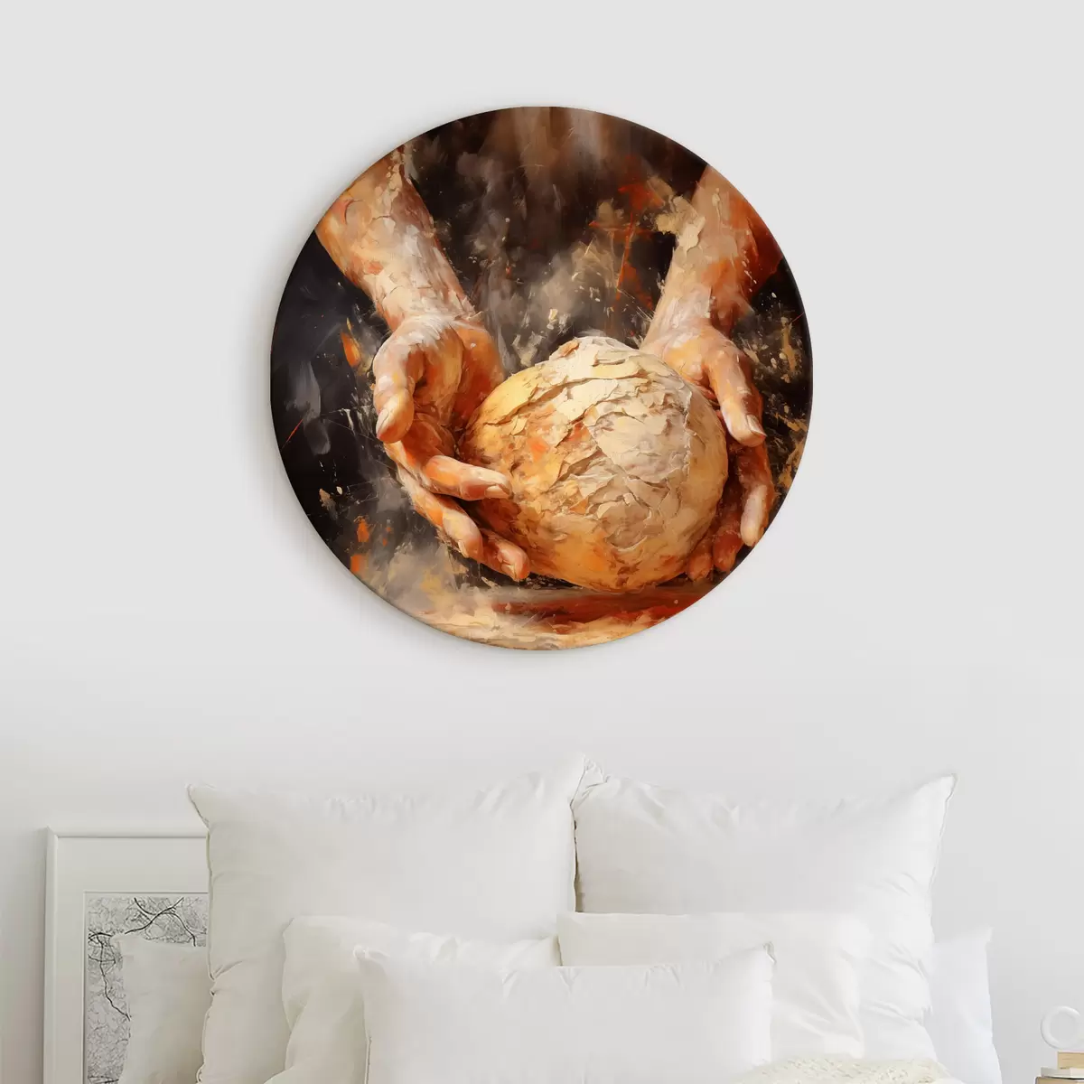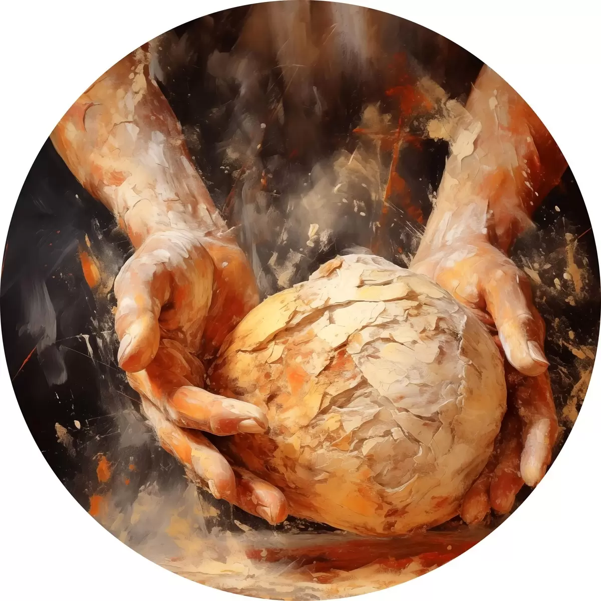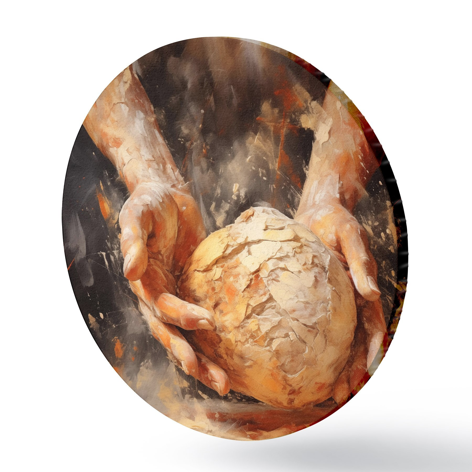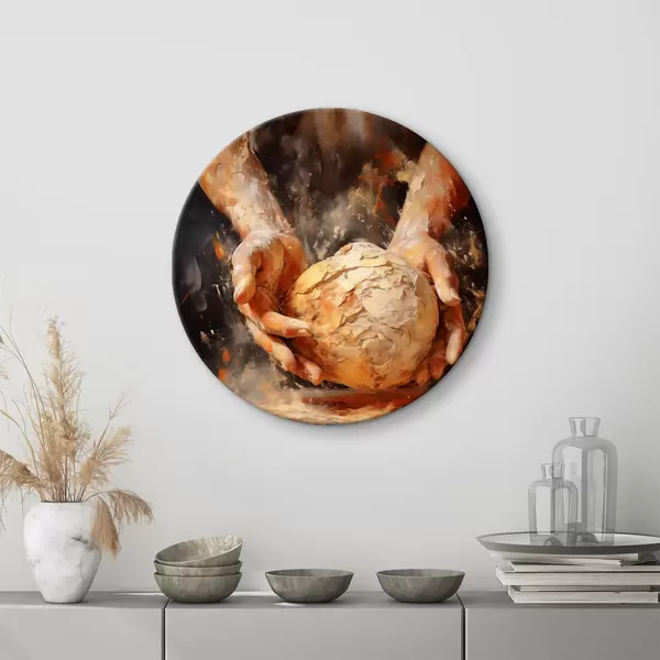 Tableaux ronds Peinture à l'huile imitation mains de boulanger tenant de la pâte r40095