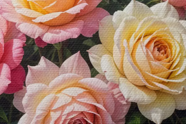 Image Un bouquet de roses colorées dans différentes nuances de rose, de jaune et d'orange, disposé avec des feuilles vertes Nr r40149