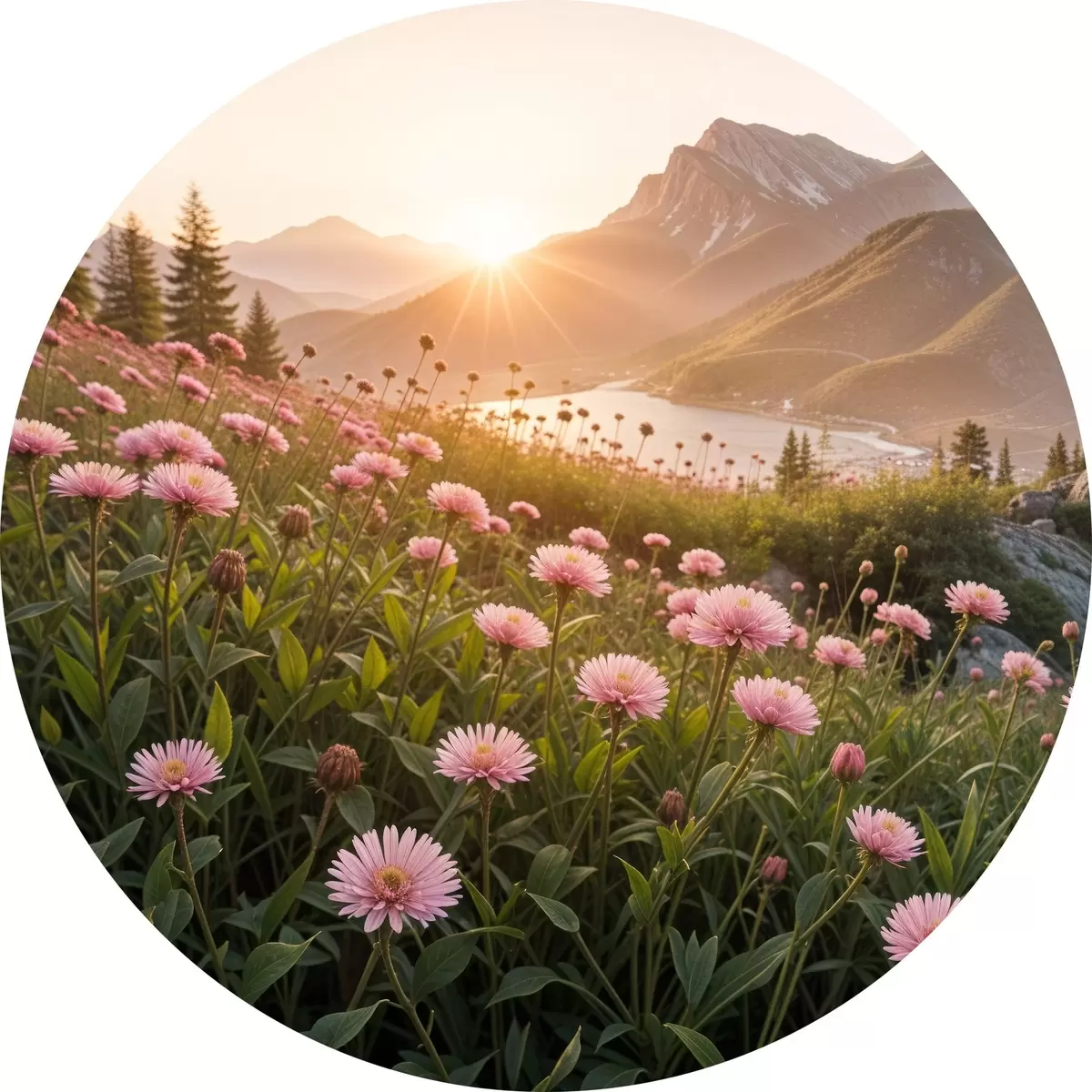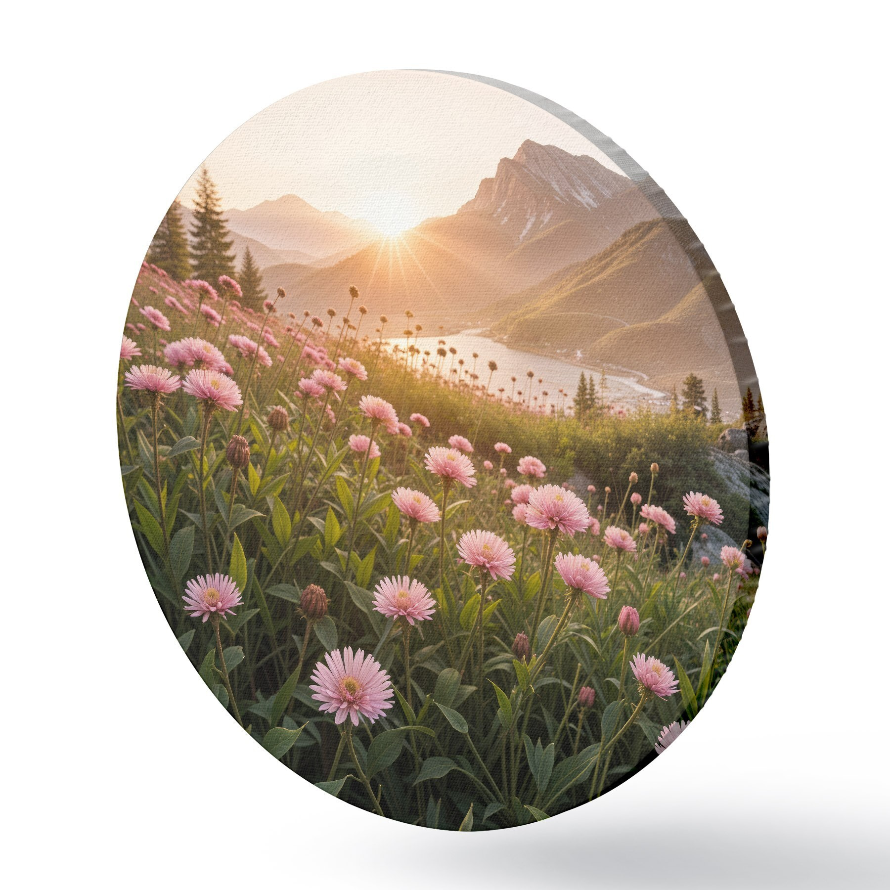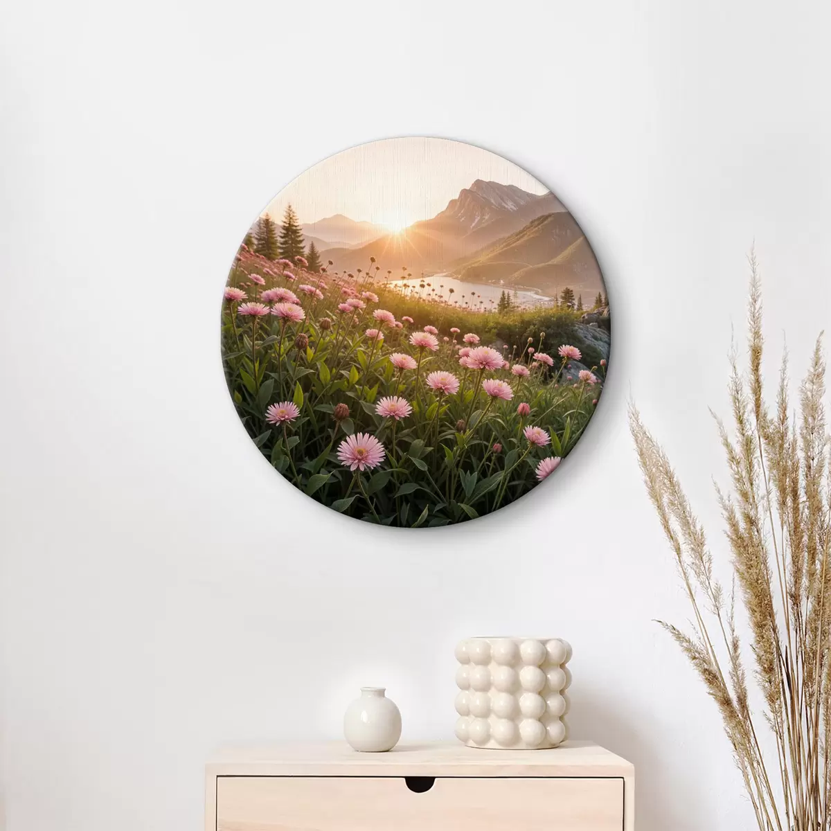 Tableaux ronds Un champ de fleurs roses ressemblant à des marguerites au premier plan, avec une grande chaîne de montagnes en arrière-plan r40154