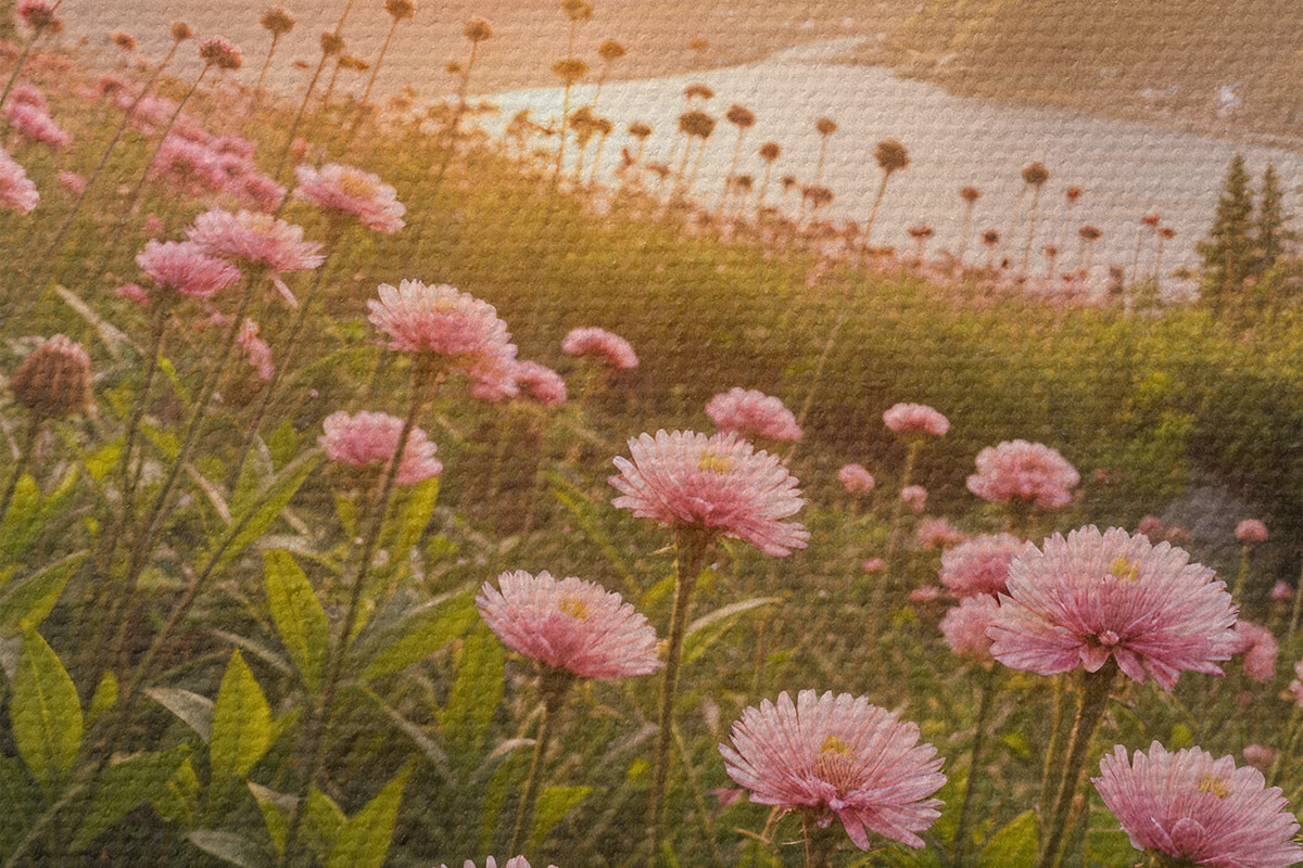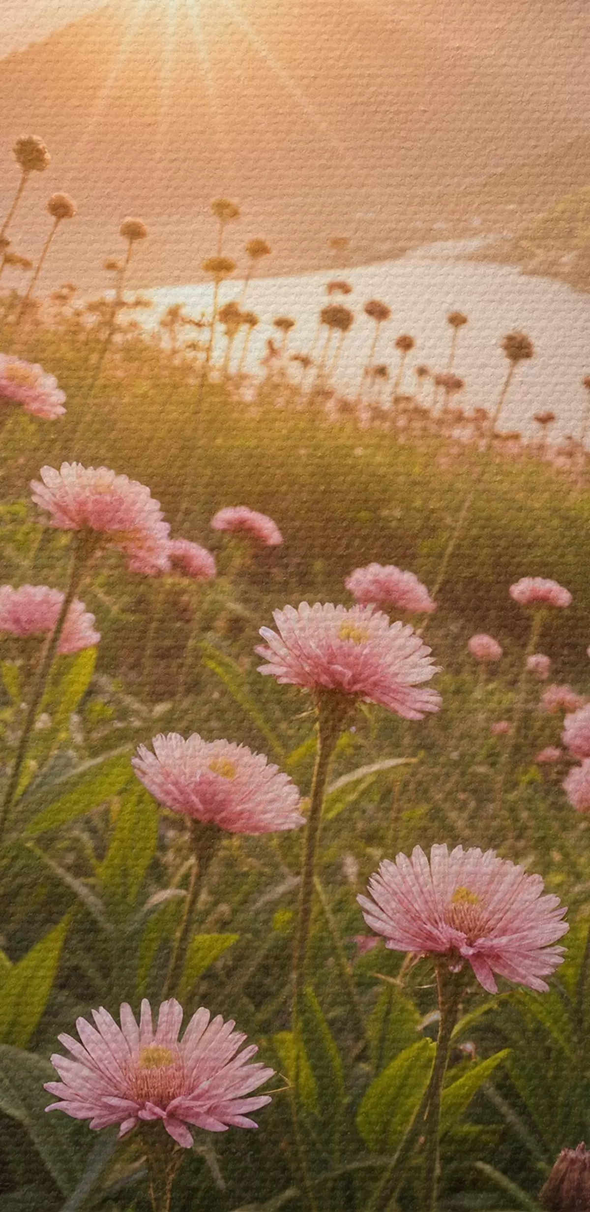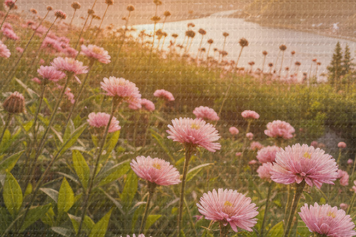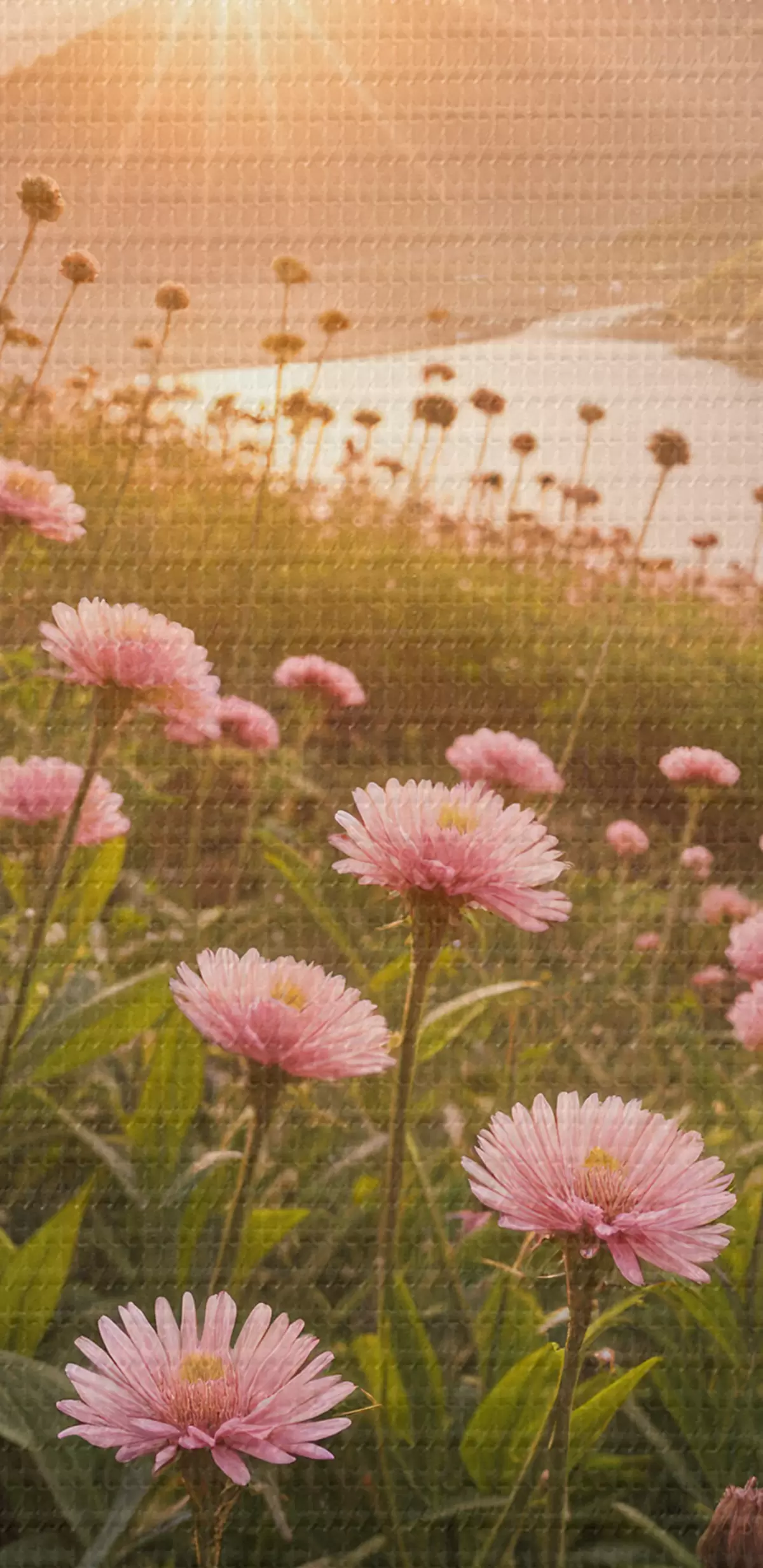 Image Un champ de fleurs roses ressemblant à des marguerites au premier plan, avec une grande chaîne de montagnes en arrière-plan Nr r40154