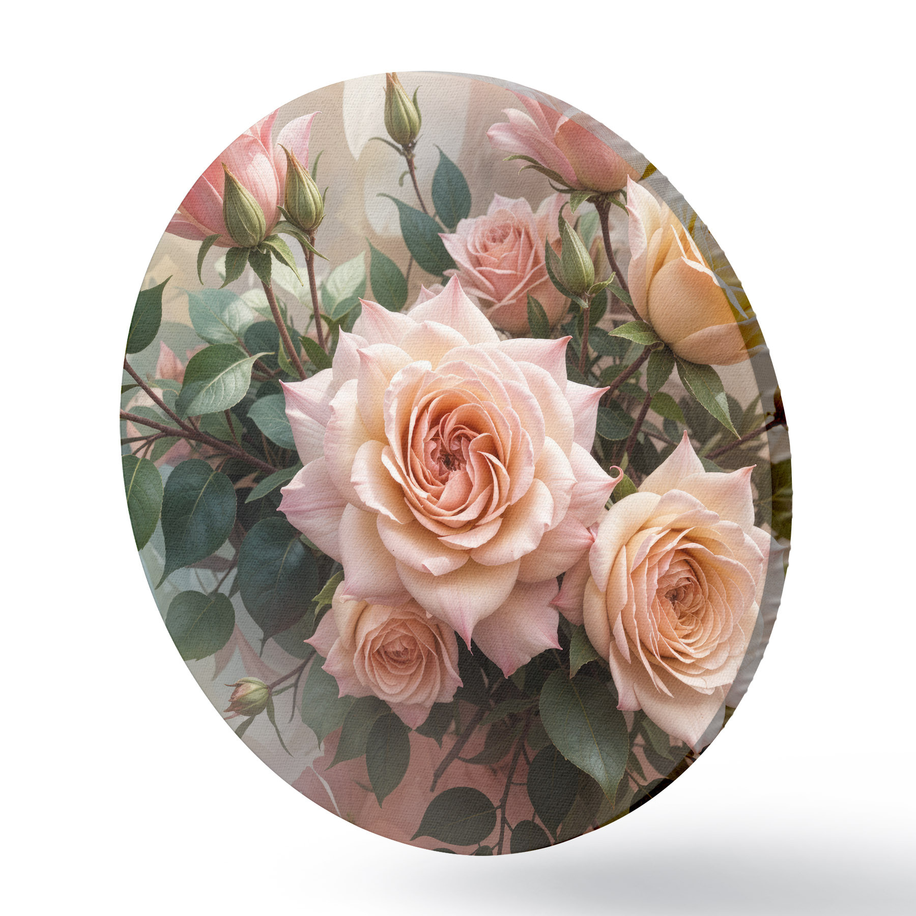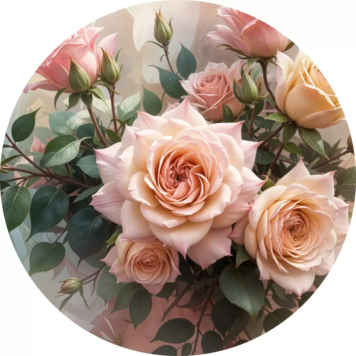 Tableaux ronds Un bouquet de belles roses roses avec des feuilles vertes sur un fond doux et flou r40168