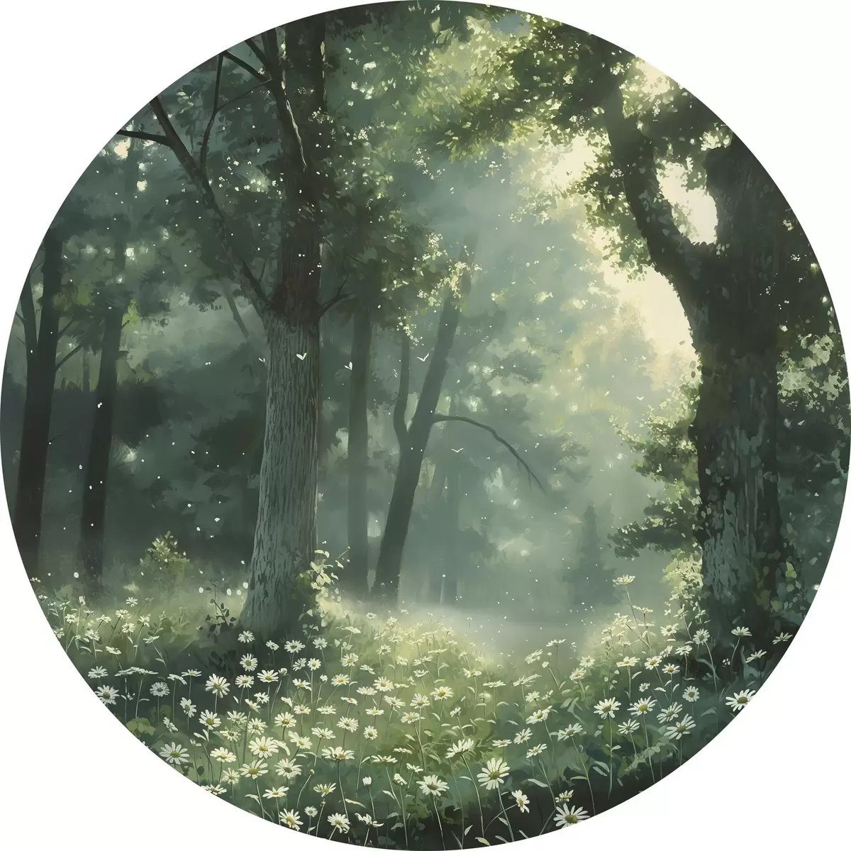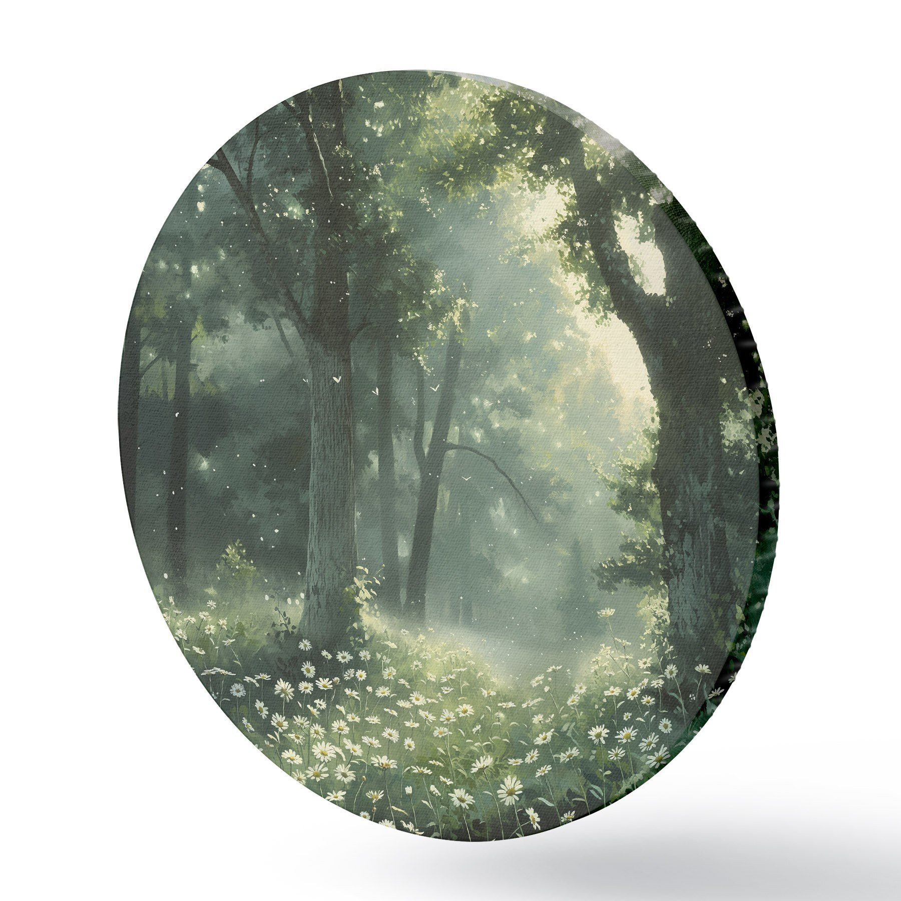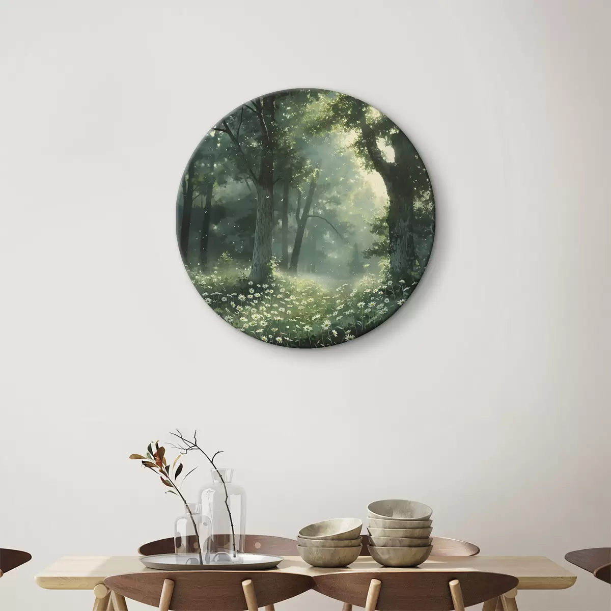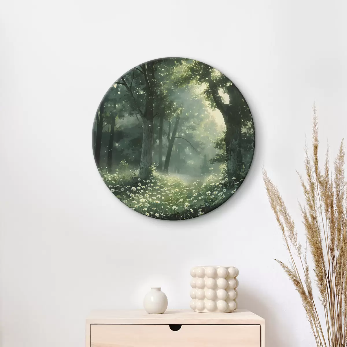 Tableaux ronds Forêt dense avec soleil dans les arbres, fleurs de camomille, herbe verte, nature r40224