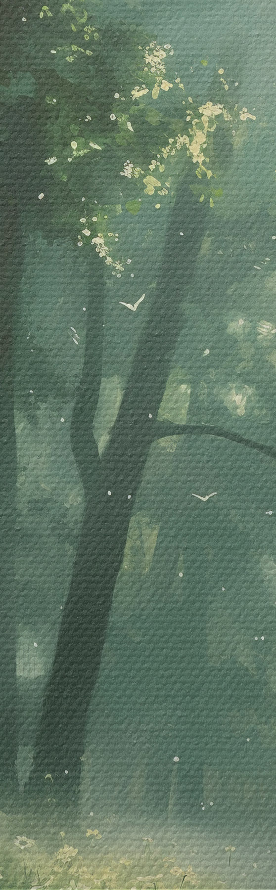 Image Forêt dense avec soleil dans les arbres, fleurs de camomille, herbe verte, nature Nr r40224
