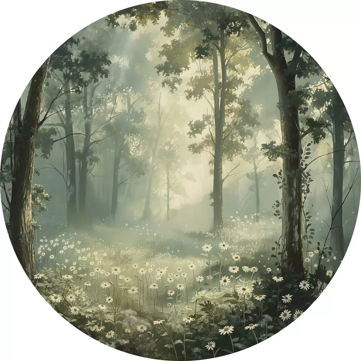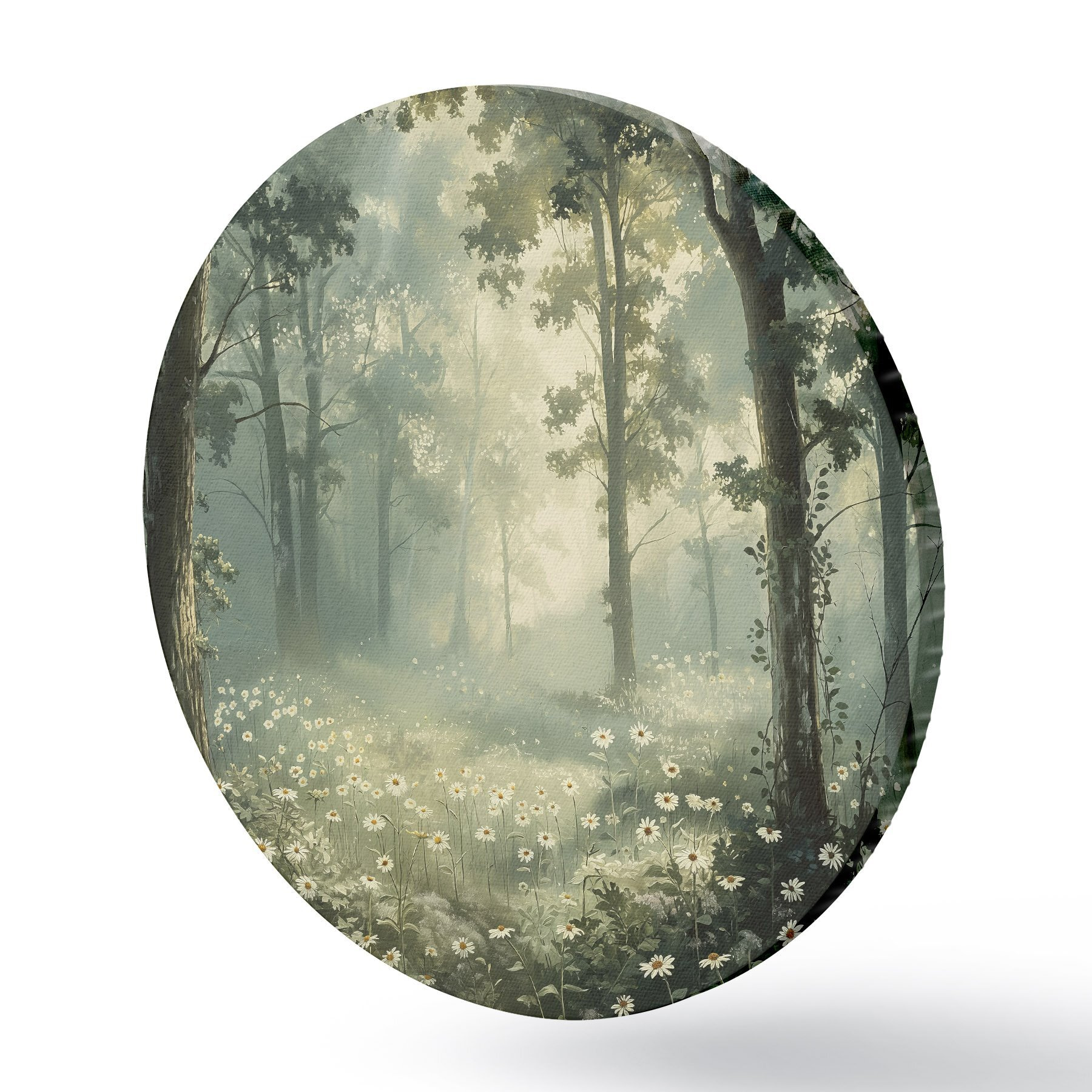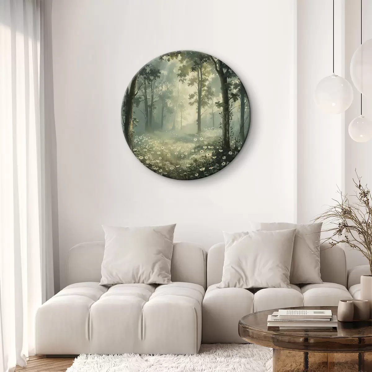 Tableaux ronds Forêt avec une douce lumière du soleil, fleurs de camomille, arbres, herbe verte, dessin acrylique r40228