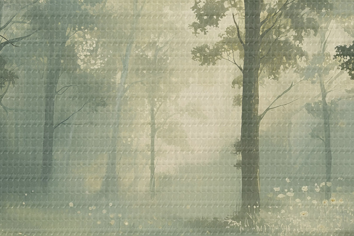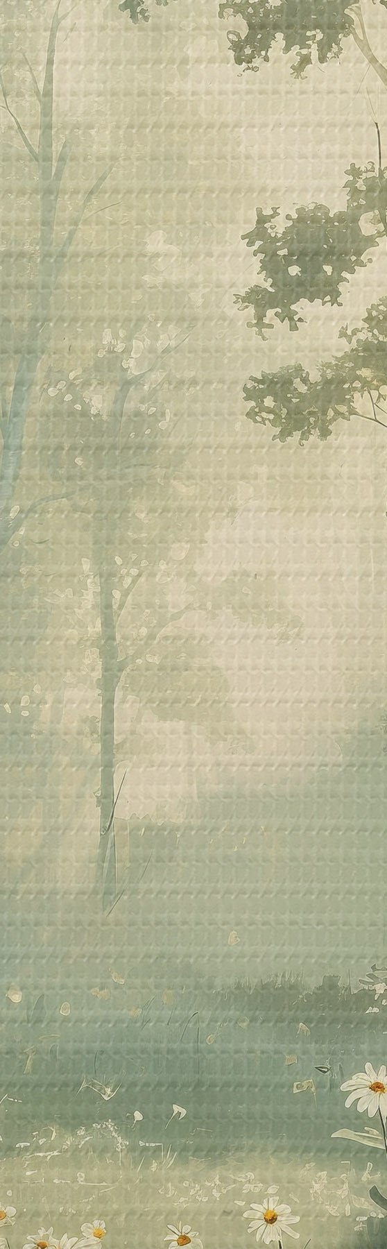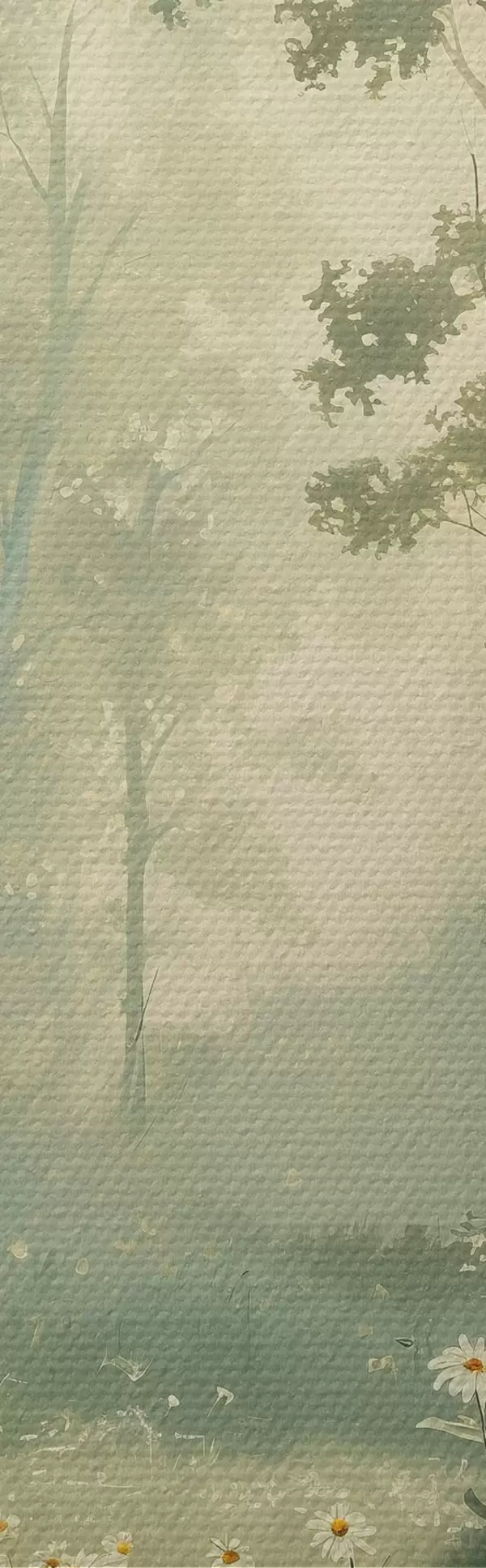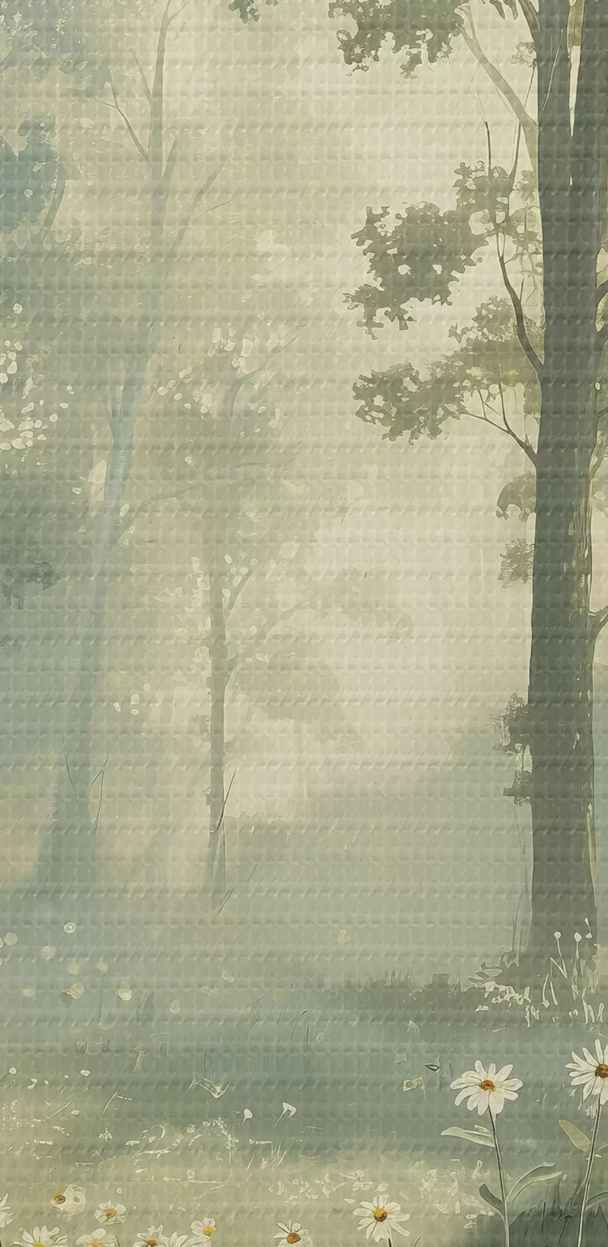 Image Forêt avec une douce lumière du soleil, fleurs de camomille, arbres, herbe verte, dessin acrylique Nr r40228