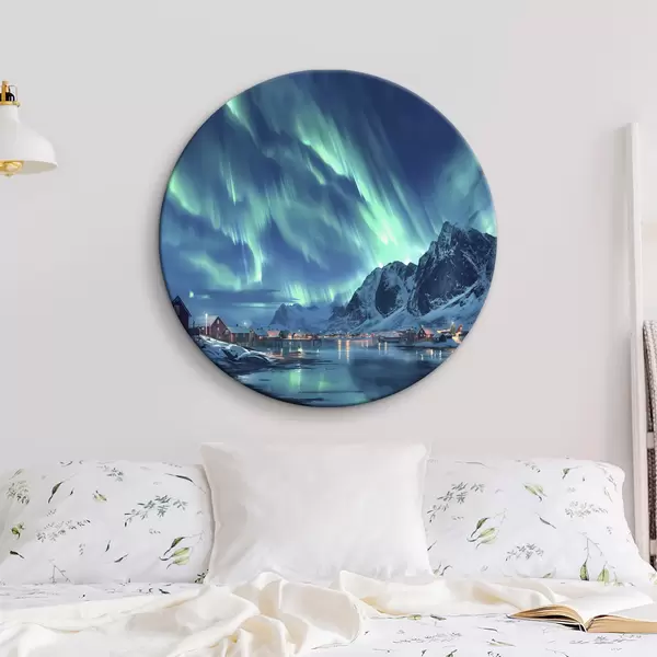 Tableaux ronds Norvège, village d'hiver, aurores boréales, ciel nocturne r40300
