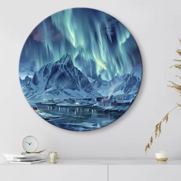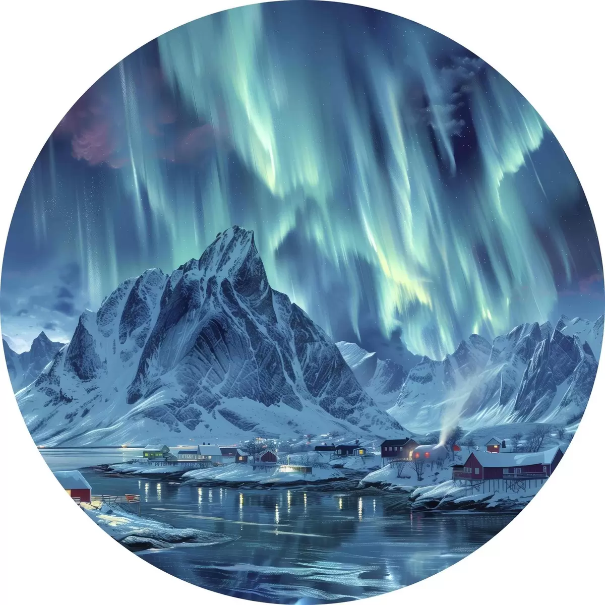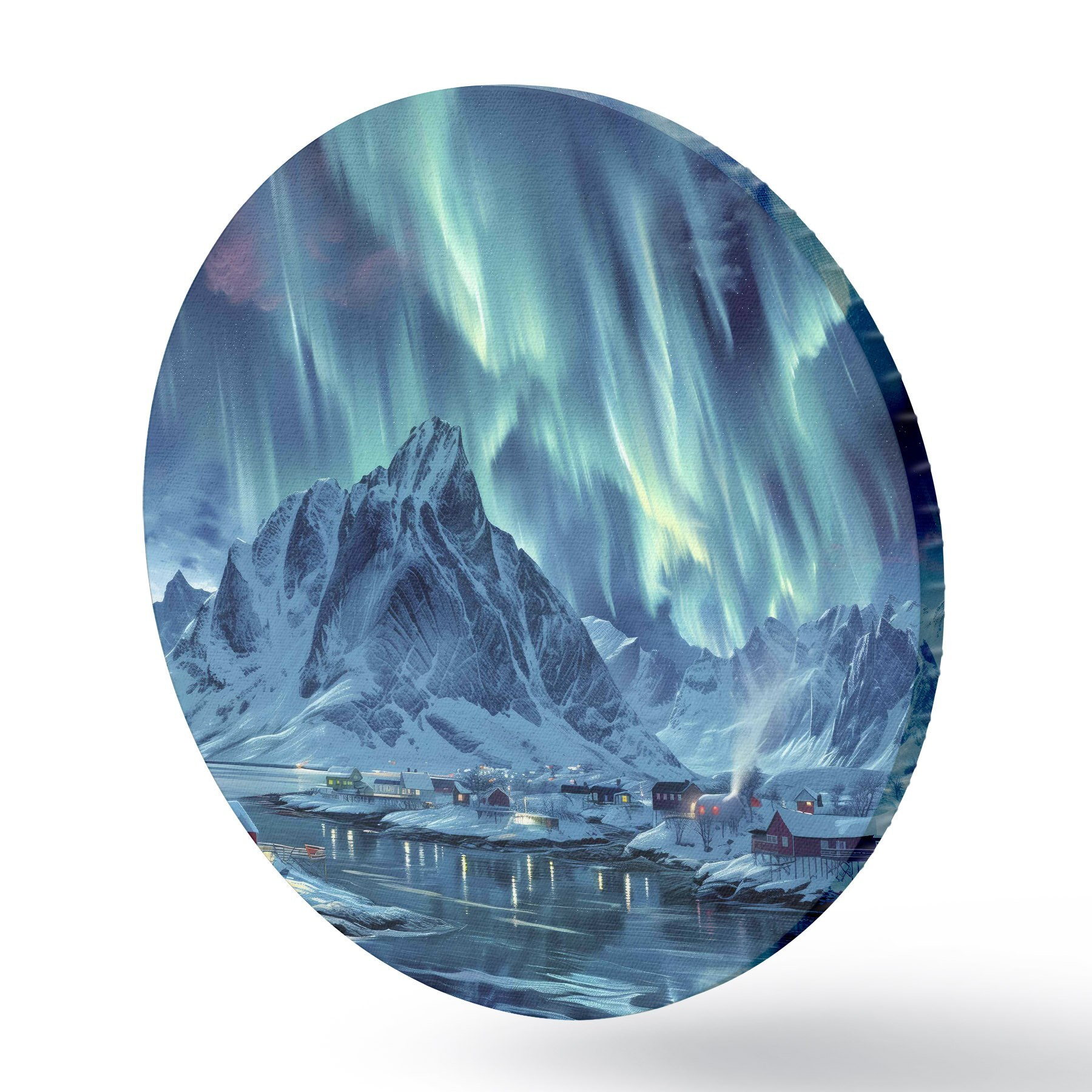 Tableaux ronds Aurore boréale magique, village d'hiver en Norvège r40301