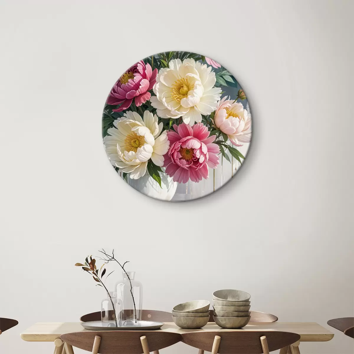 Tableaux ronds Un bouquet de fleurs de pivoine vibrantes dans différentes nuances de rose, de blanc et de jaune avec des touches de peinture r40403