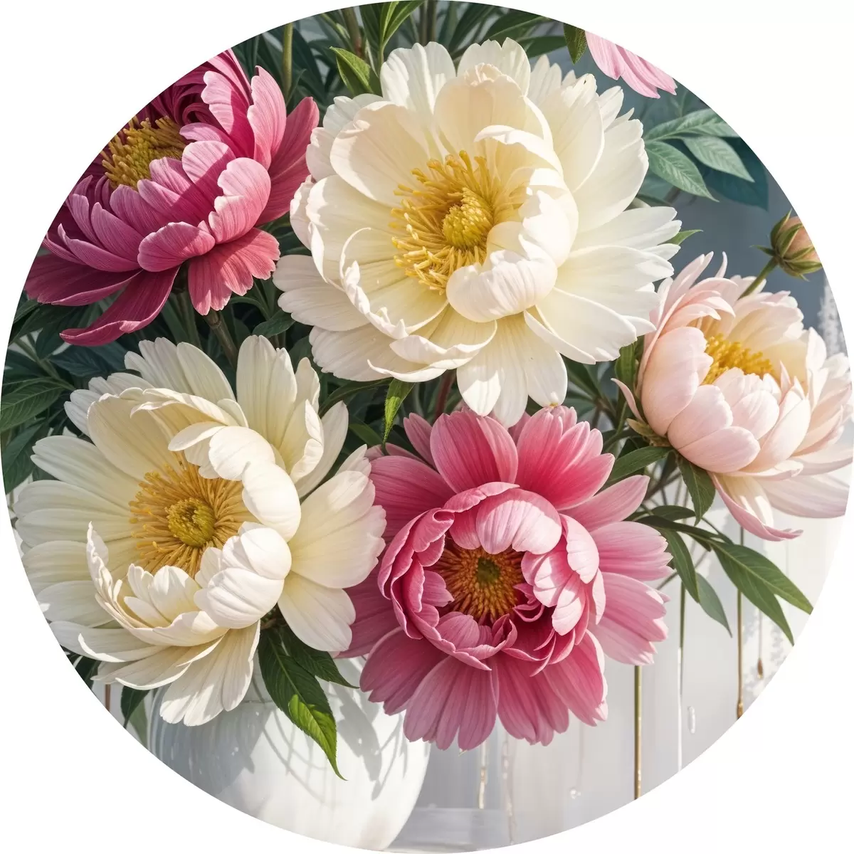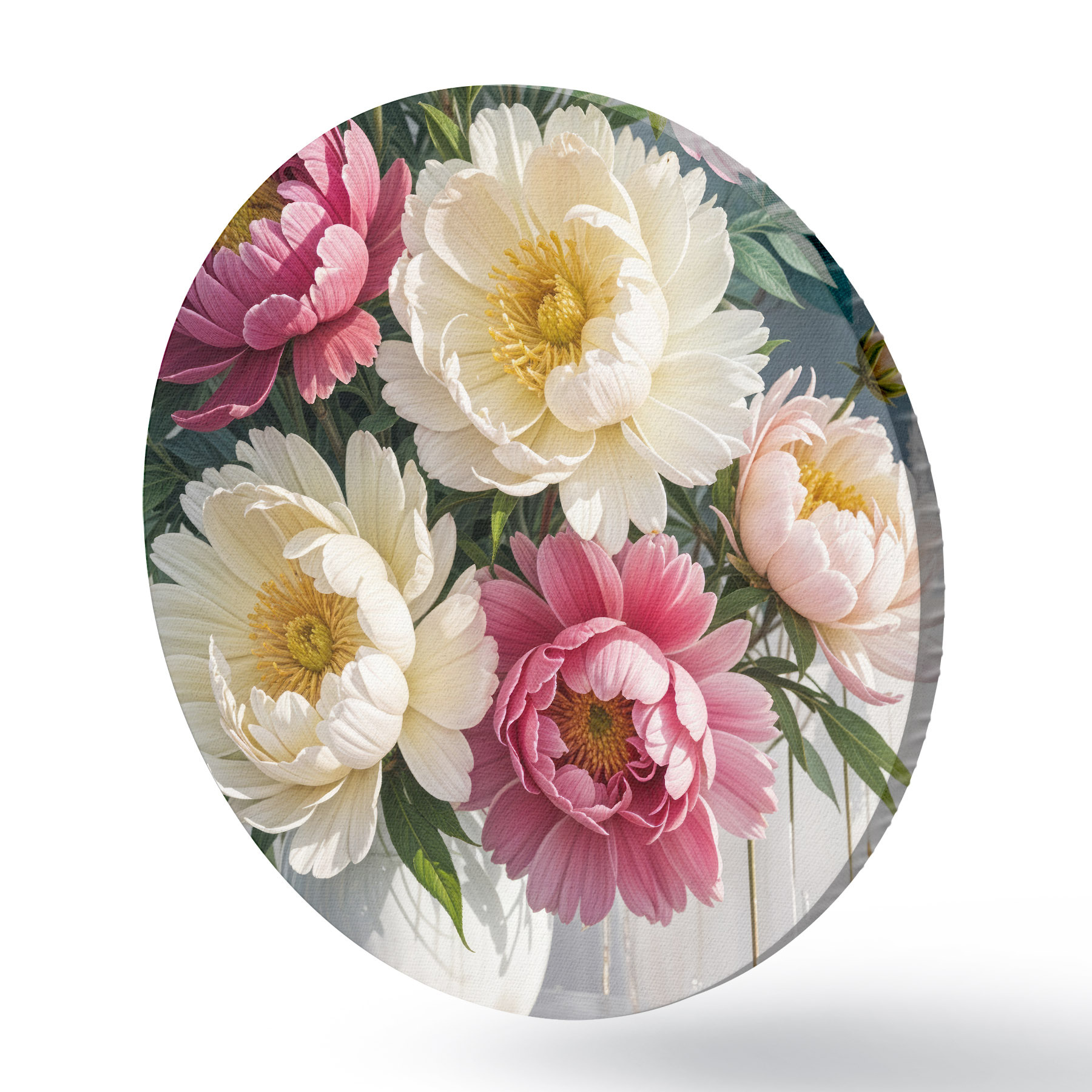 Tableaux ronds Un bouquet de fleurs de pivoine vibrantes dans différentes nuances de rose, de blanc et de jaune avec des touches de peinture r40403