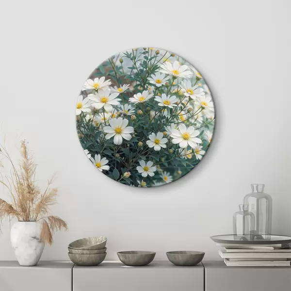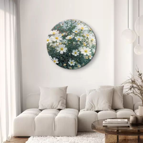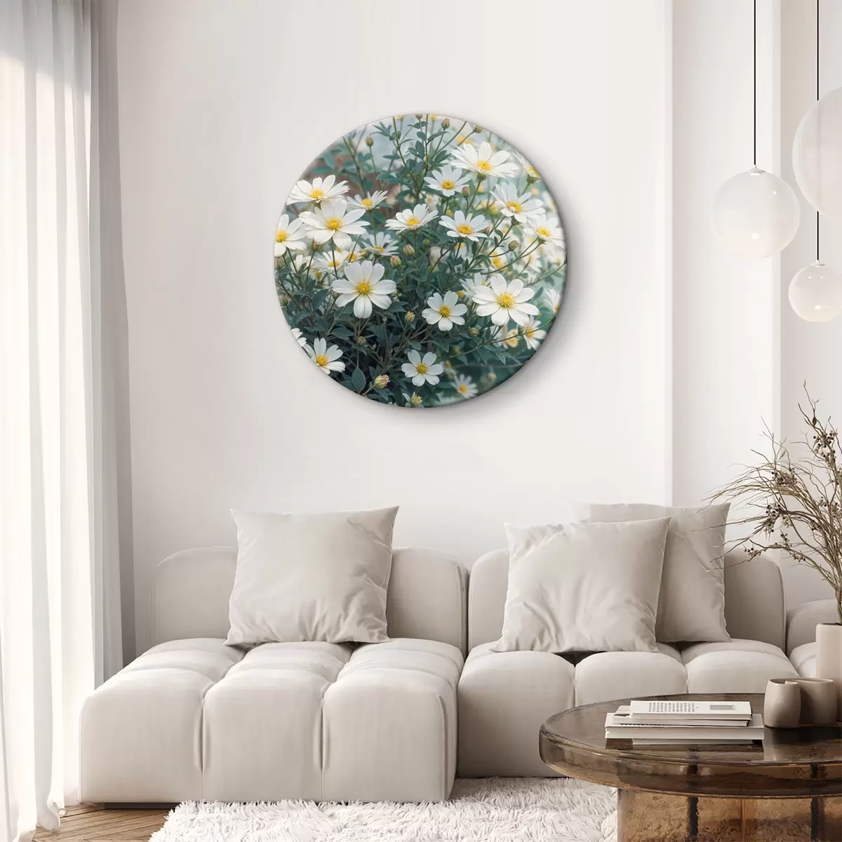 Tableaux ronds Un champ de fleurs de marguerites blanches avec un feuillage vert, sur un fond flou r40413