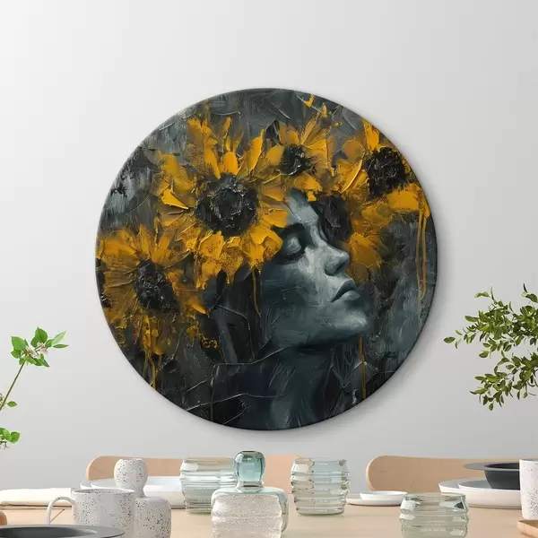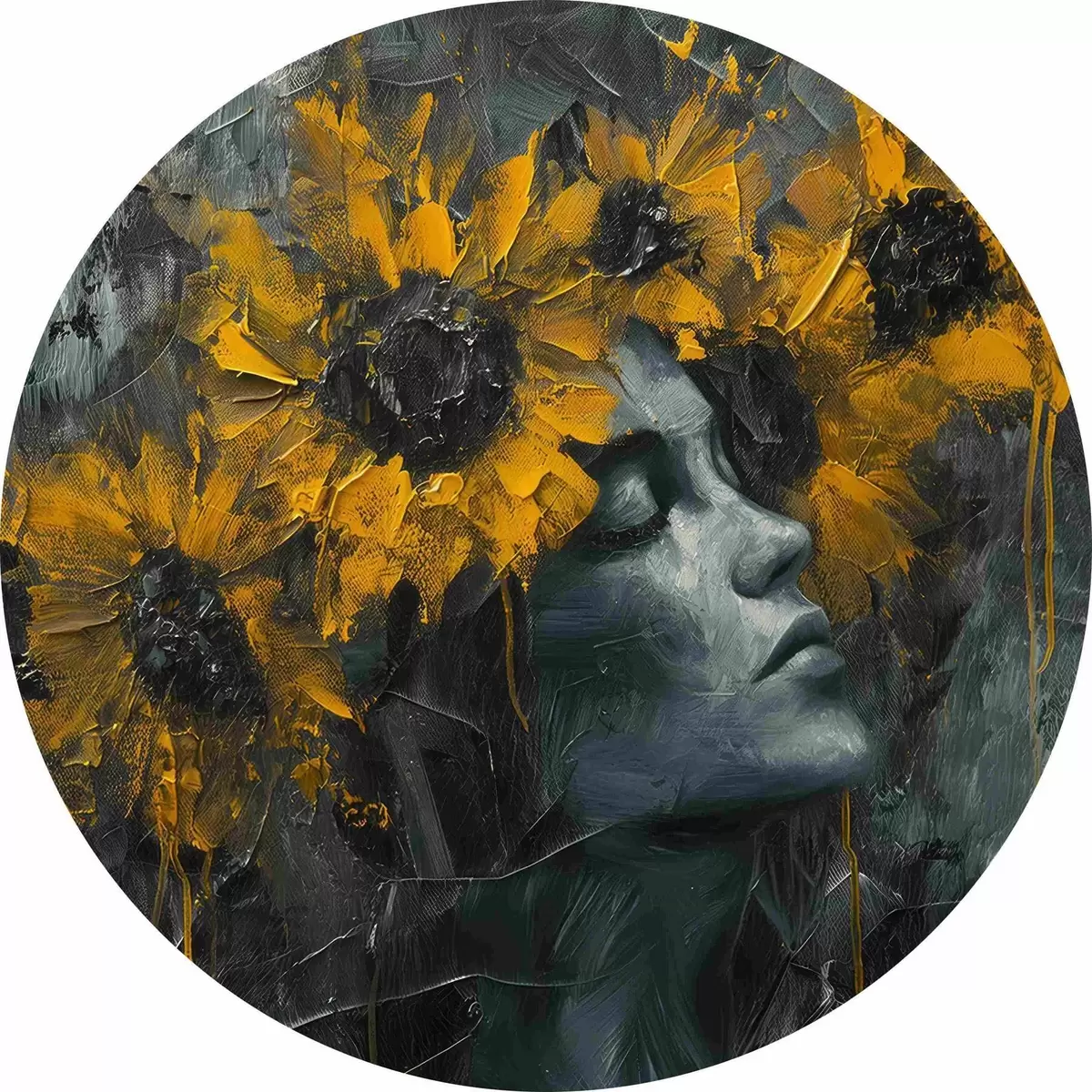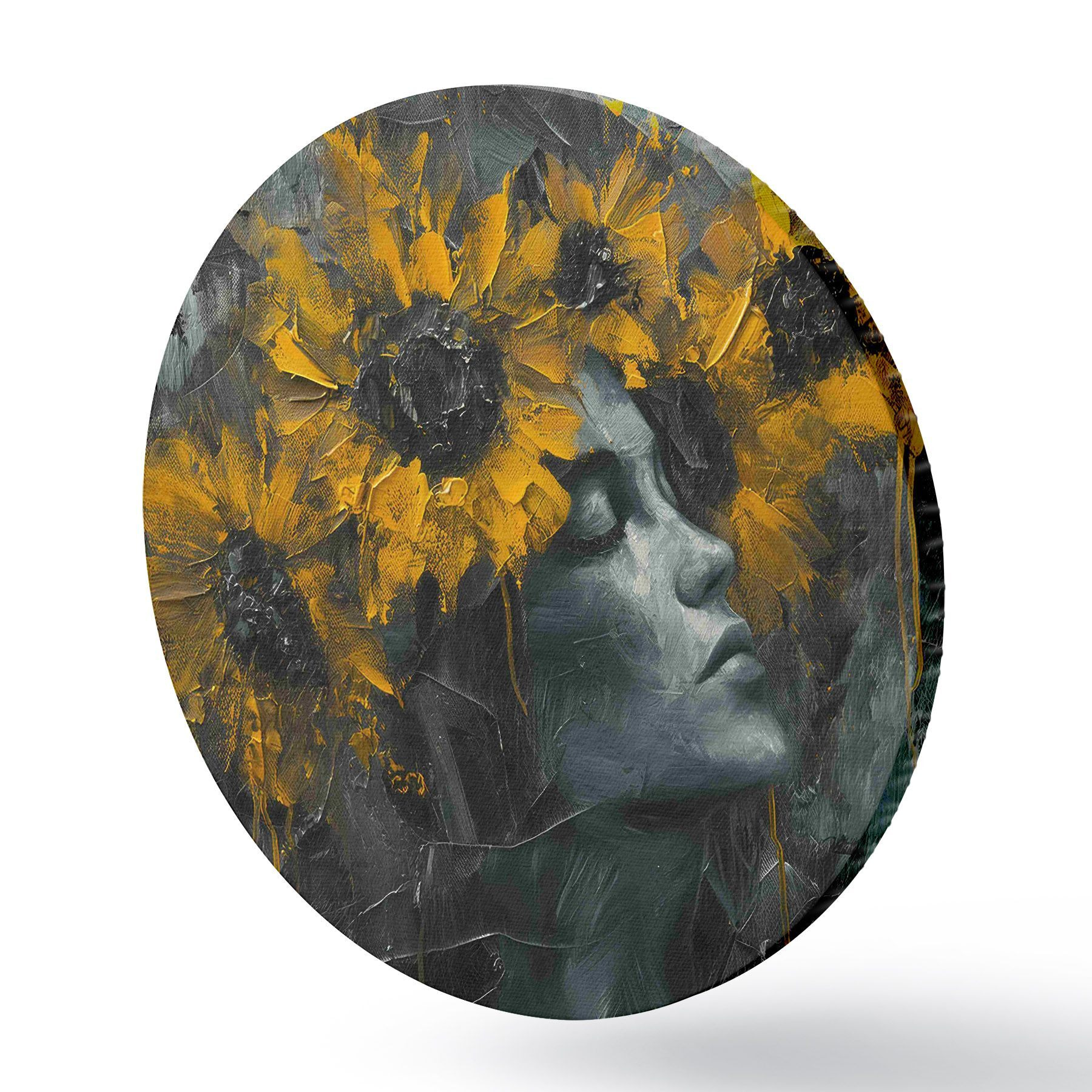 Tableaux ronds Visage de femme en nuances de gris avec tournesols r40500