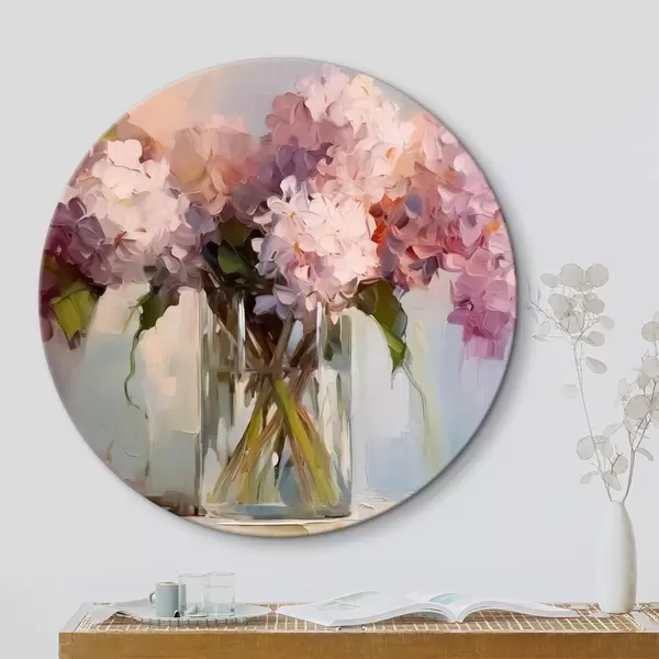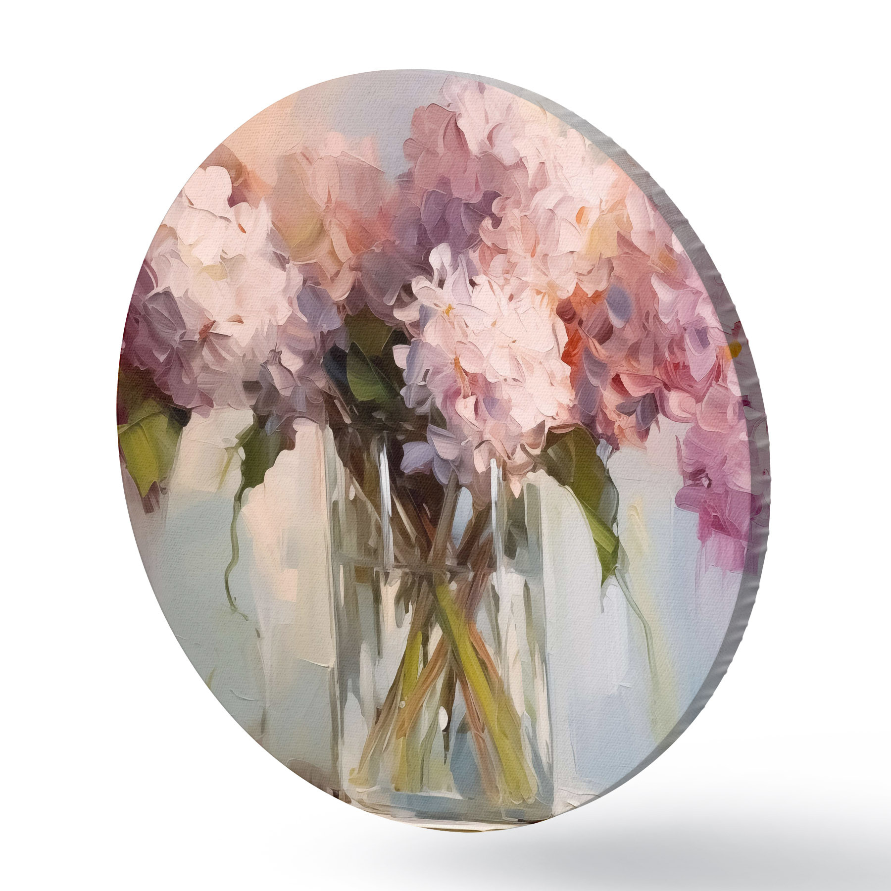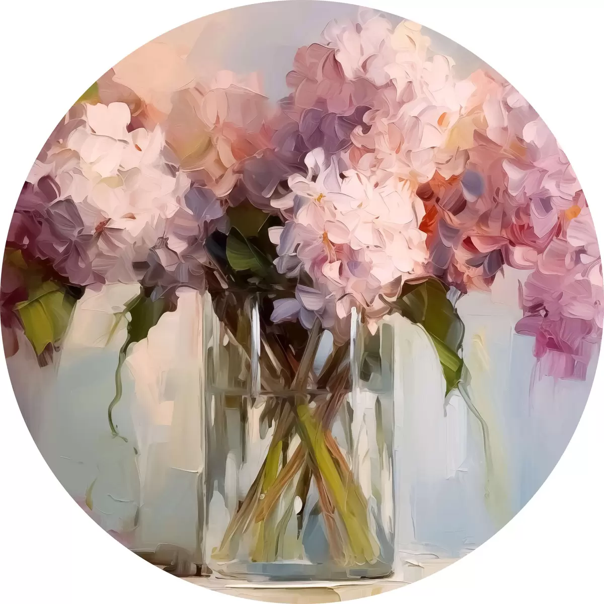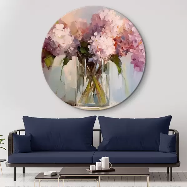 Tableaux ronds Un bouquet de jacinthes dans un grand vase en verre, couleurs pastel r40529