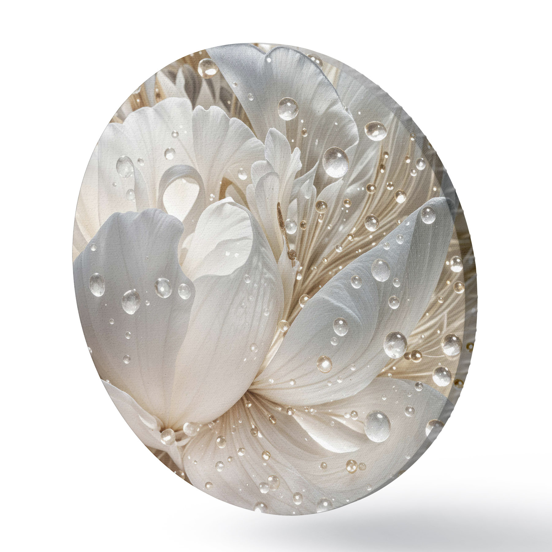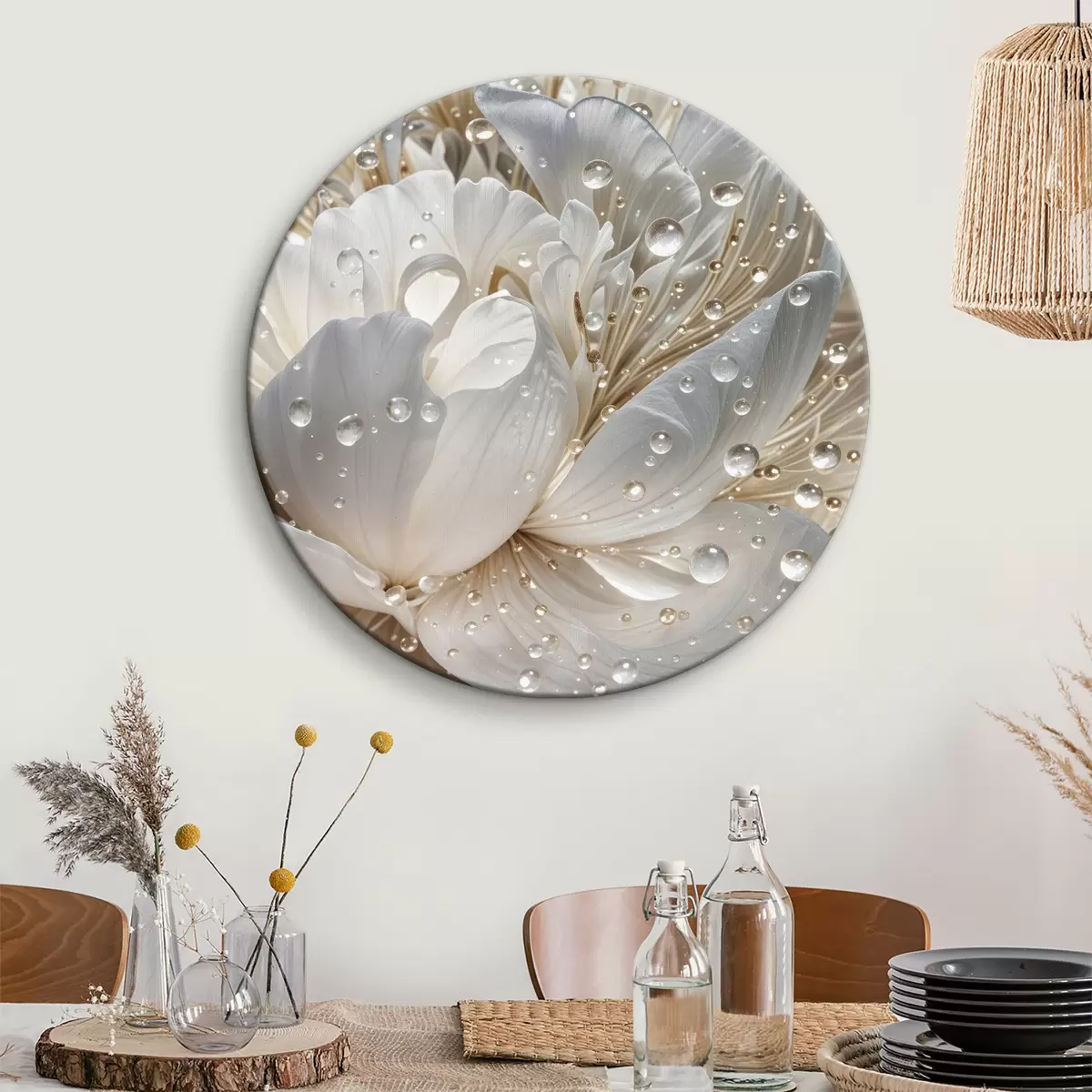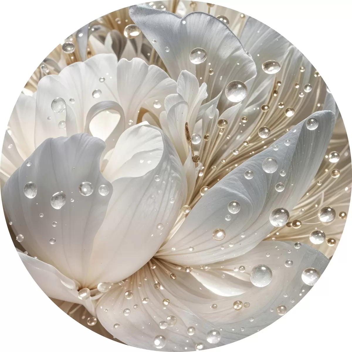 Tableaux ronds Gros plan d'une fleur de pivoine blanche avec des gouttes d'eau sur les pétales, sur fond flou r40539