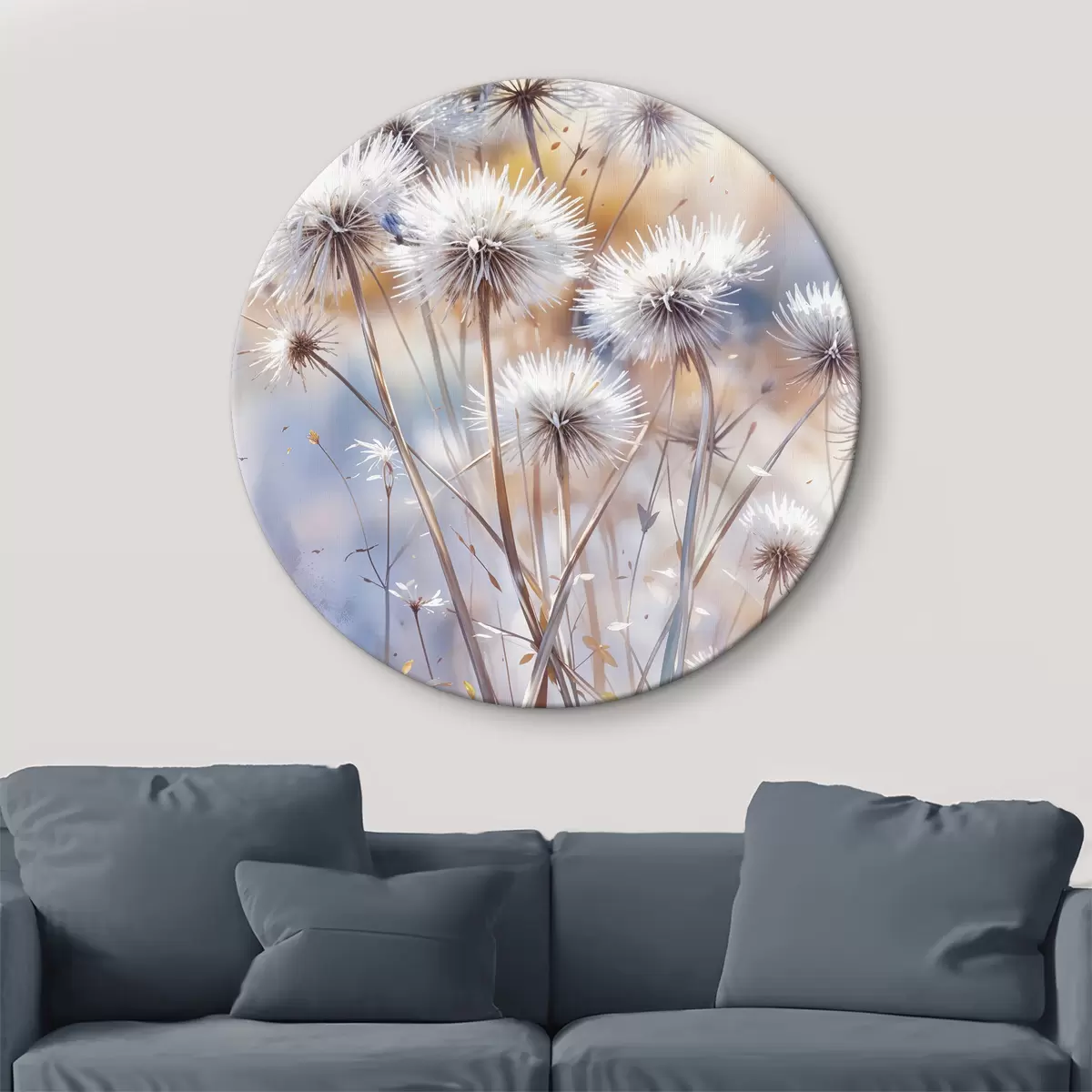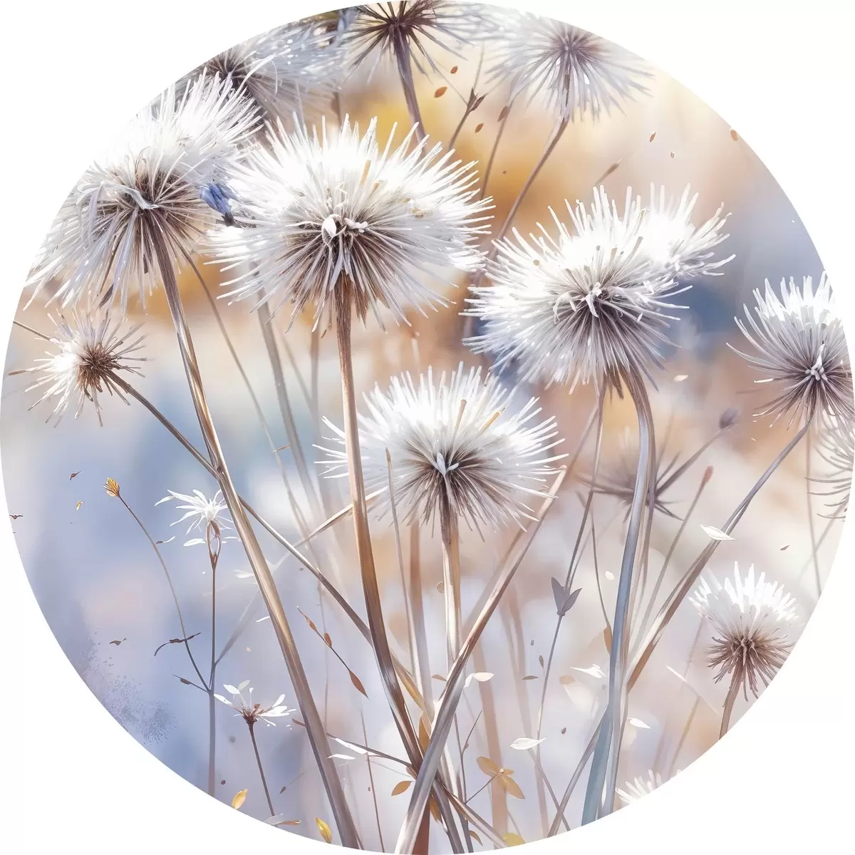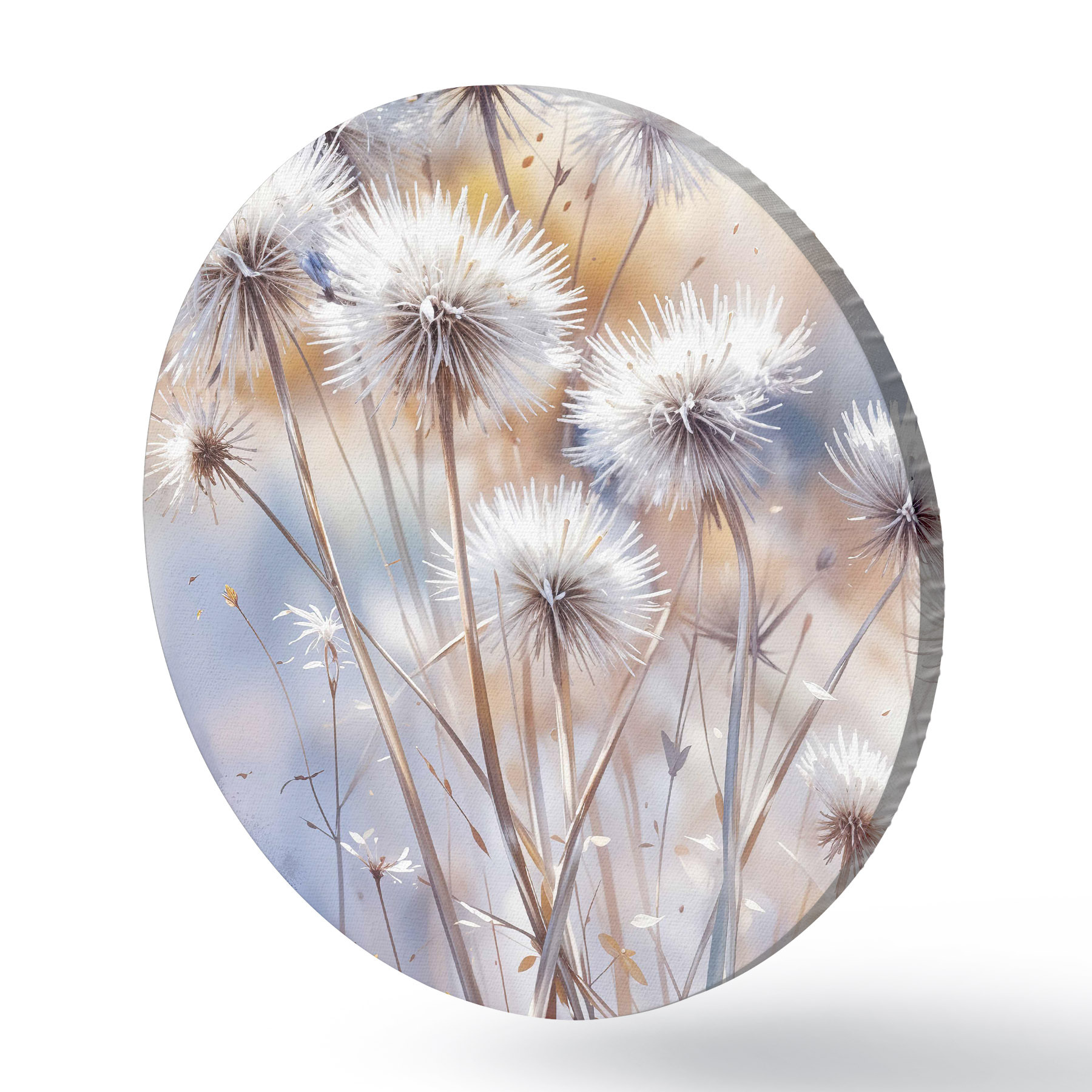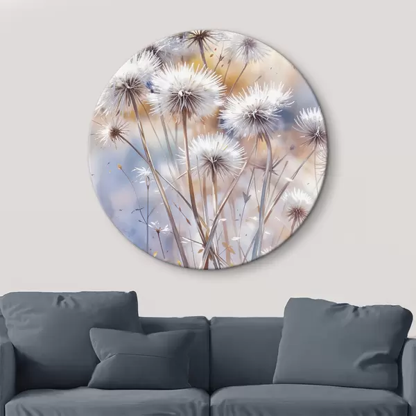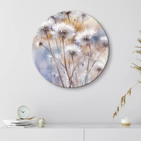 Tableaux ronds Fleurs de pissenlit blanches et touffues sur un fond d'aquarelle flou avec un éclairage chaud r40541