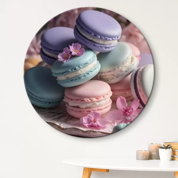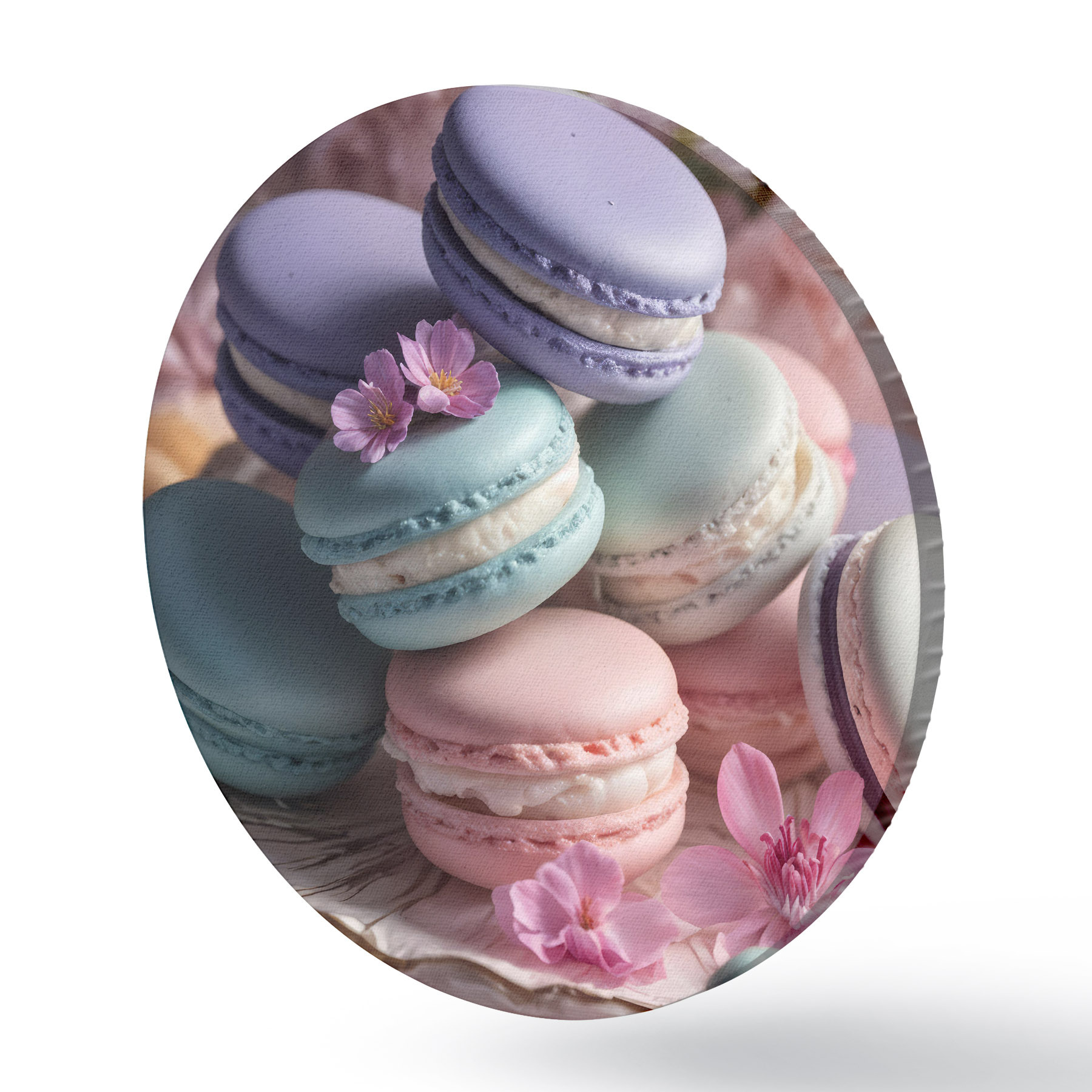 Tableaux ronds Macarons colorés avec des fleurs roses et violettes sur une assiette, gros plan r40546