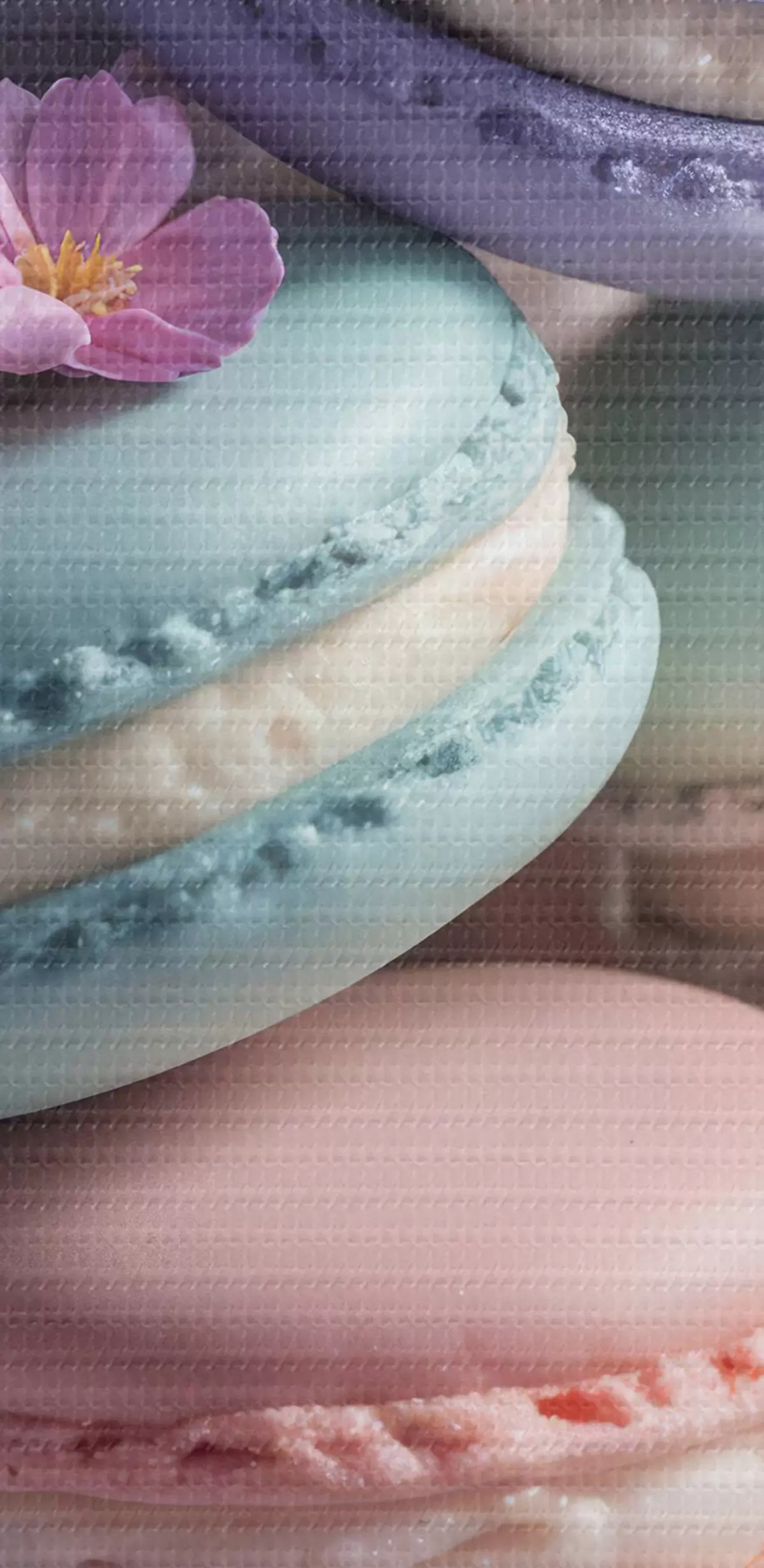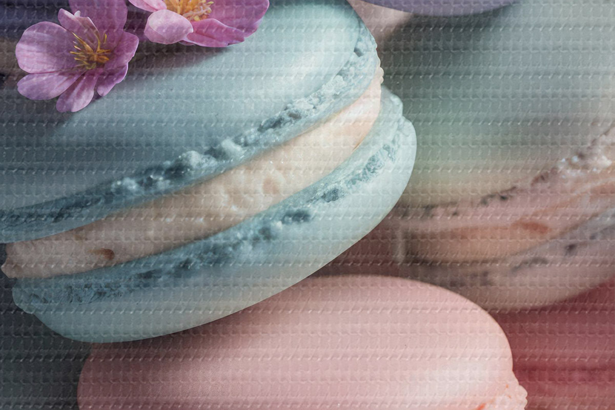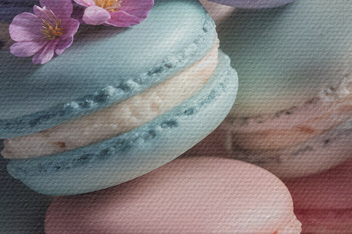 Image Macarons colorés avec des fleurs roses et violettes sur une assiette, gros plan Nr r40546
