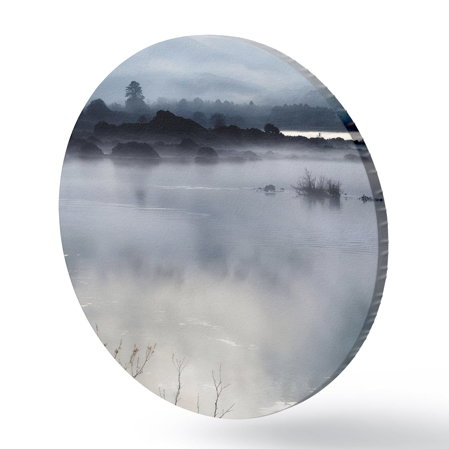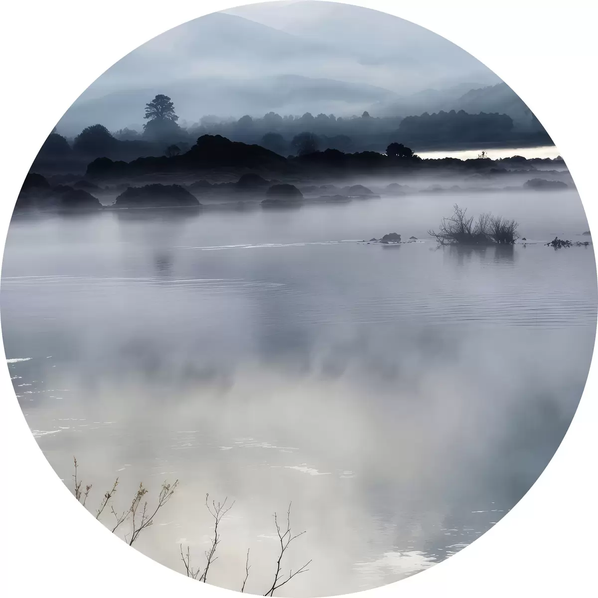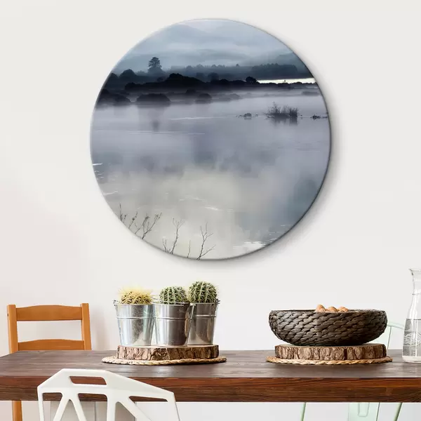 Tableaux ronds Un lac brumeux entouré de silhouettes de collines et d'arbres en arrière-plan, avec une surface calme et réfléchissante r40552