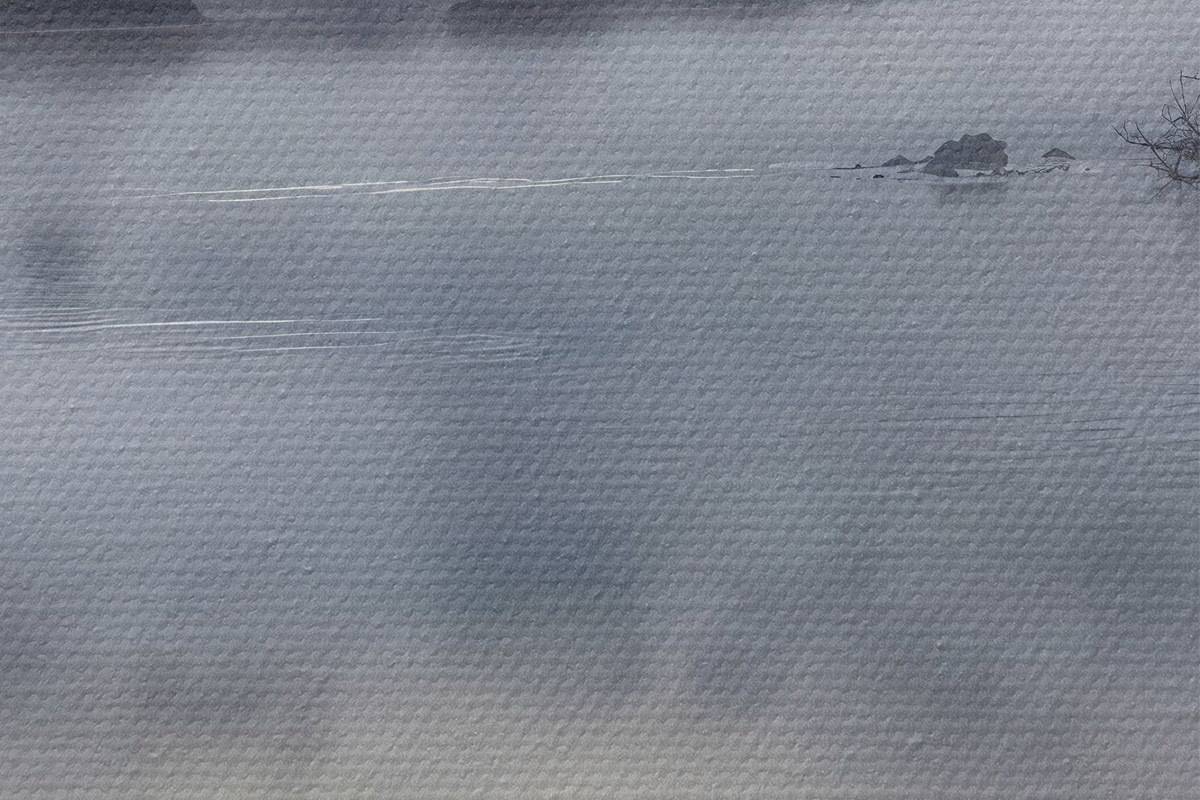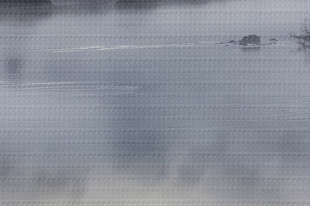 Image Un lac brumeux entouré de silhouettes de collines et d'arbres en arrière-plan, avec une surface calme et réfléchissante Nr r40552