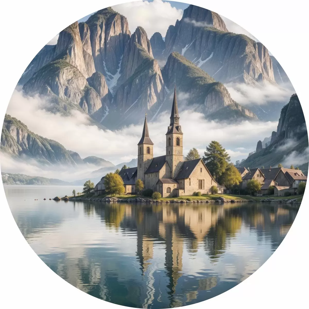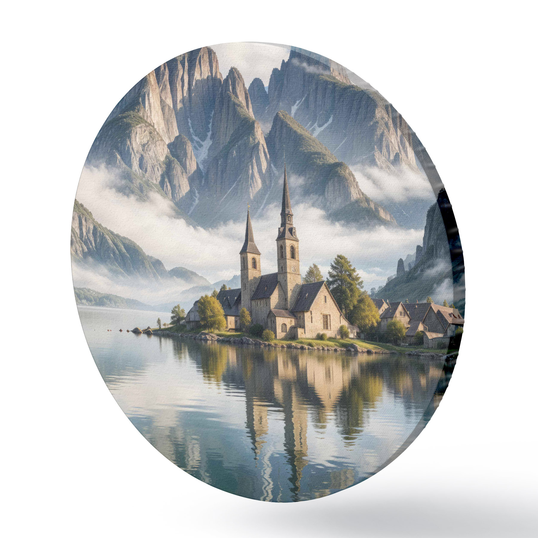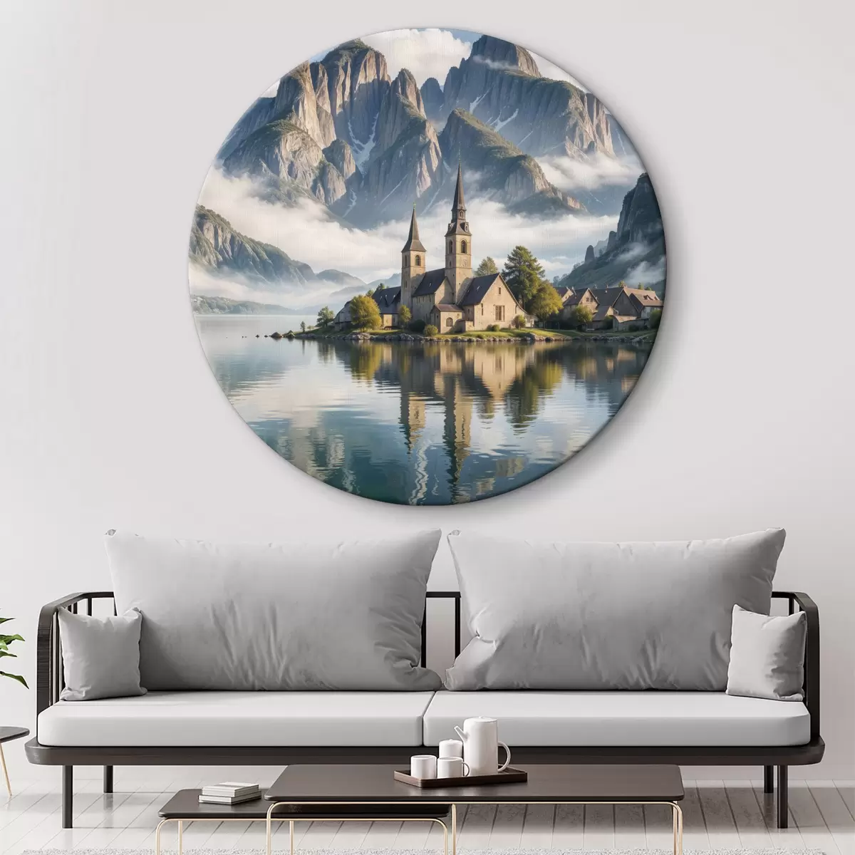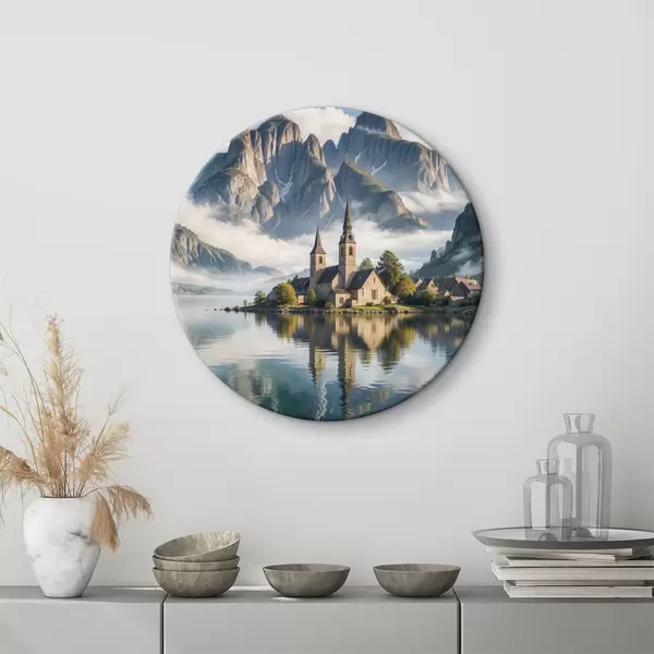 Tableaux ronds Un village alpin pittoresque situé au bord d'un lac tranquille et surplombé de montagnes enneigées r40554