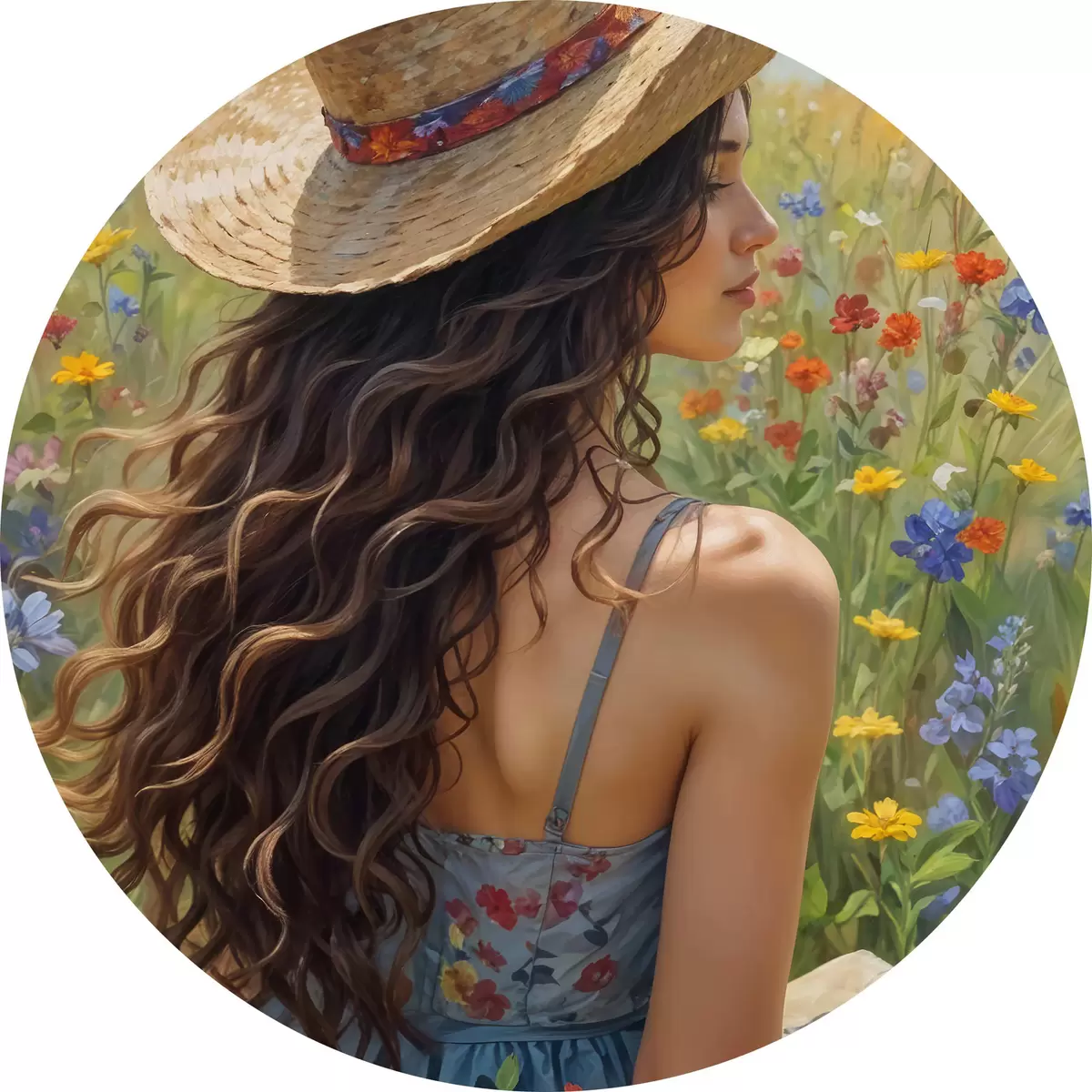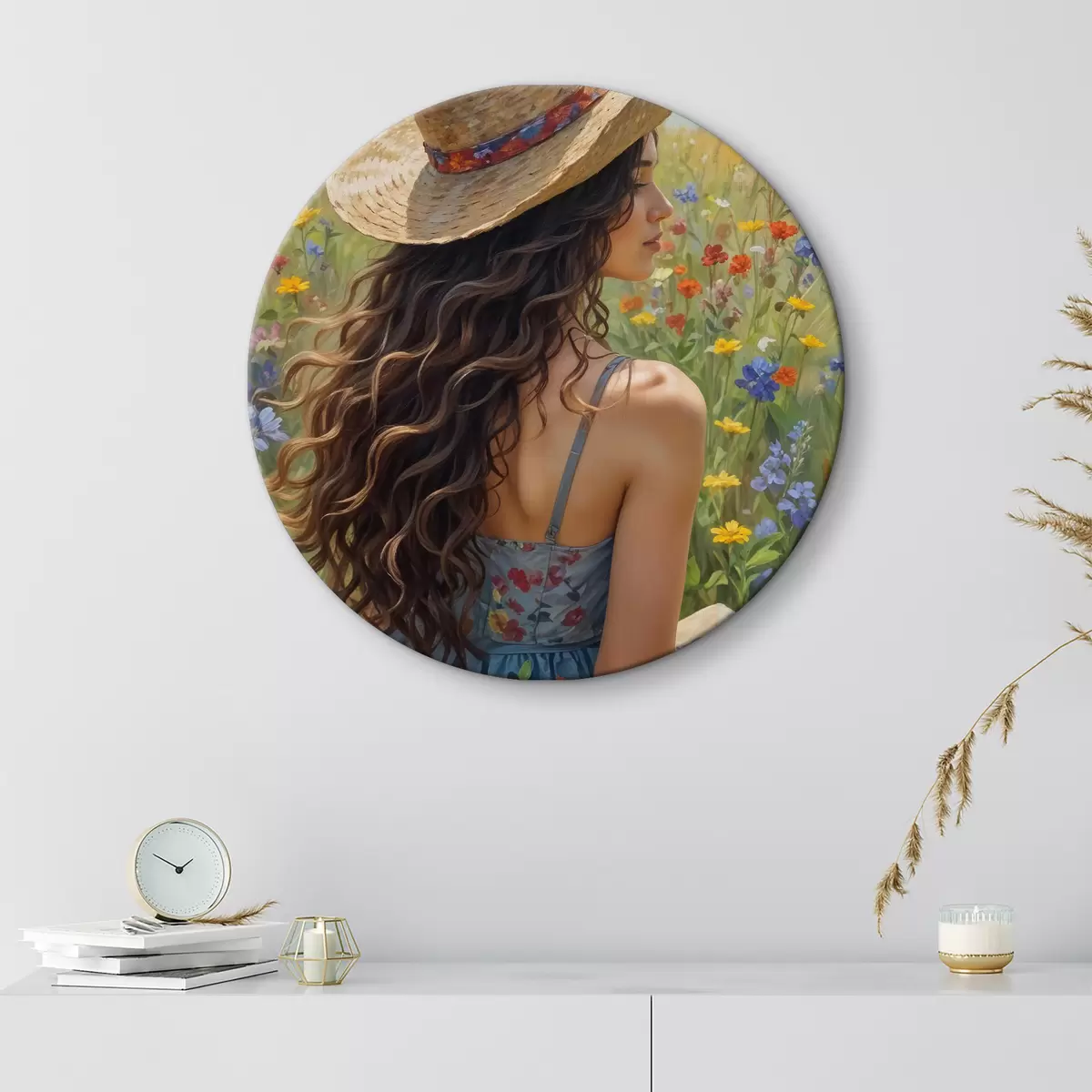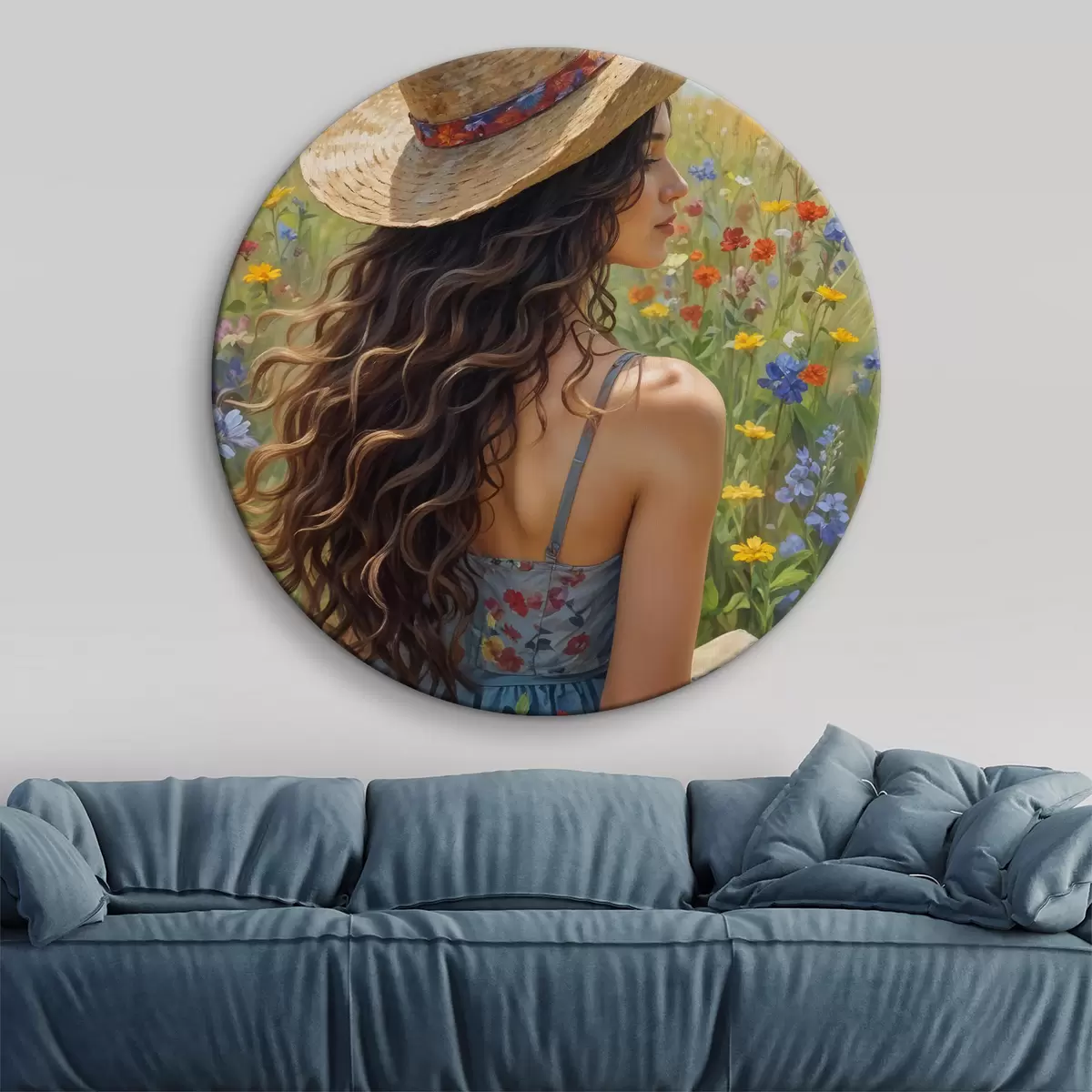 Tableaux ronds Jeune femme aux cheveux bouclés, portant un chapeau de paille et une robe à fleurs, debout dans un champ de fleurs sauvages r40560