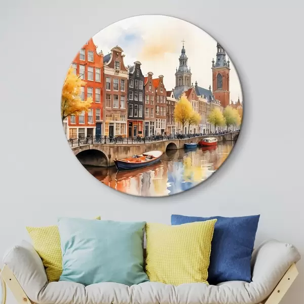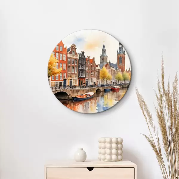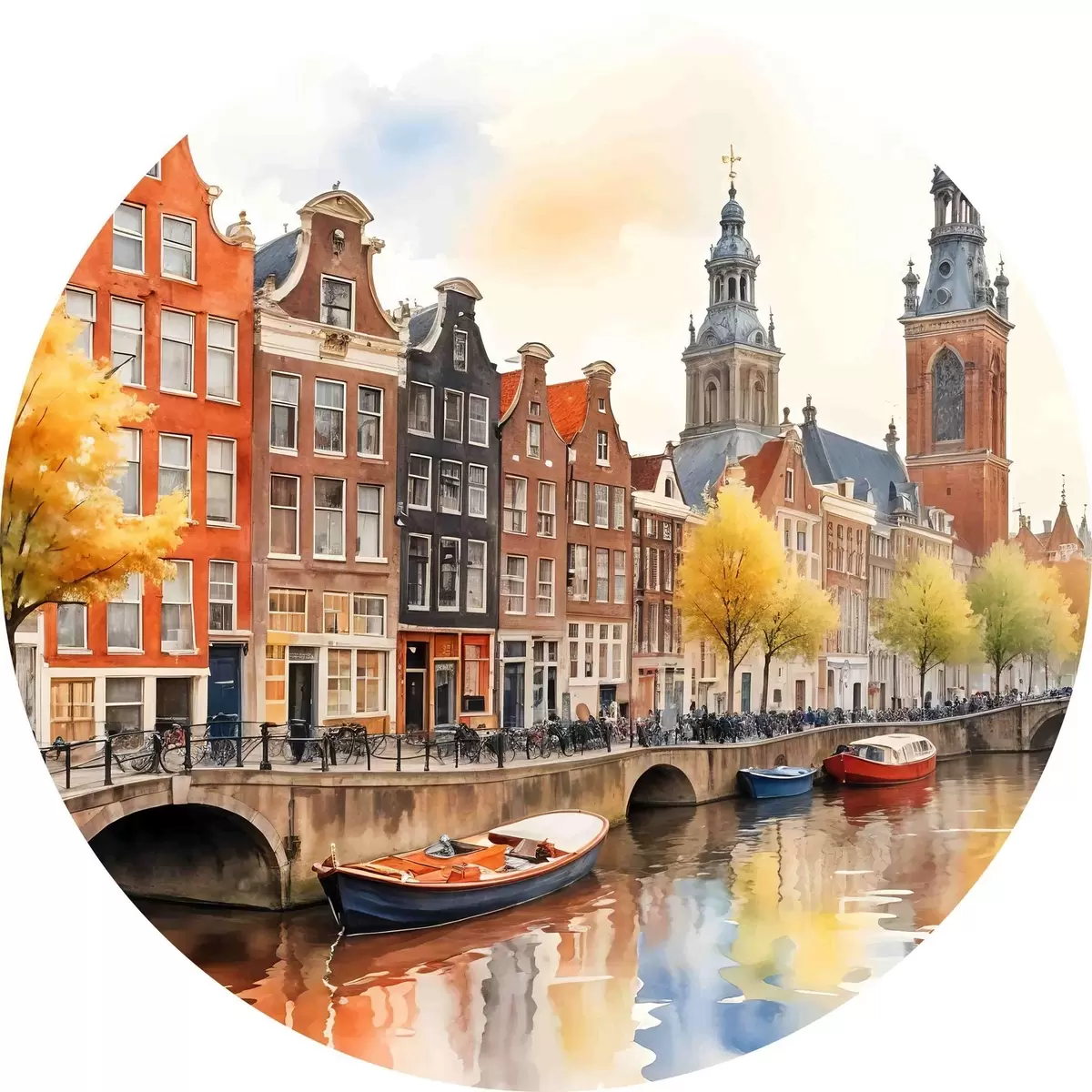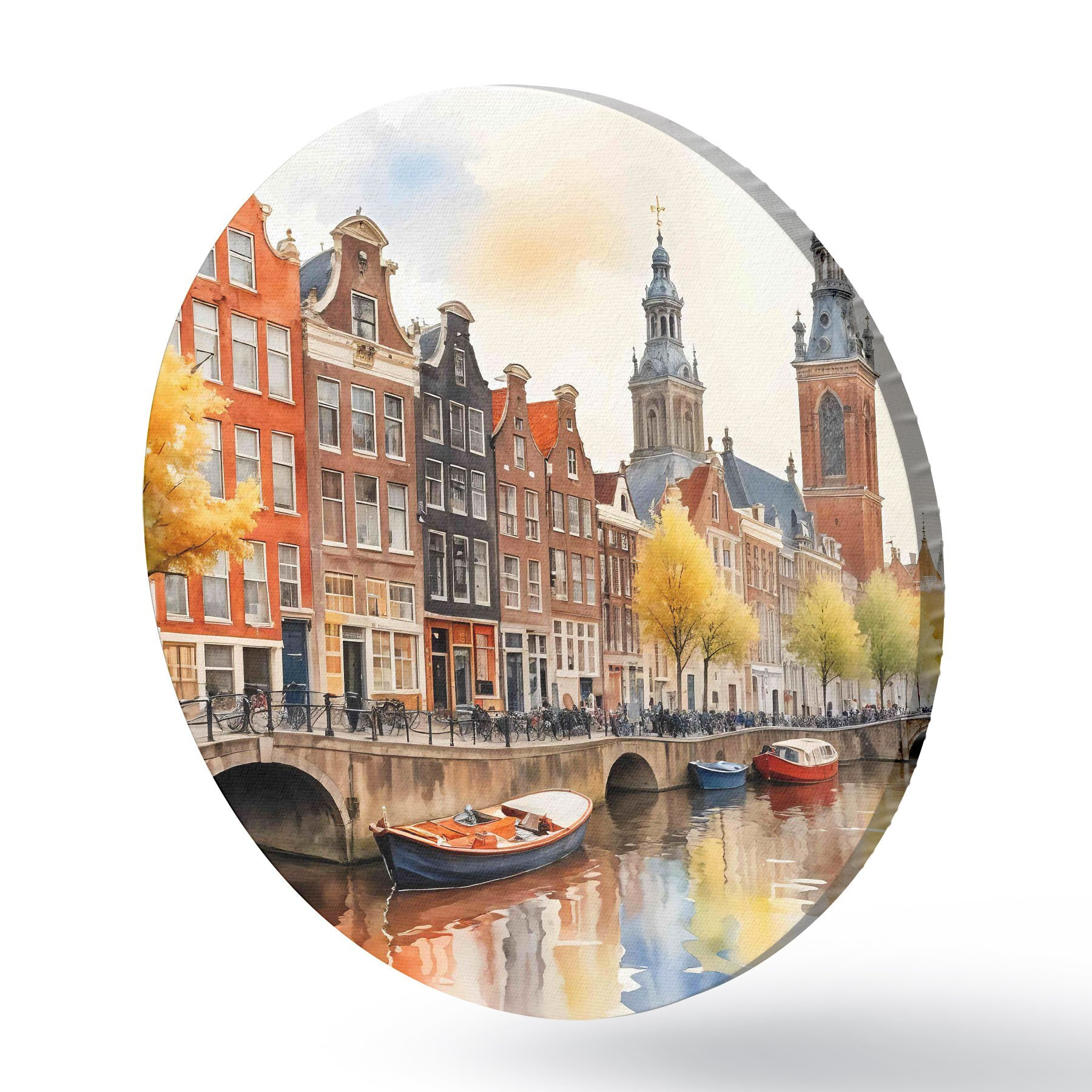 Tableaux ronds Aquarelle colorée d'Amsterdam avec des maisons hollandaises traditionnelles sur les canaux et des bateaux sur l'eau r40561