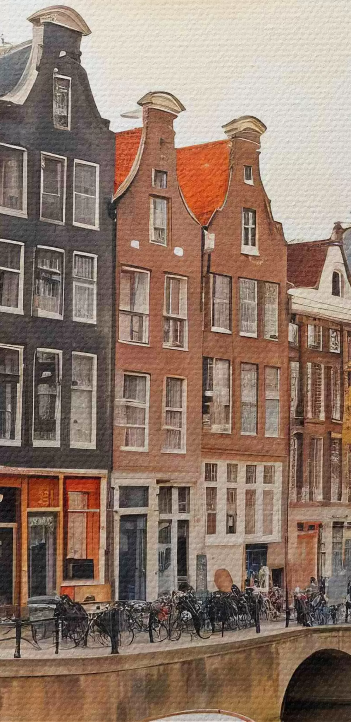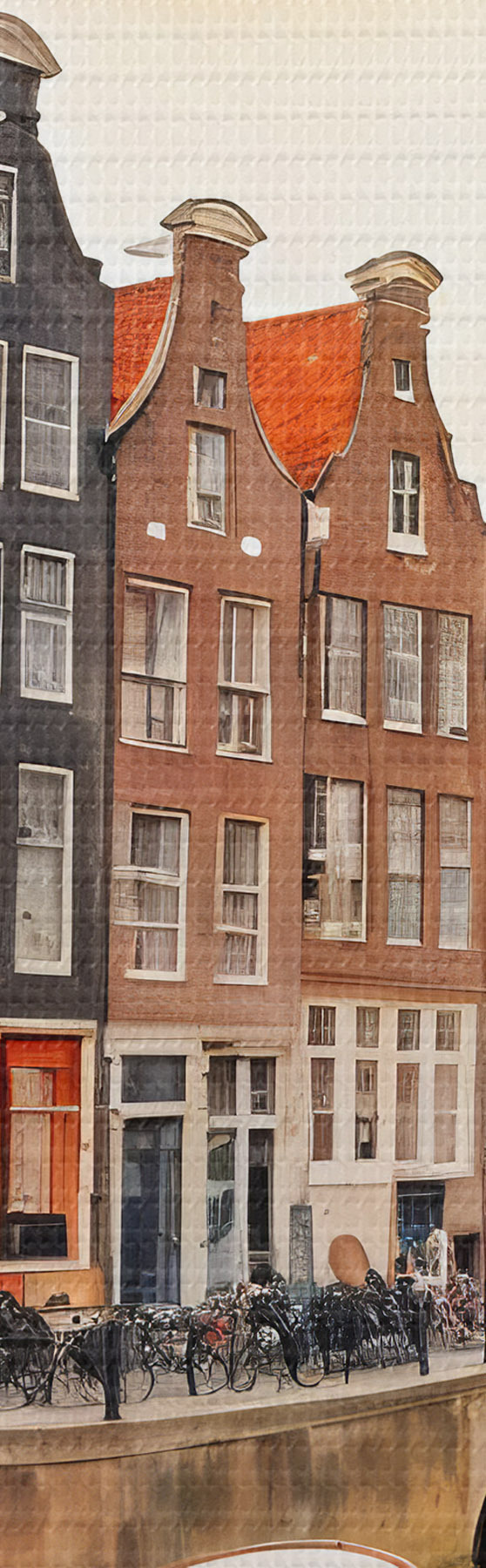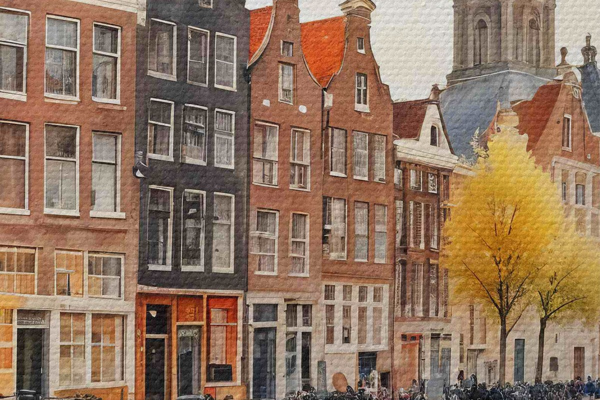 Image Aquarelle colorée d'Amsterdam avec des maisons hollandaises traditionnelles sur les canaux et des bateaux sur l'eau Nr r40561