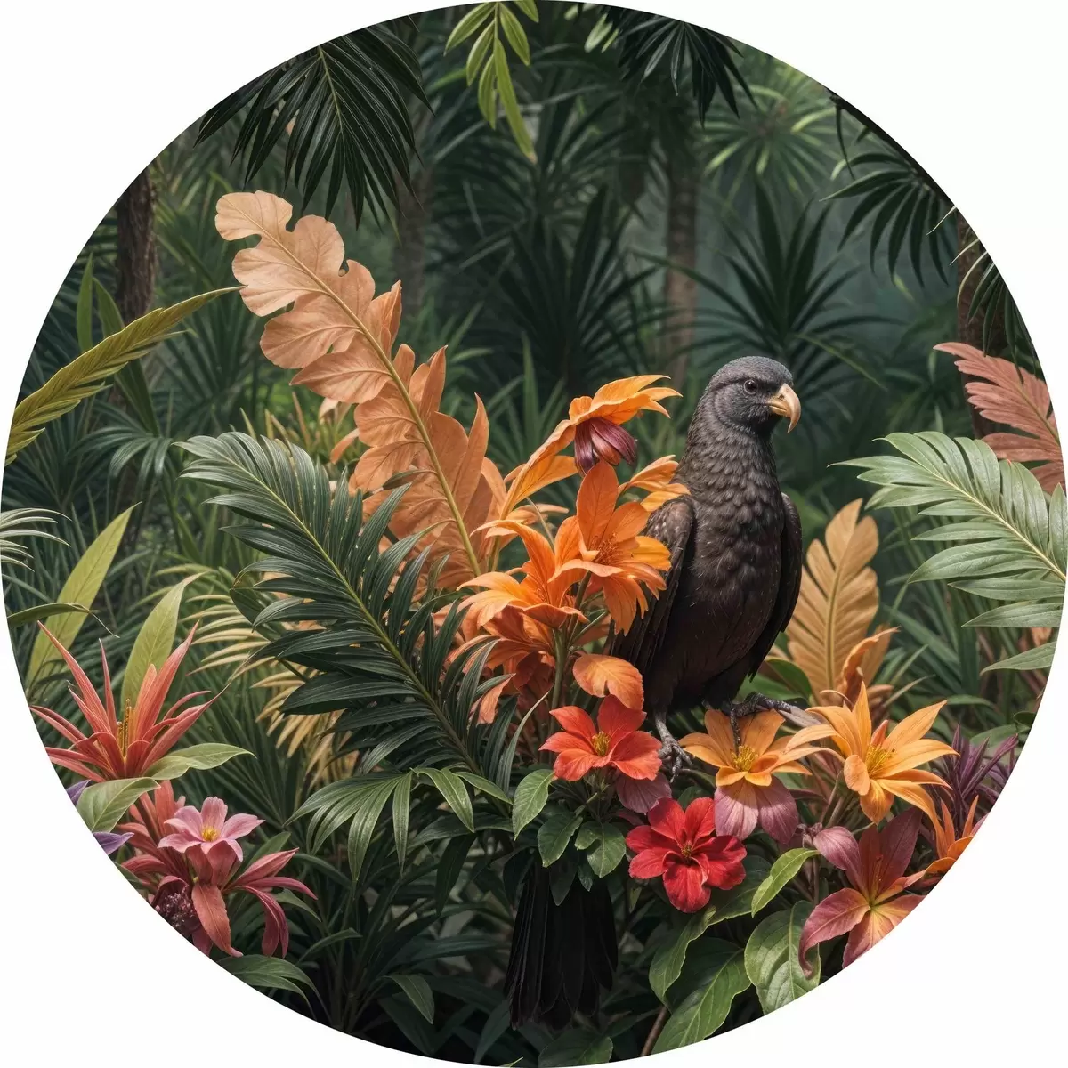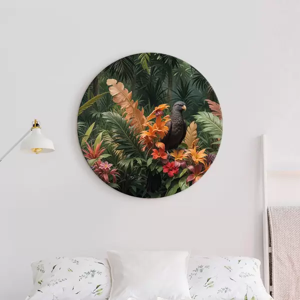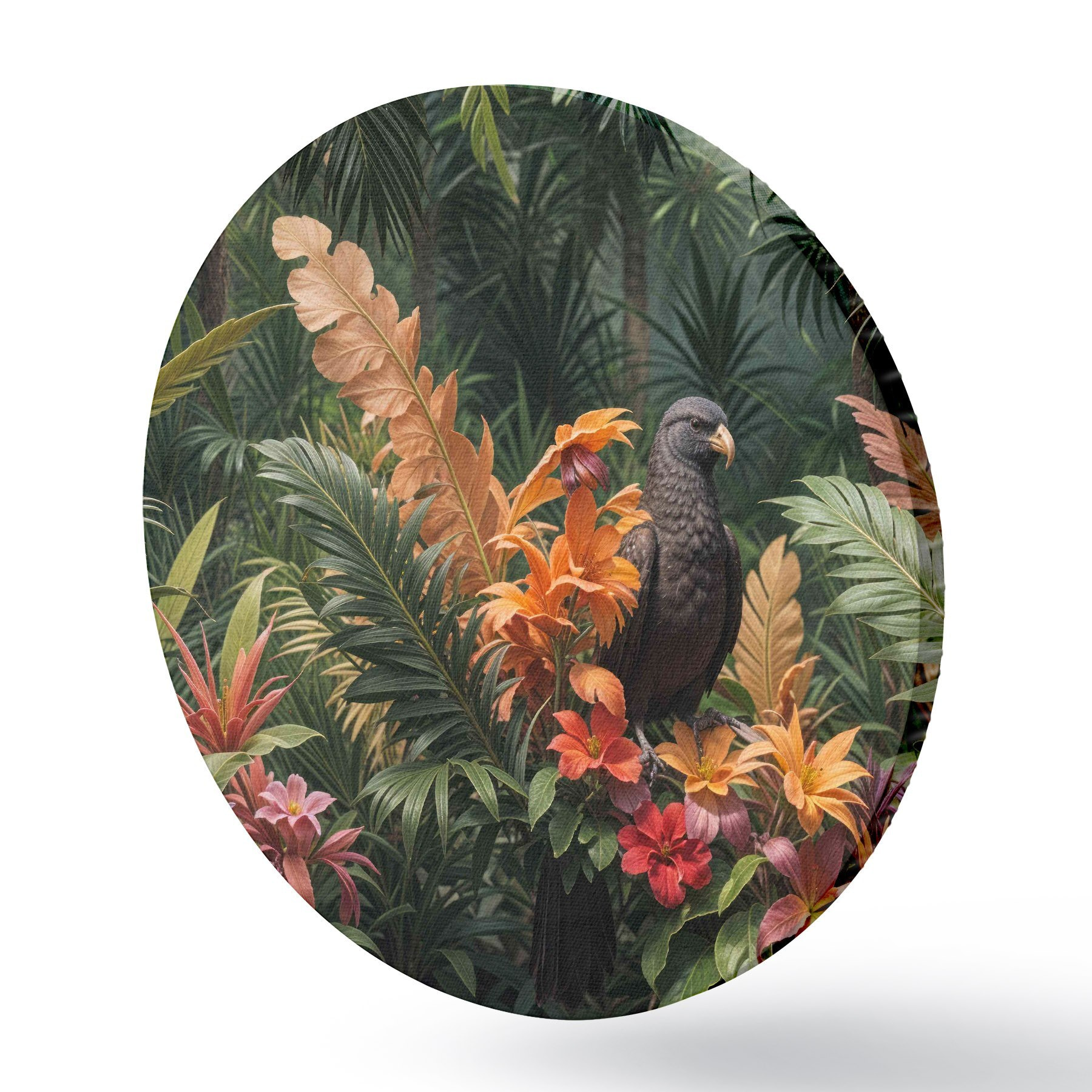 Tableaux ronds Oiseau tropical assis sur une branche entouré d'une végétation luxuriante, de feuilles de palmier, de fleurs et de plantes exotiques r40578