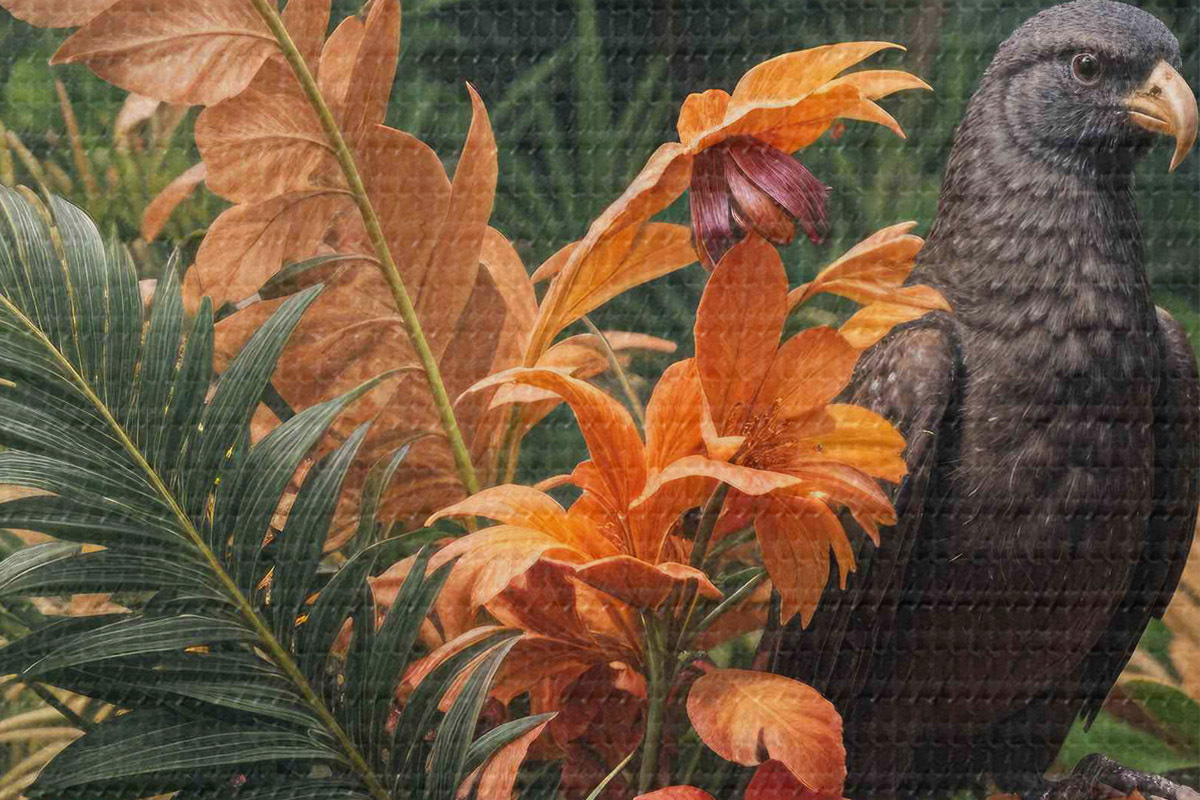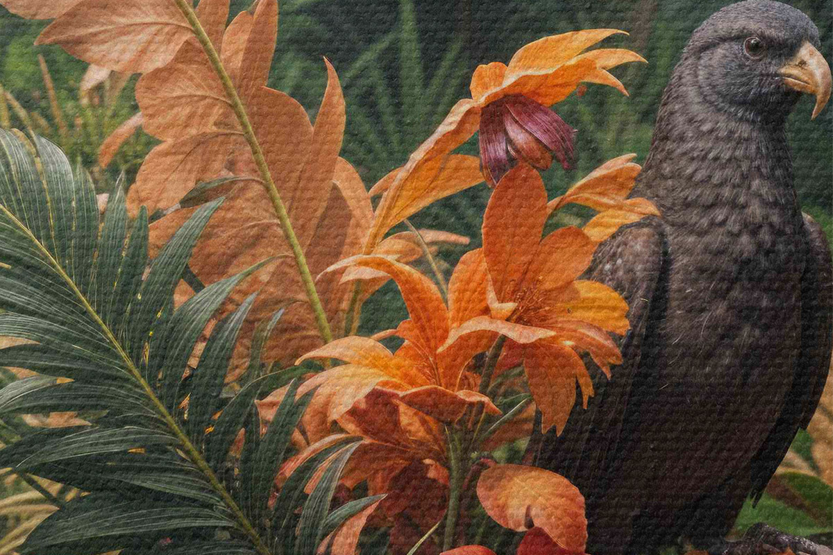 Image Oiseau tropical assis sur une branche entouré d'une végétation luxuriante, de feuilles de palmier, de fleurs et de plantes exotiques Nr r40578