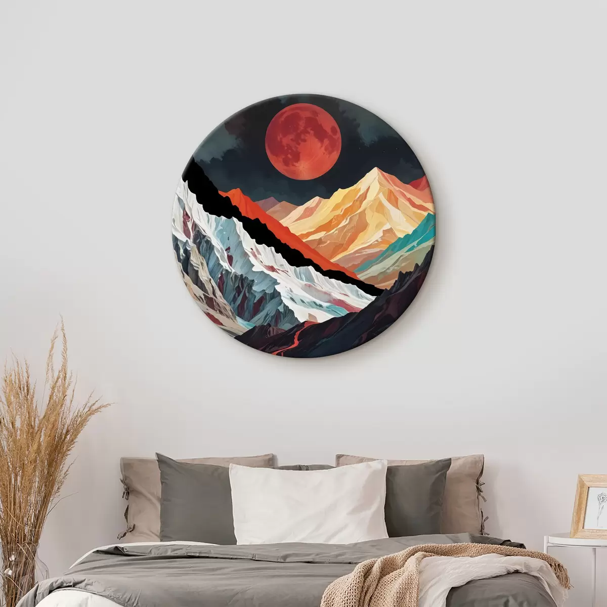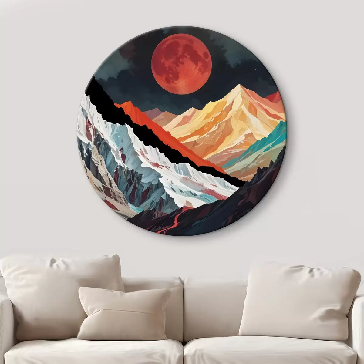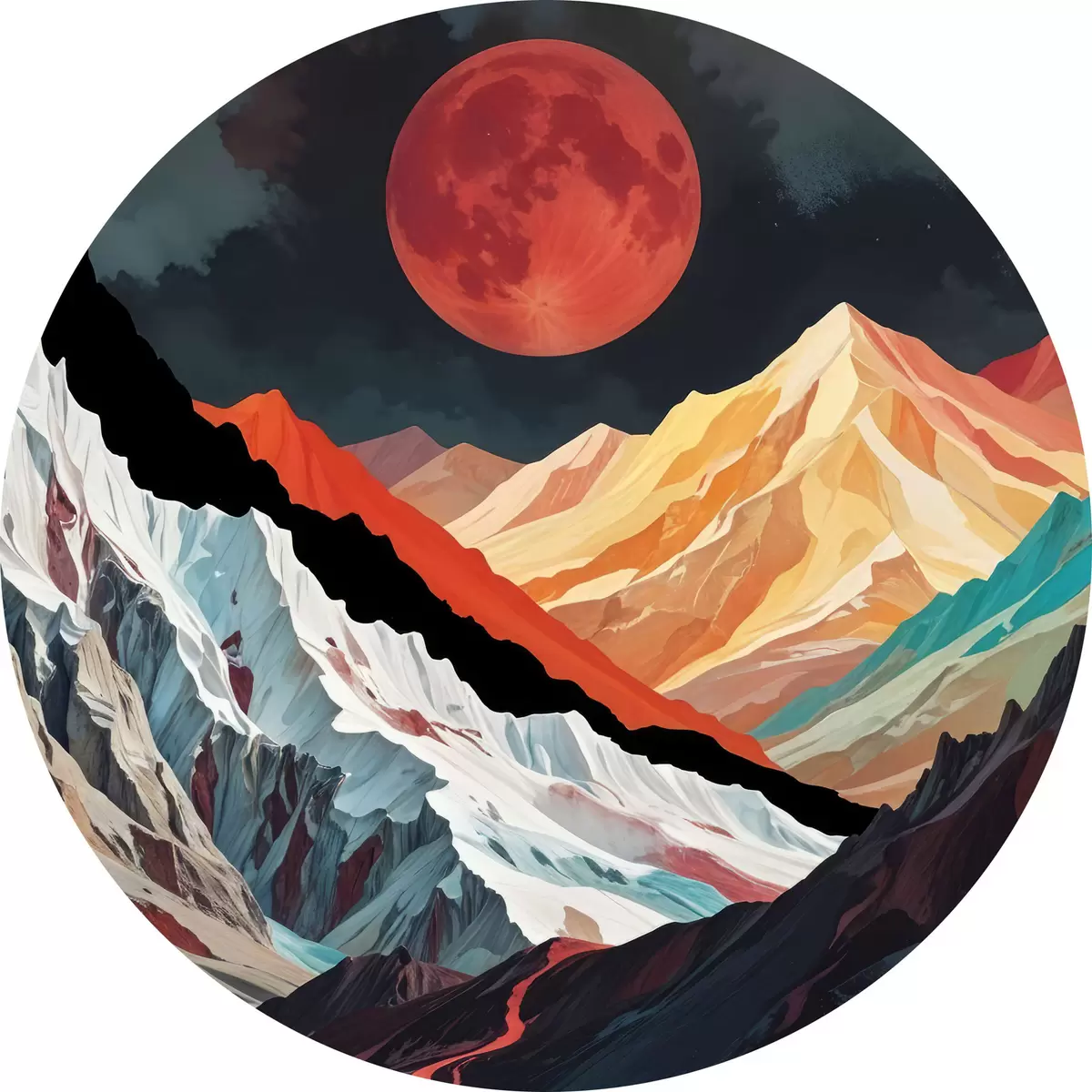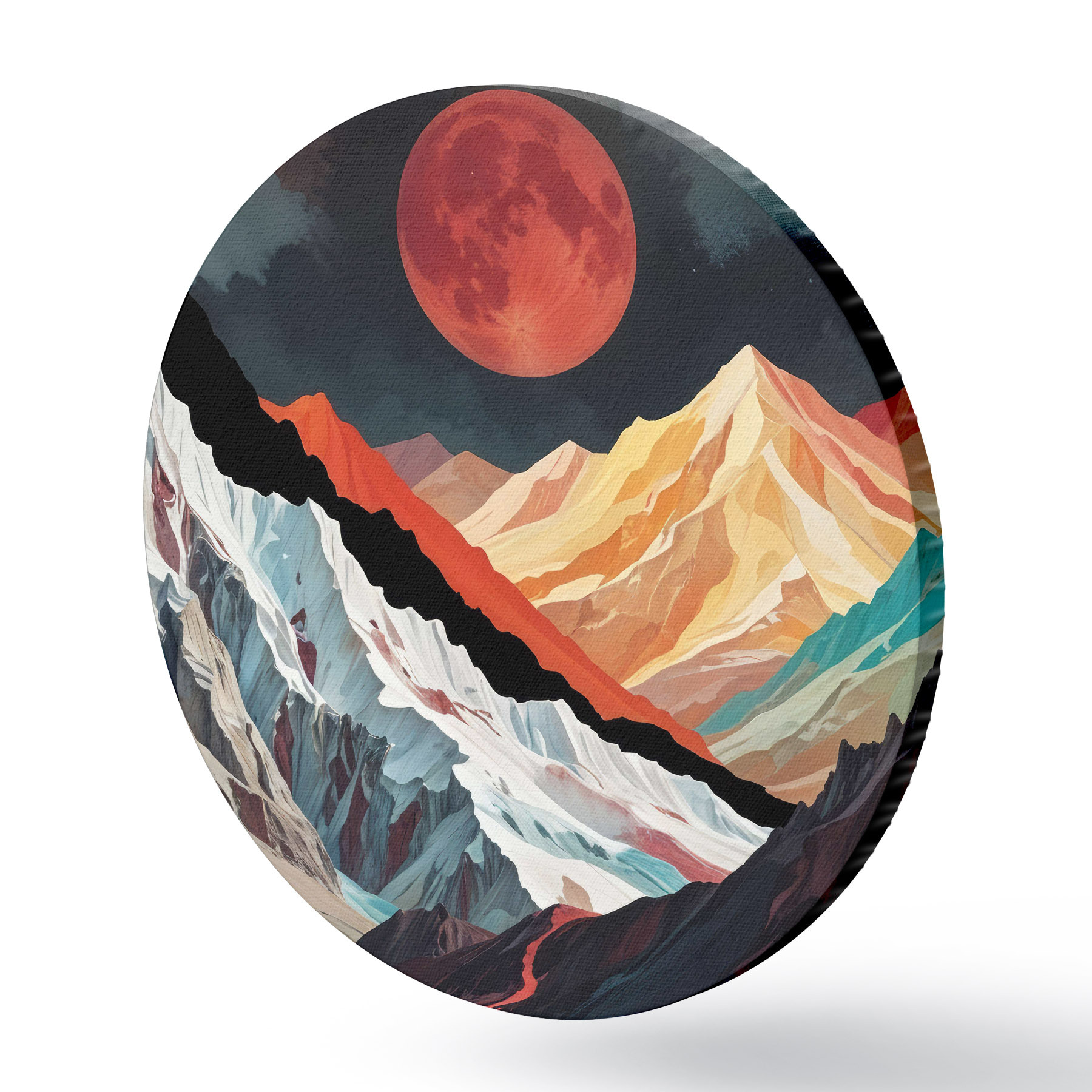Tableaux ronds Paysage surréaliste avec de hautes montagnes déchiquetées sous une grande lune rougeoyante dans un ciel sombre et nuageux r40589