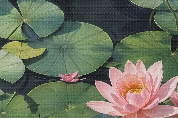 Image Un étang avec des nénuphars roses et des pétales de nénuphars verts flottant à la surface, entouré d'un arrière-plan sombre Nr r40598