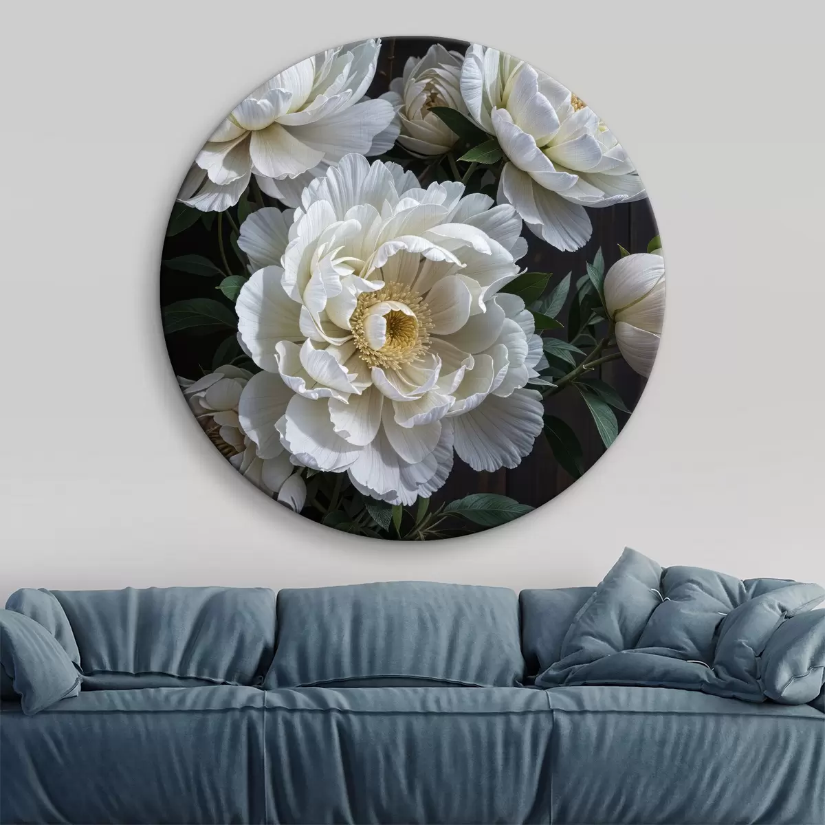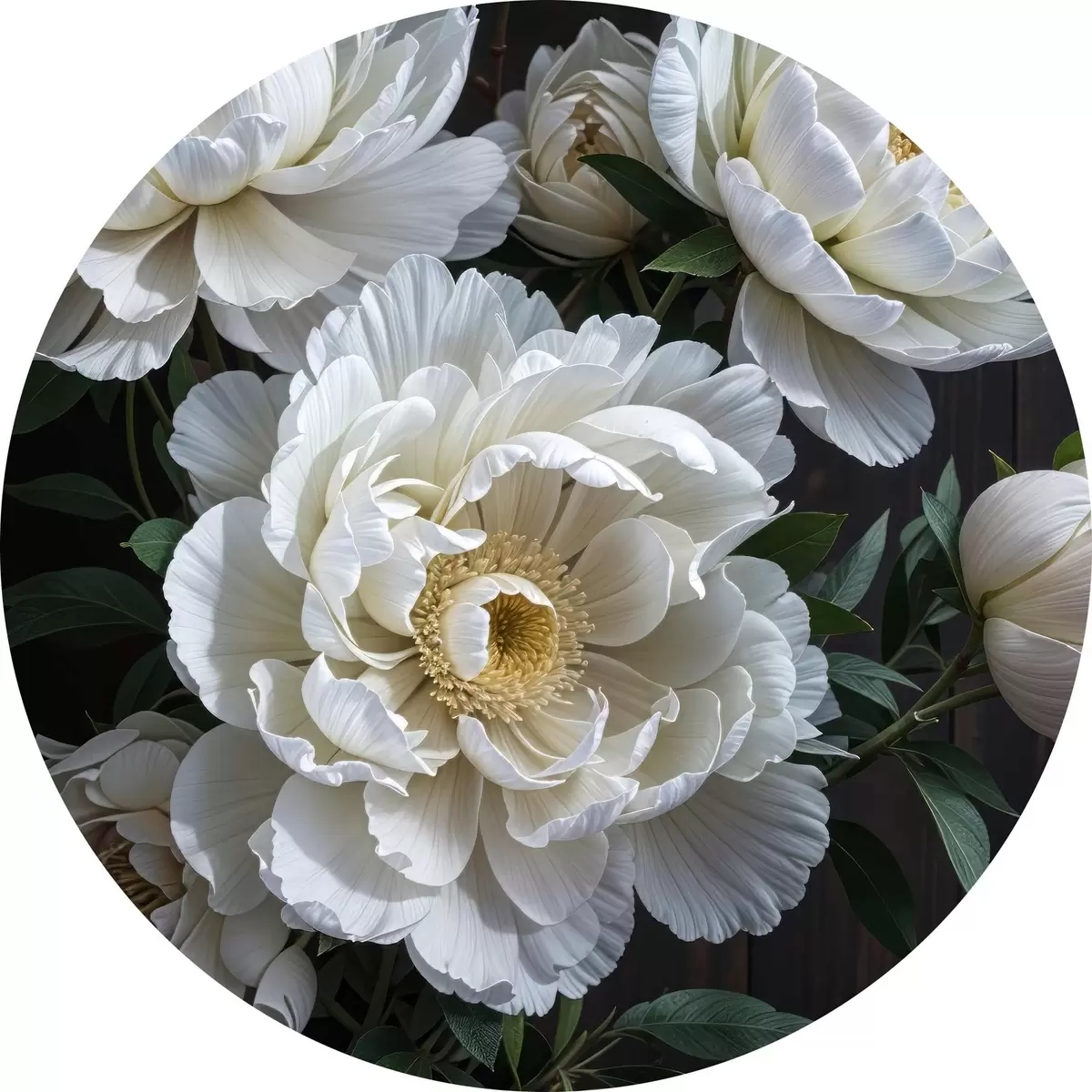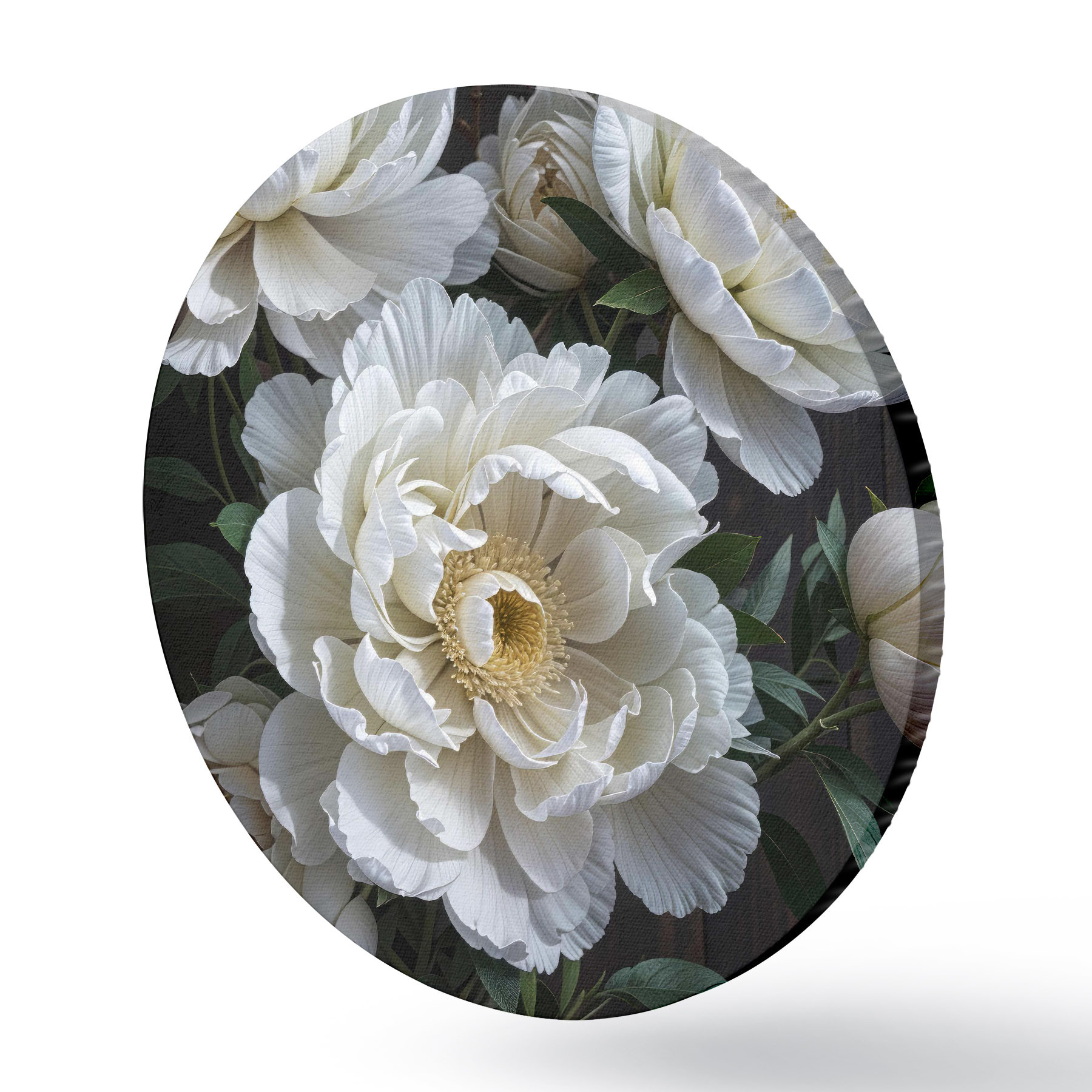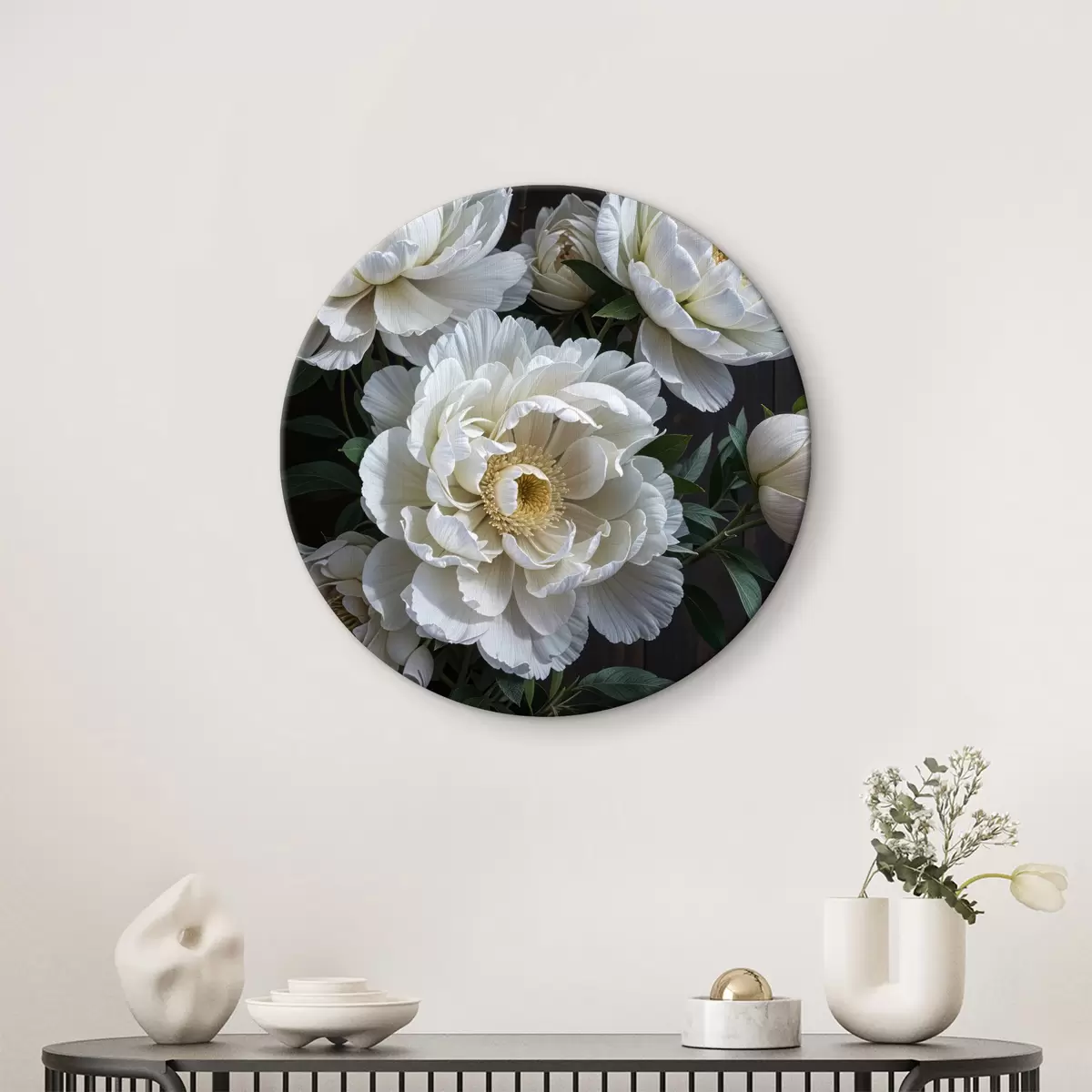 Tableaux ronds Fleurs de pivoines blanches à centre jaune s'épanouissant dans le jardin sur fond sombre r40600