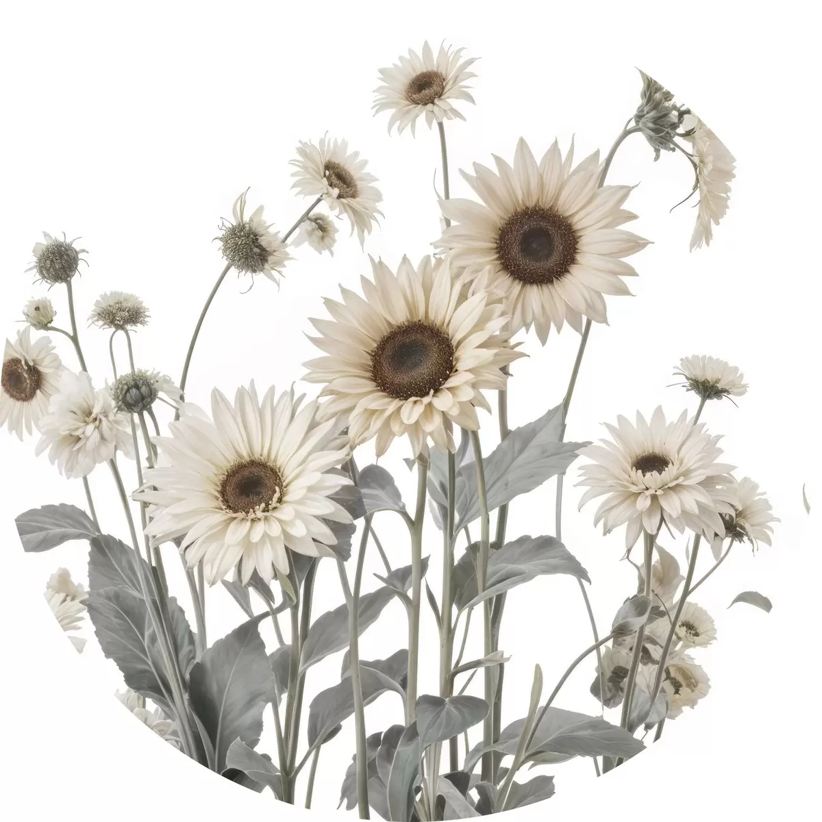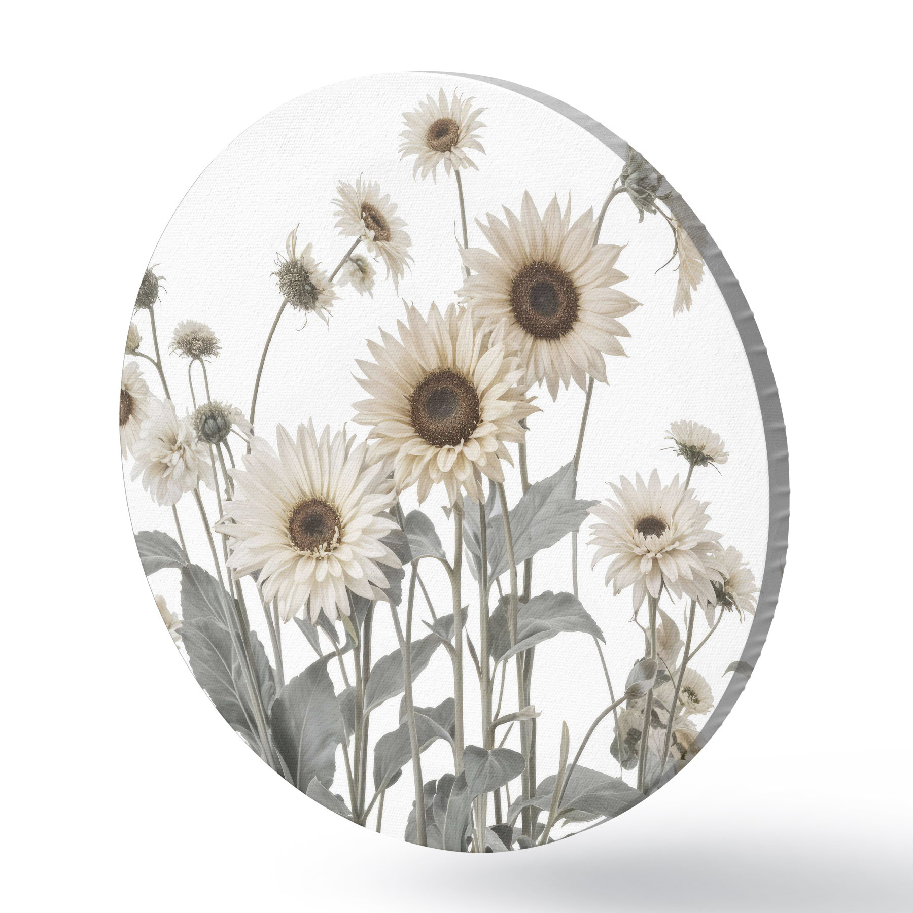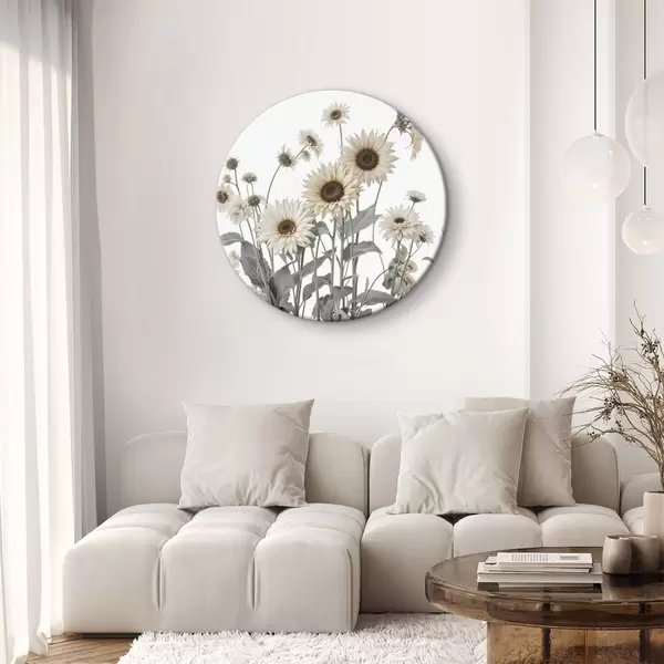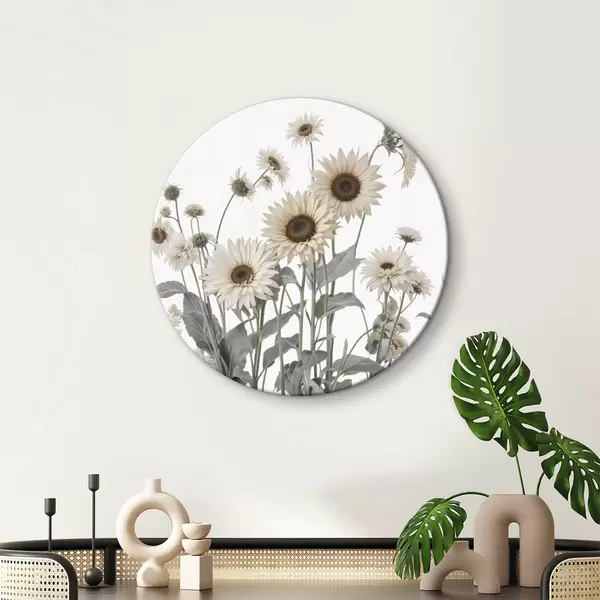 Tableaux ronds Champ de marguerites blanches sur fond blanc, avec des tournesols visibles à l'arrière-plan r40602
