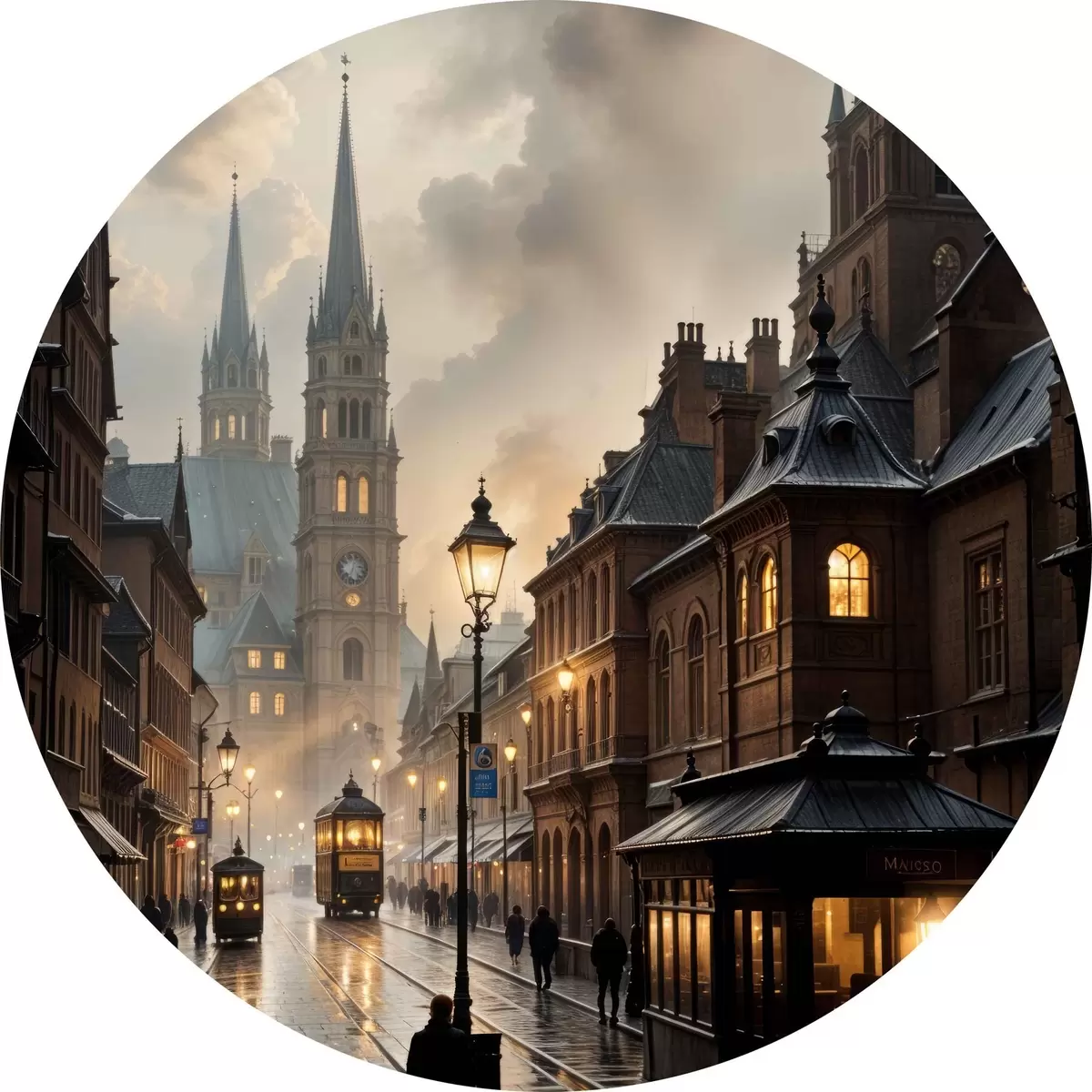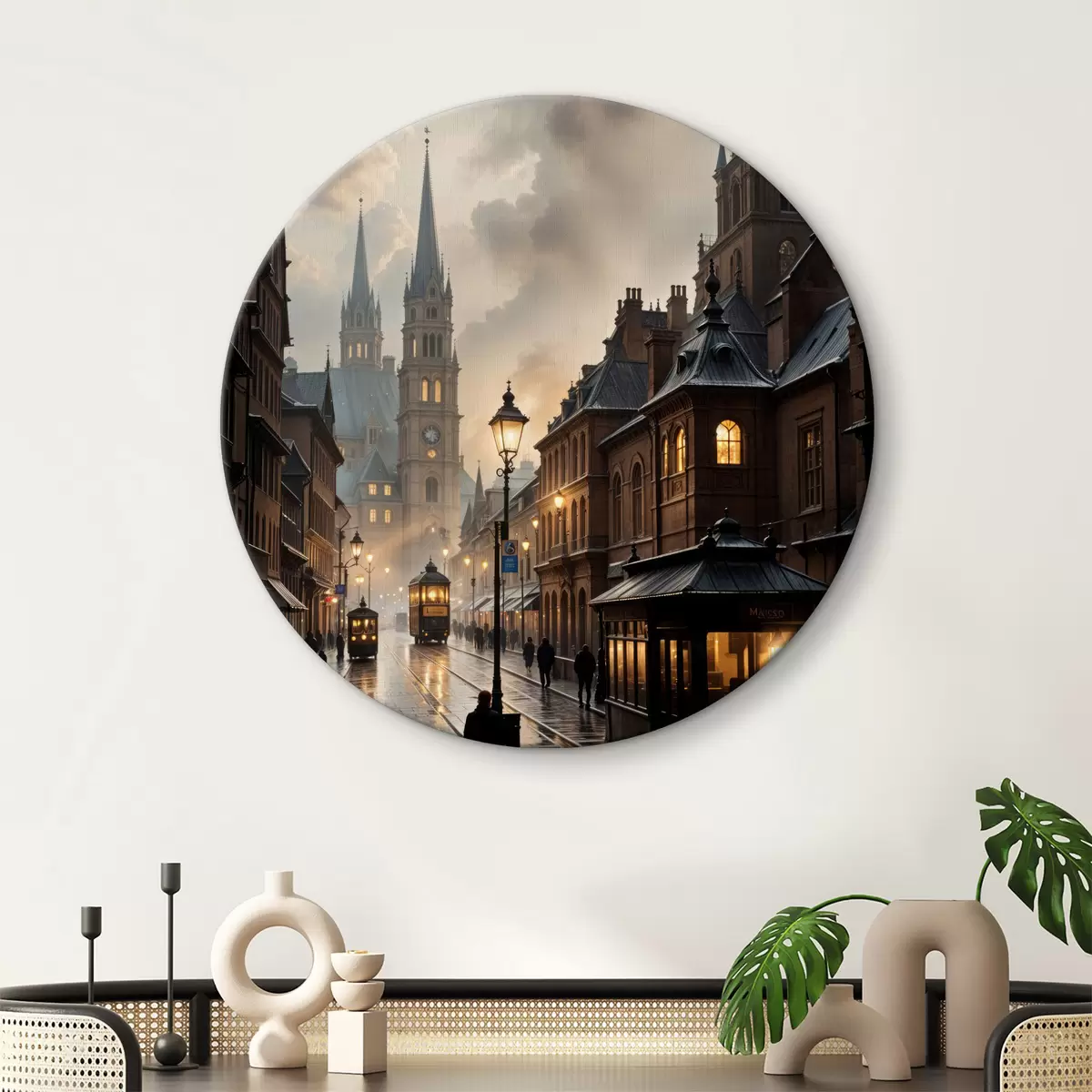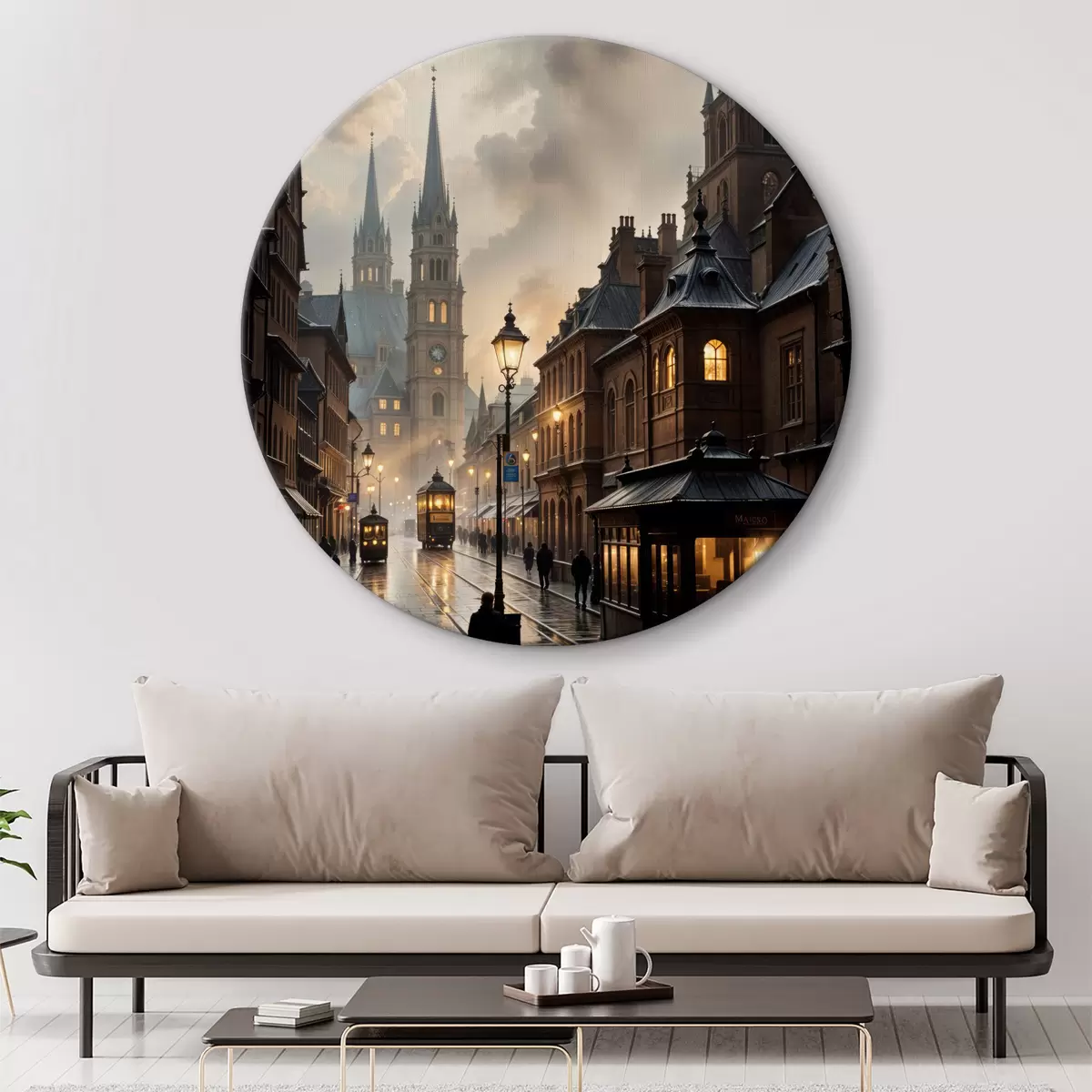 Tableaux ronds Soirée pluvieuse dans une vieille ville européenne, avec des rues pavées, des bâtiments historiques et un tramway qui passe r40604