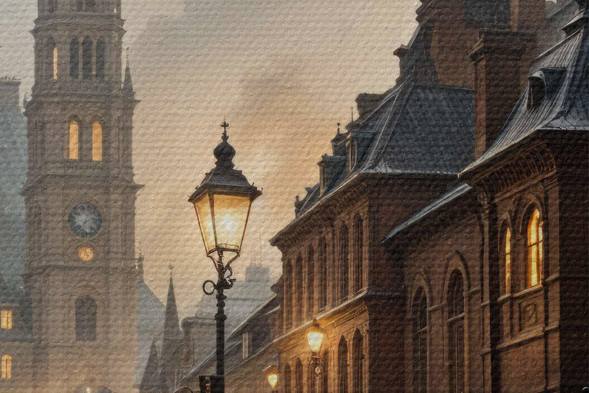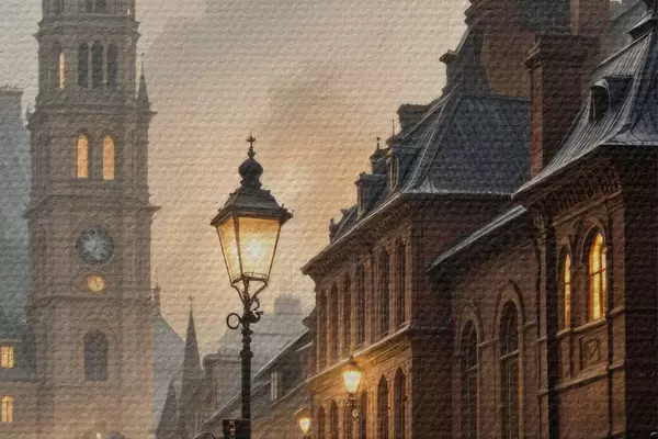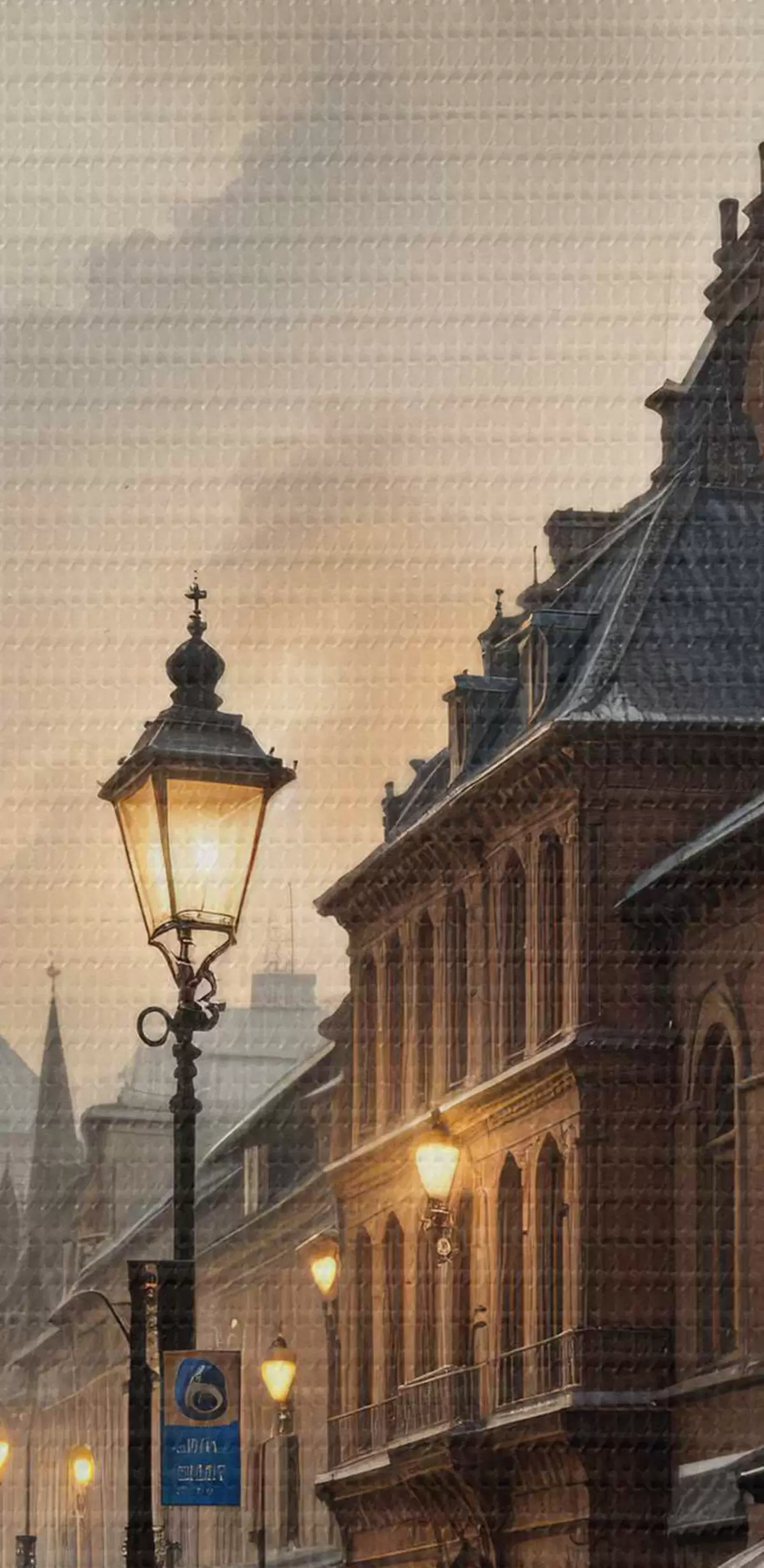 Image Soirée pluvieuse dans une vieille ville européenne, avec des rues pavées, des bâtiments historiques et un tramway qui passe Nr r40604